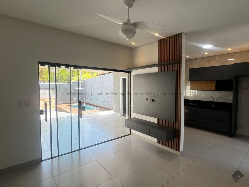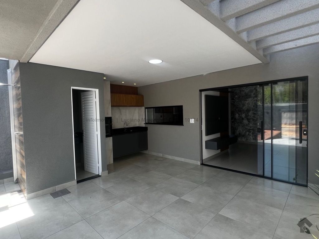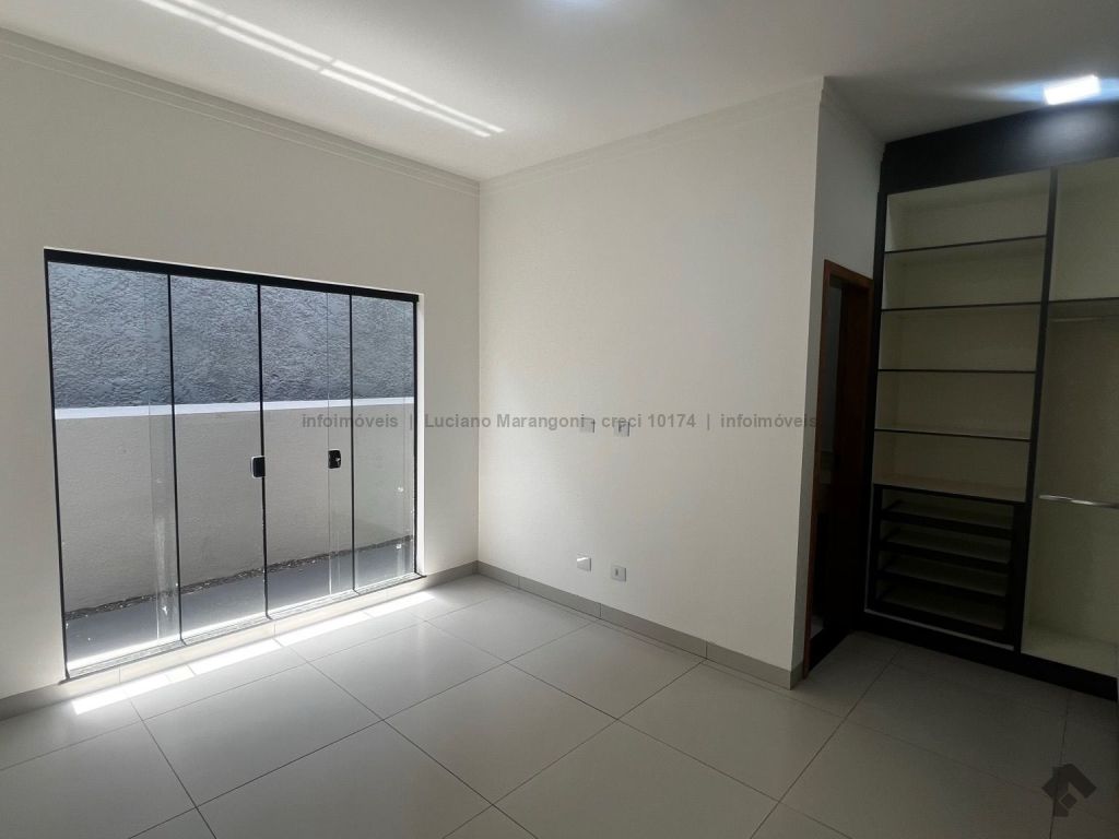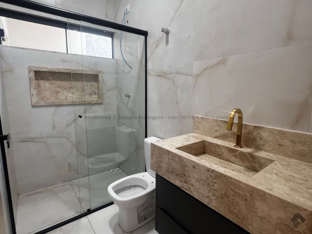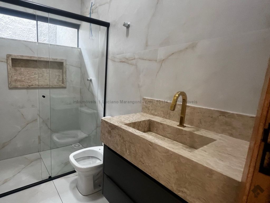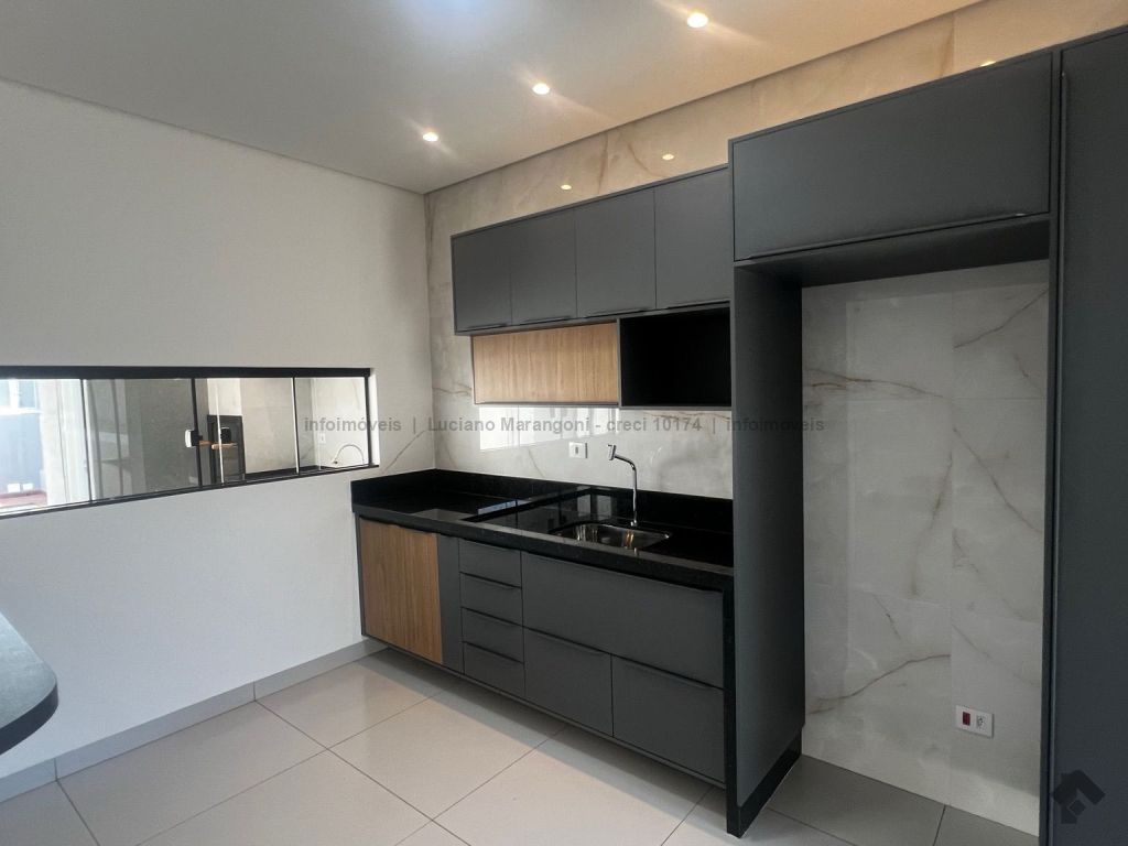 Casa com fino acabamento, três quartos, sendo um suíte, cozinha com móveis planejados, banheiros com box e armários.