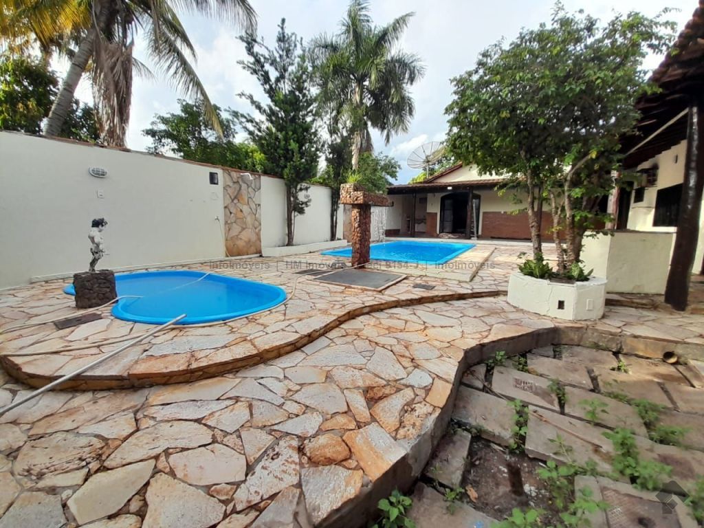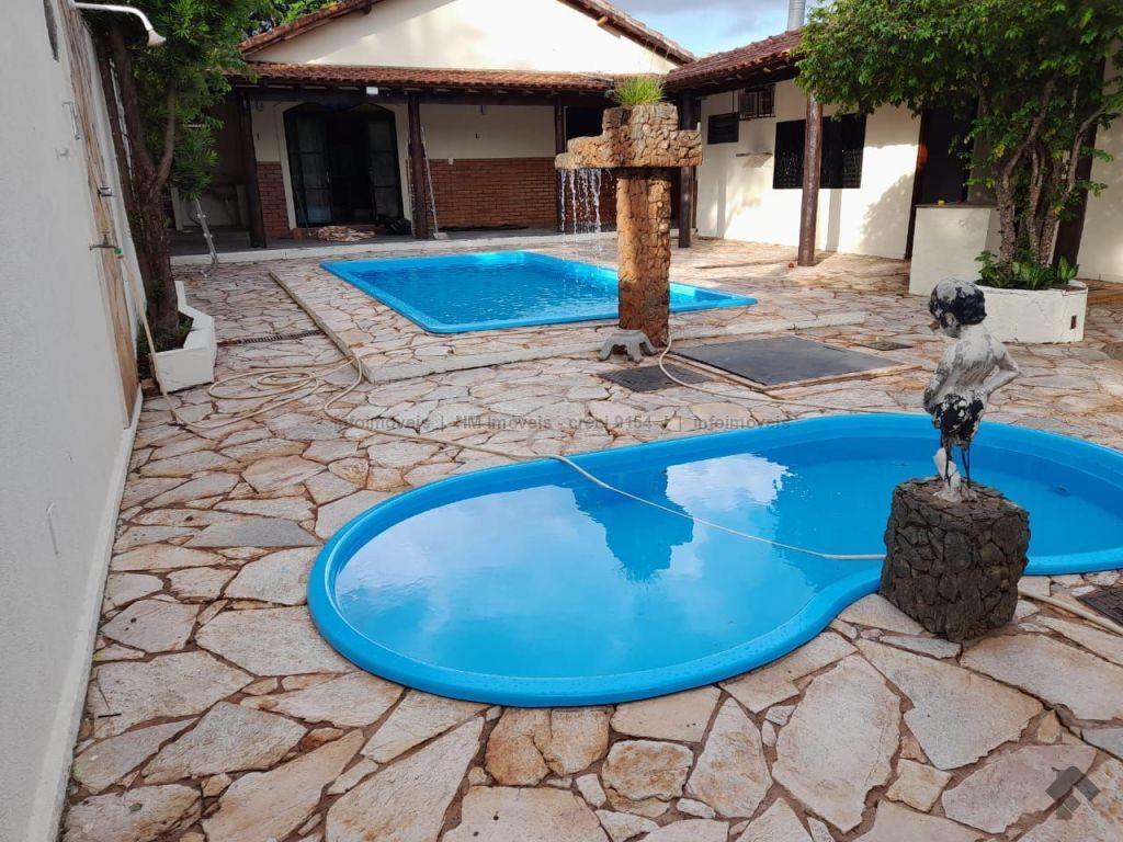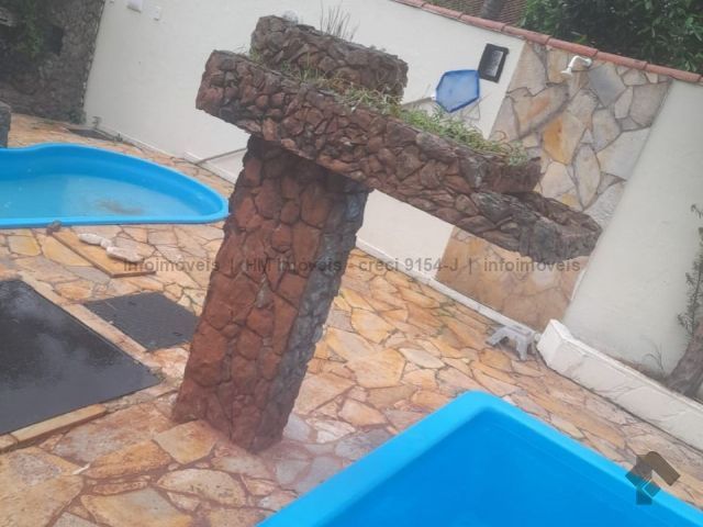 Casa com duas piscinas, cozinha, sala de estar com três ambientes, área de churrasqueira, uma sala de jogos, três apartamentos com armário embutido, dois apartamentos e garagem para três carros.