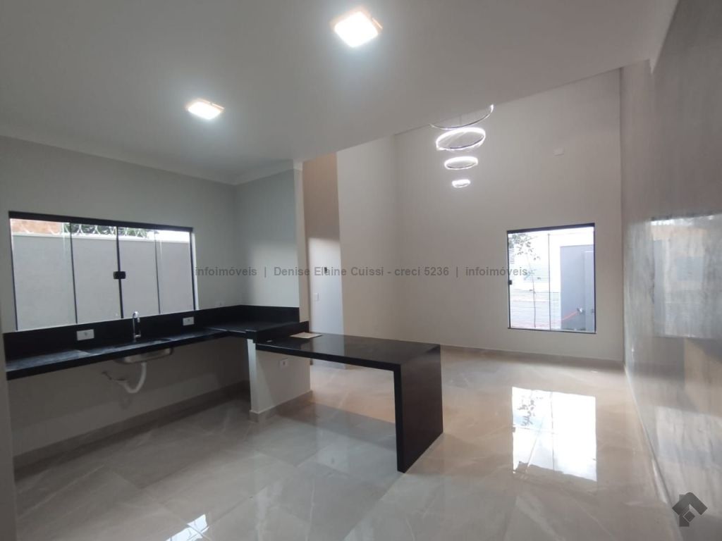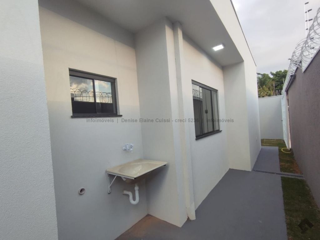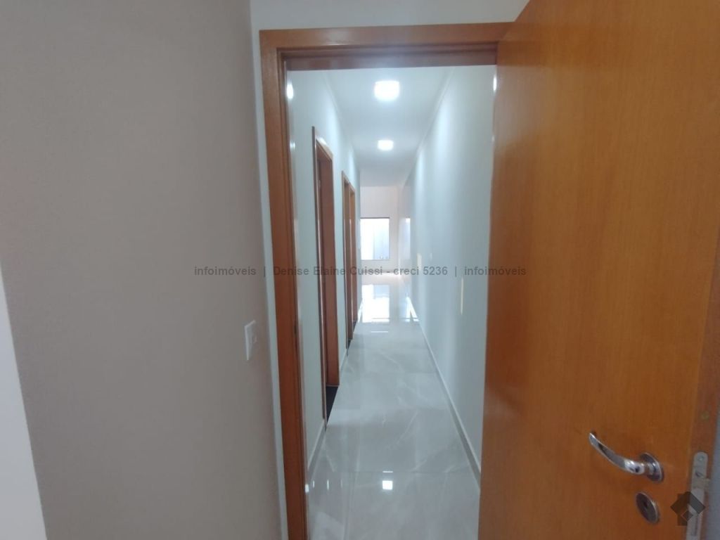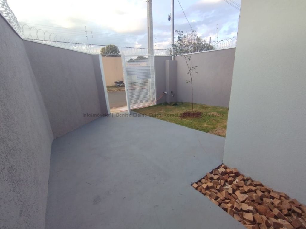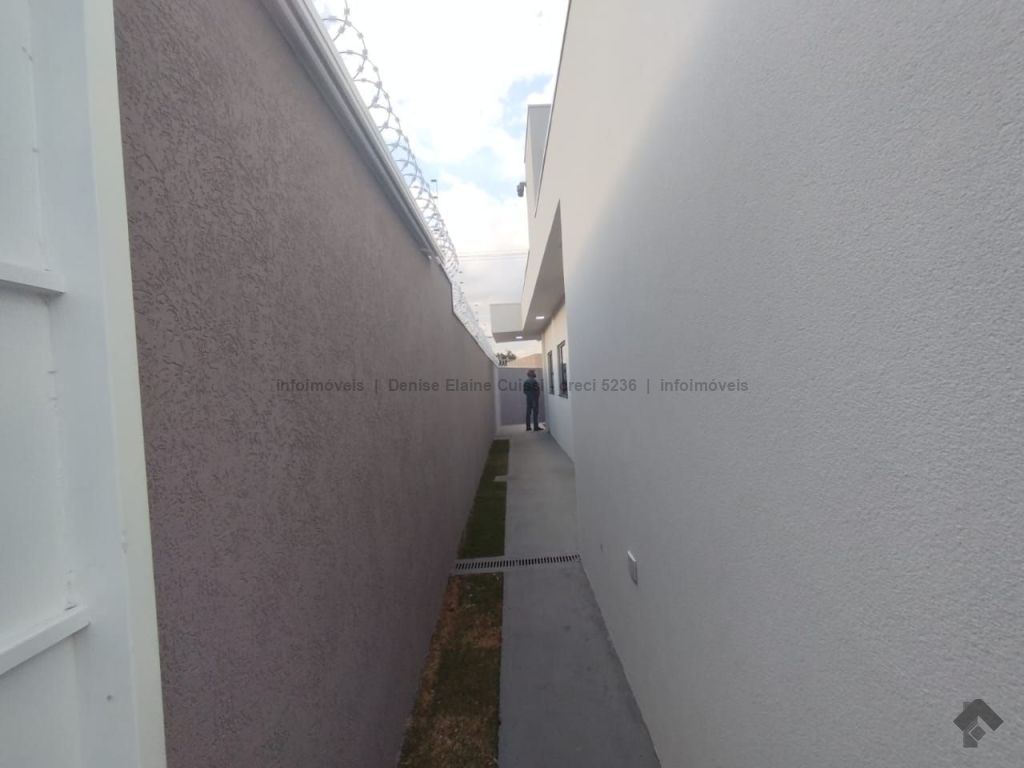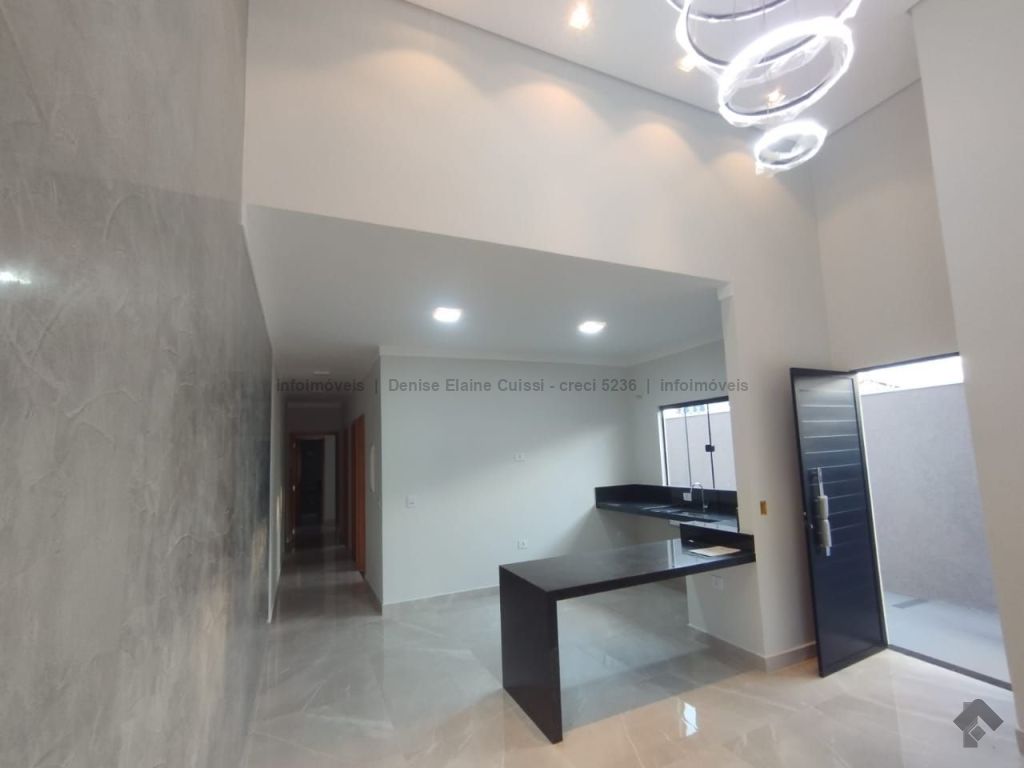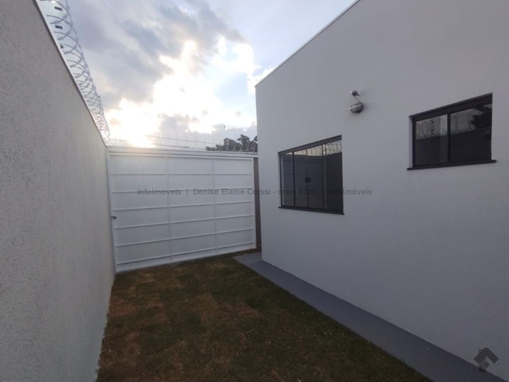Casa térrea, nova, pronta para morar. Iluminação em LED, paisagismo. Três quartos, sendo uma suíte, cozinha americana, sala, banheiro social, área de serviço, corredor lateral, espaço verde na frente e quintal nos fundos. Garagem, portão de elevação, calçada, rua asfaltada.