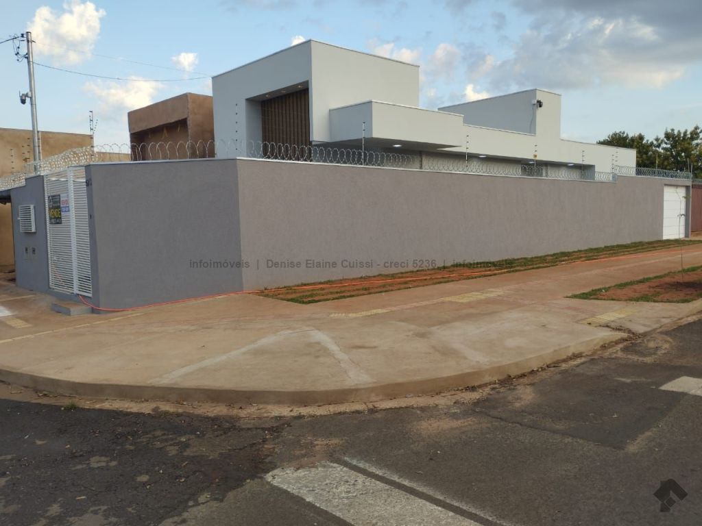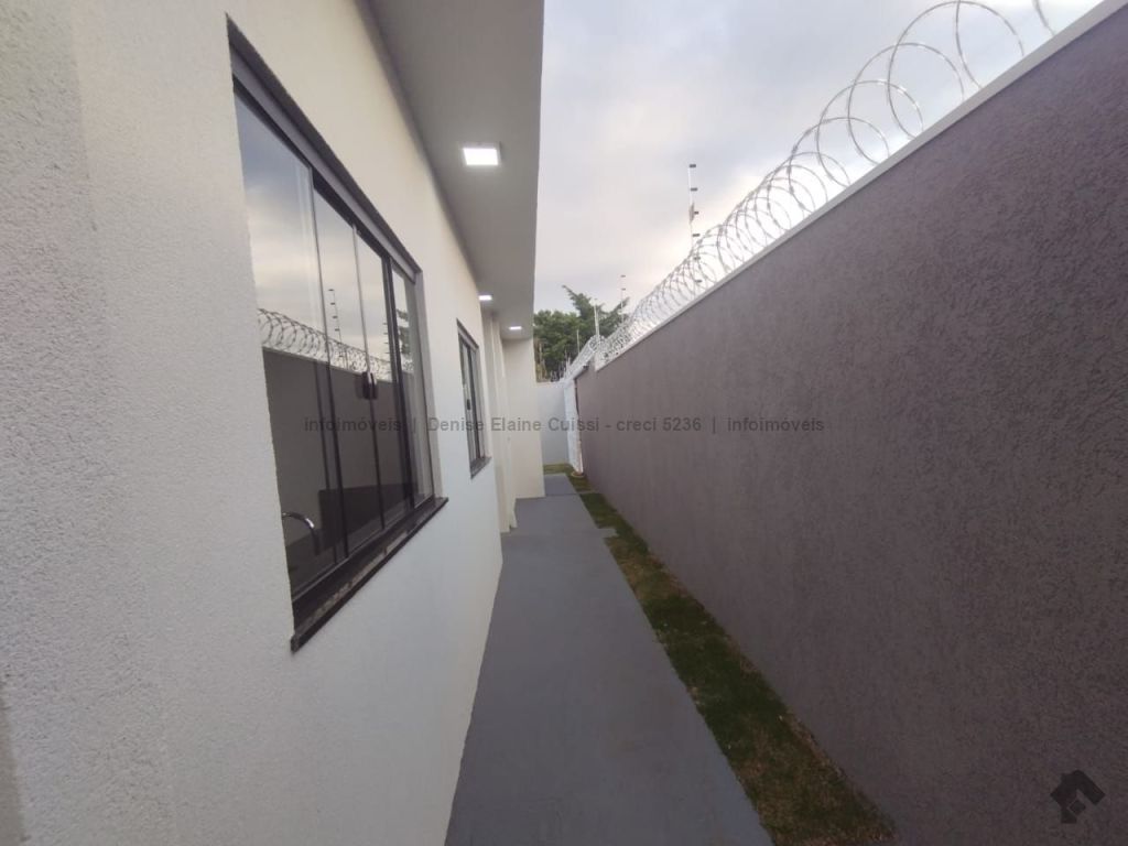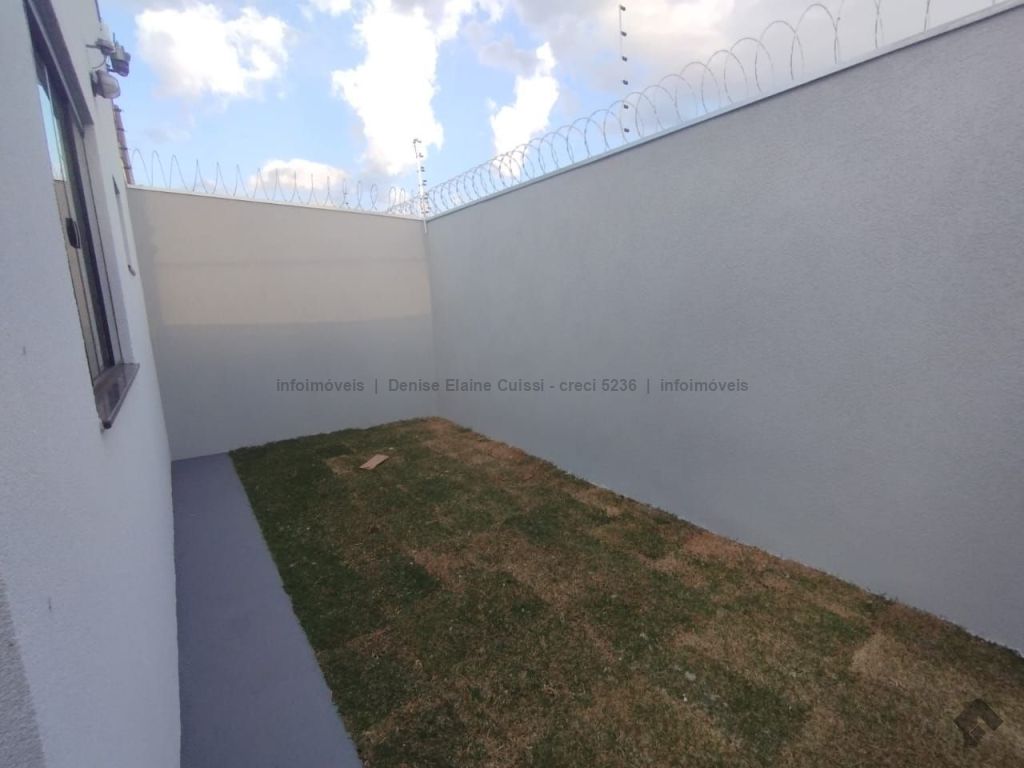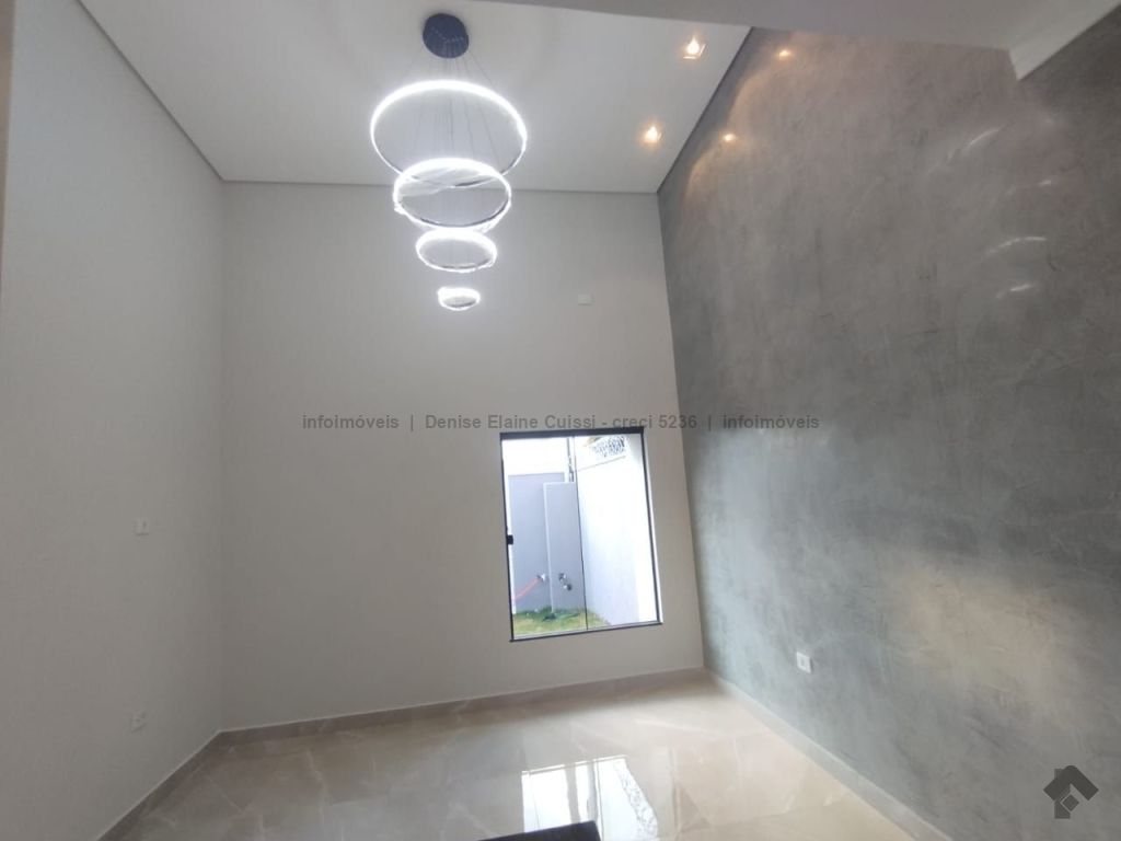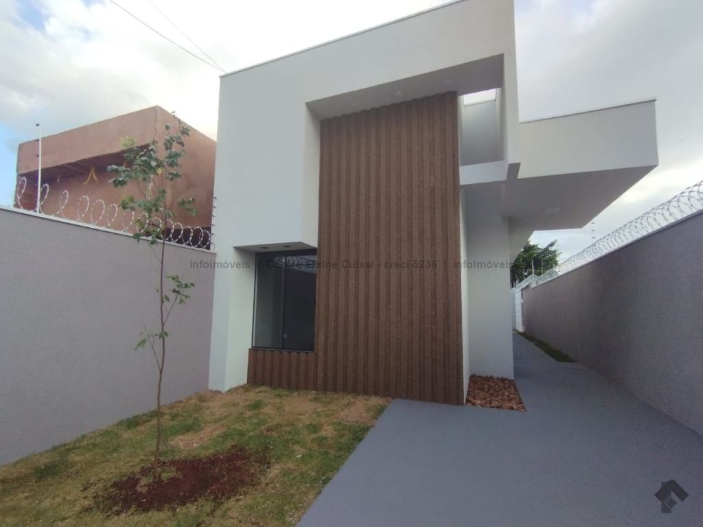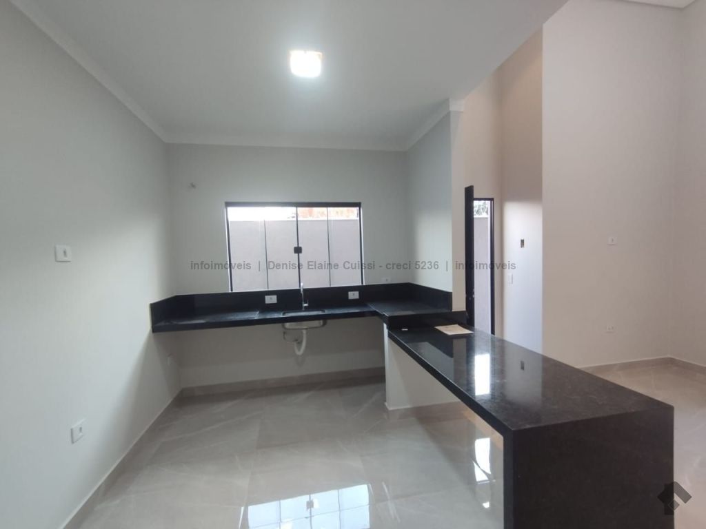 Casa térrea, nova, pronta para morar. Iluminação em LED, paisagismo. Três quartos, sendo uma suíte, cozinha americana, sala, banheiro social, área de serviço, corredor lateral, espaço verde na frente e quintal nos fundos. Garagem, portão de elevação, calçada, rua asfaltada.
