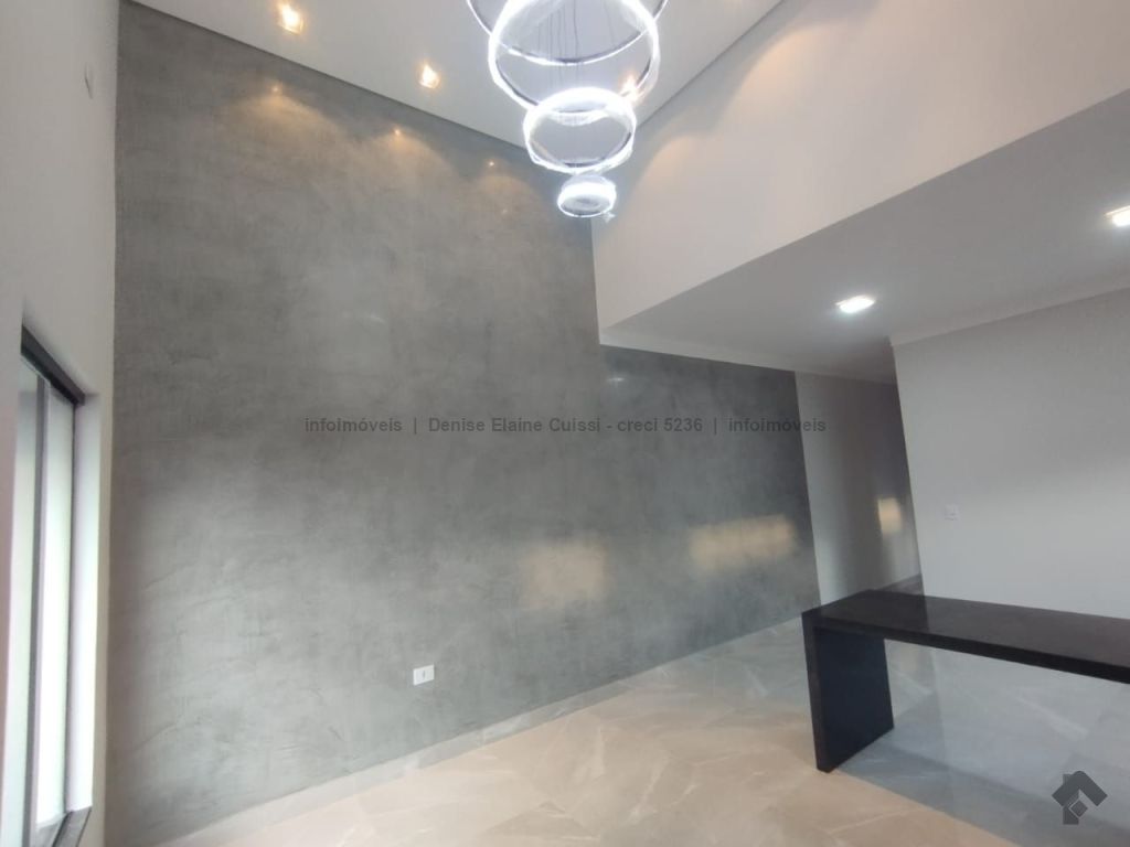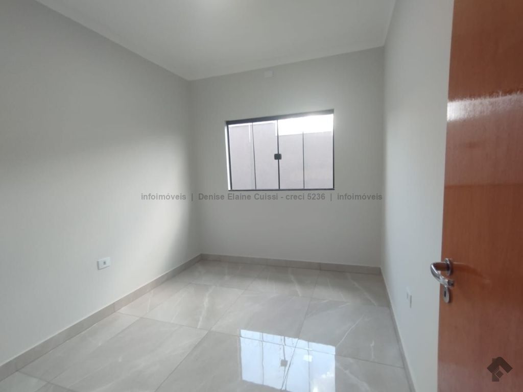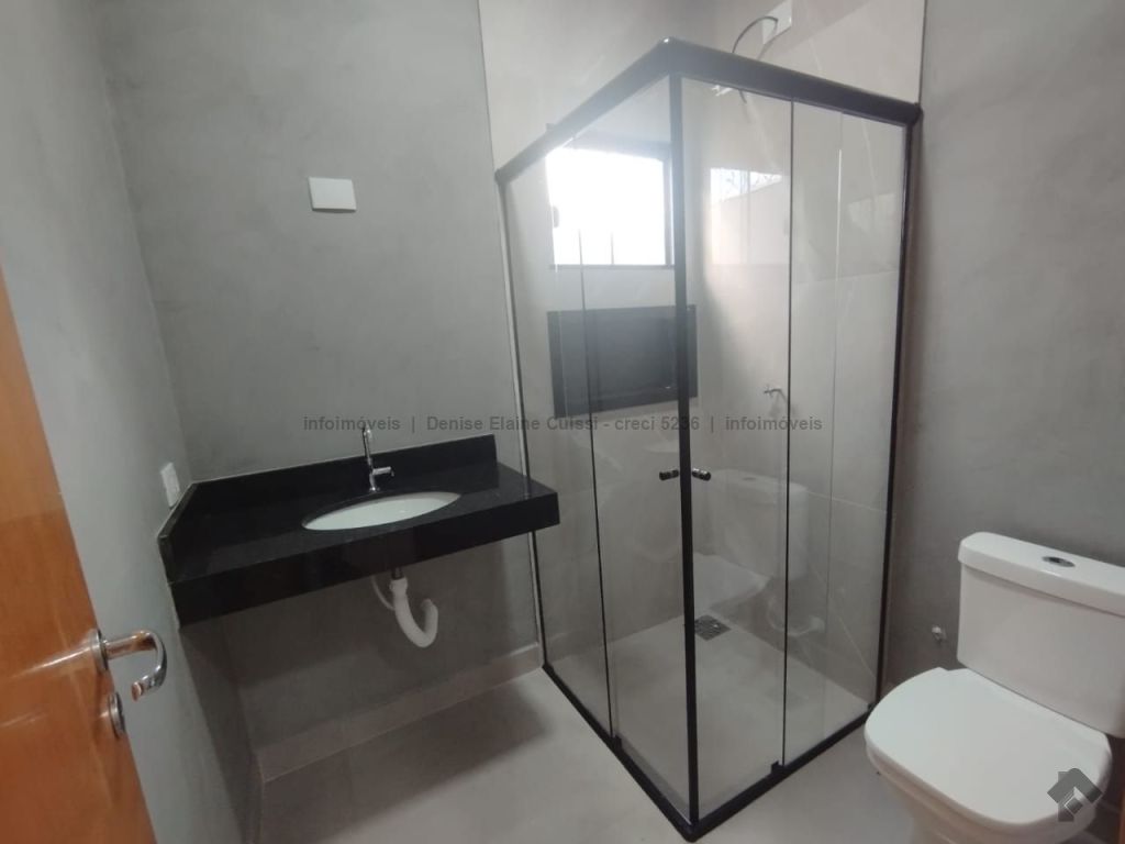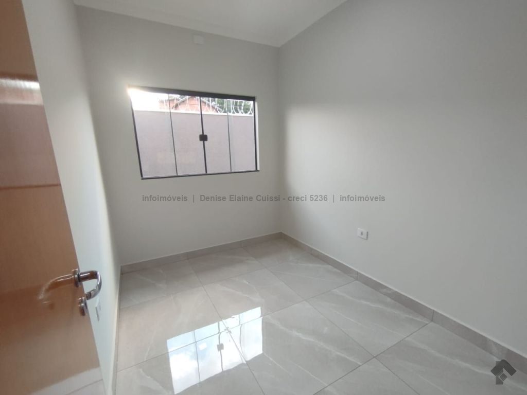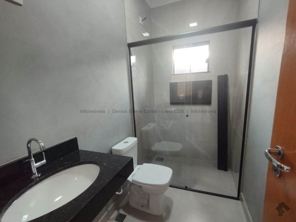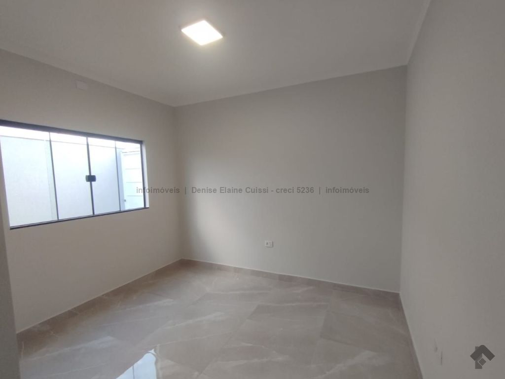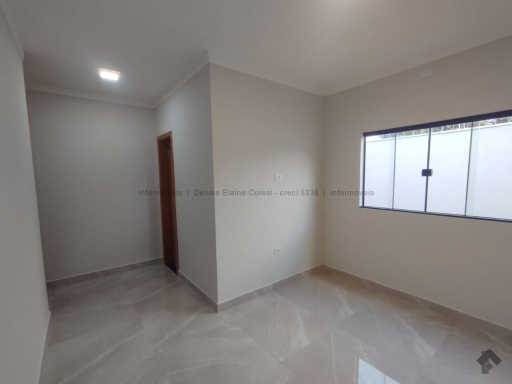 Casa térrea, nova, pronta para morar. Iluminação em LED, paisagismo. Três quartos, sendo uma suíte, cozinha americana, sala, banheiro social, área de serviço, corredor lateral, espaço verde na frente e quintal nos fundos. Garagem, portão de elevação, calçada, rua asfaltada.