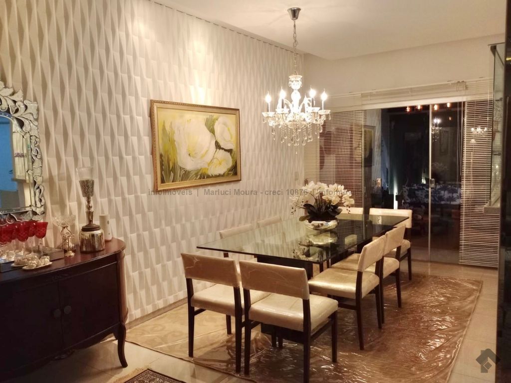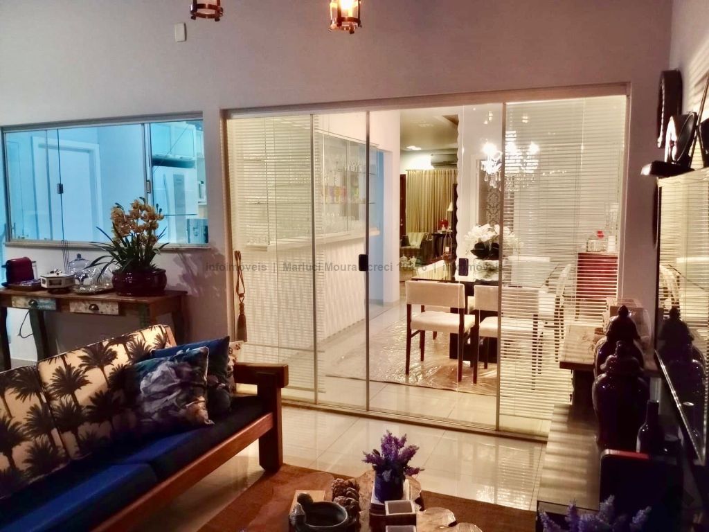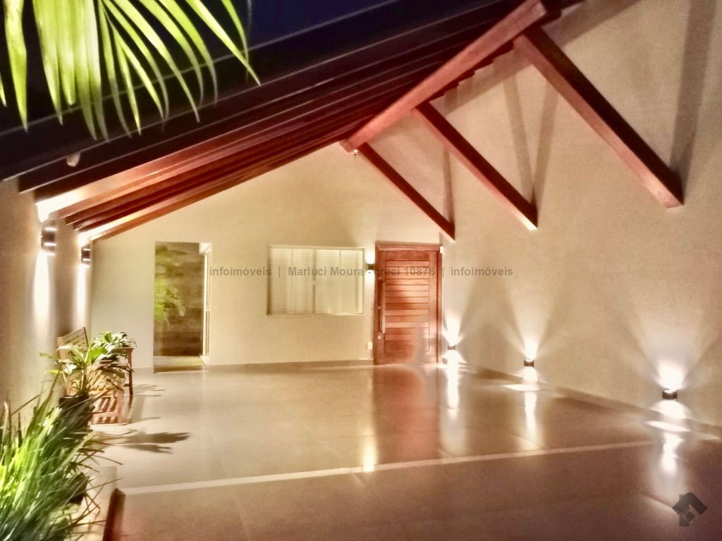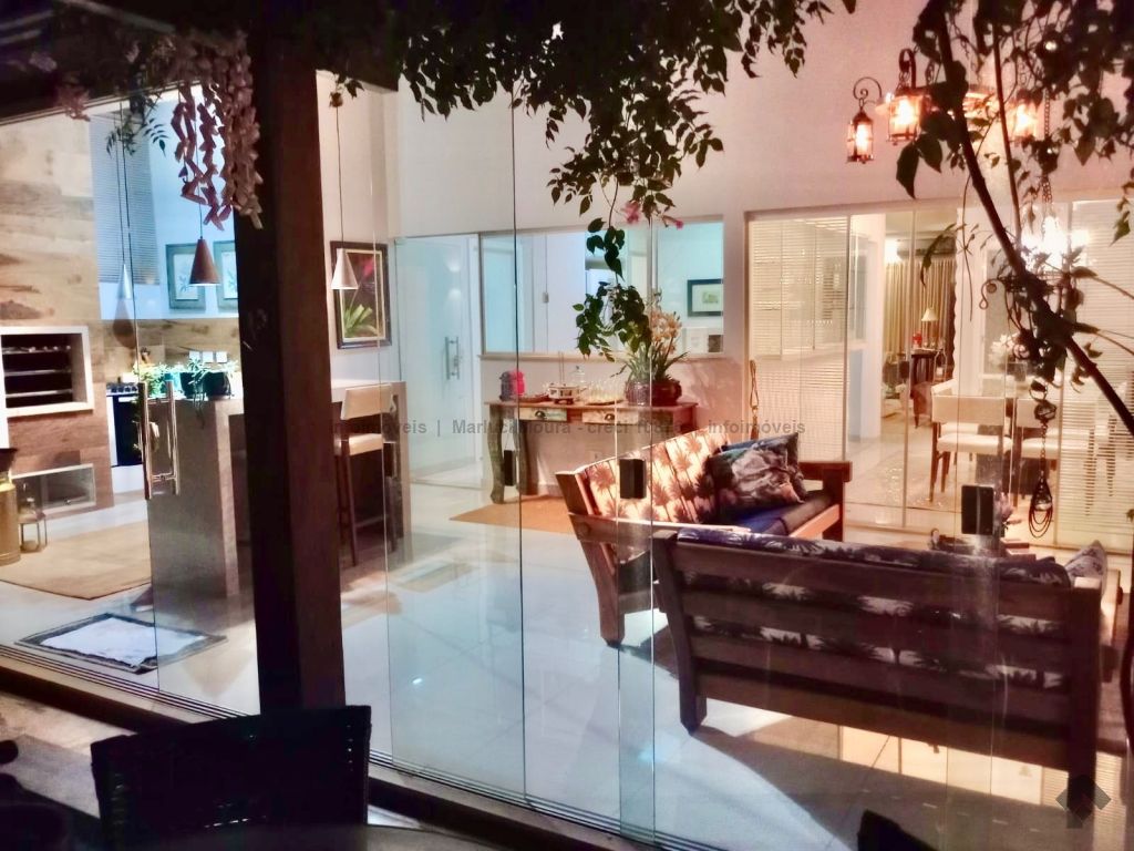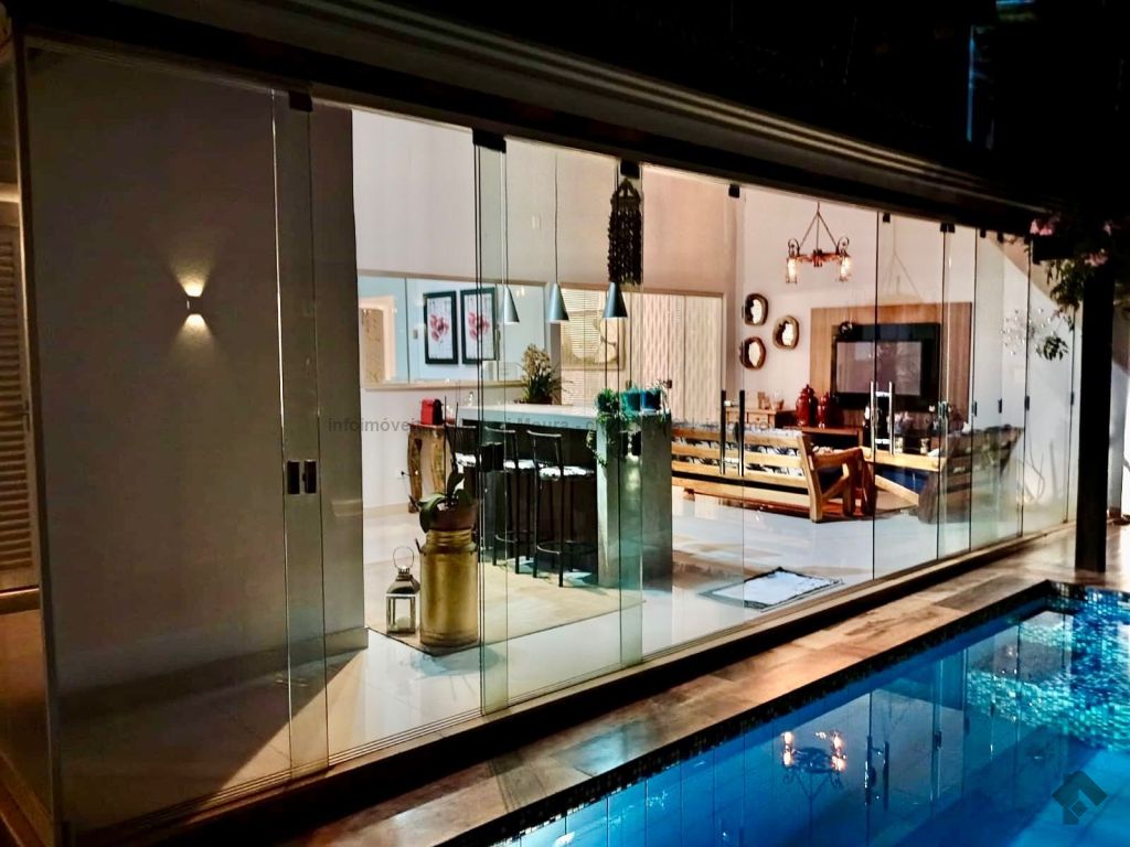 A casa dispõe de nove placas de energia, três suítes, sendo uma com banheira de hidromassagem, armários embutidos por toda a casa, espelhos, iluminação agradável e pendentes, um lavabo, cozinha com armários, salas amplas, área externa e gourmet com churrasqueira e vista para a piscina protegida por portas de vidro, um gazebo com plantas, jardinagem e bela iluminação, garagem para quatro veículos, corredor e muito bom gosto.