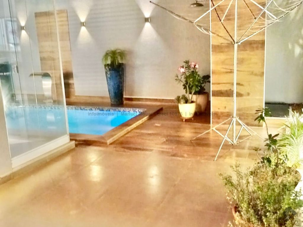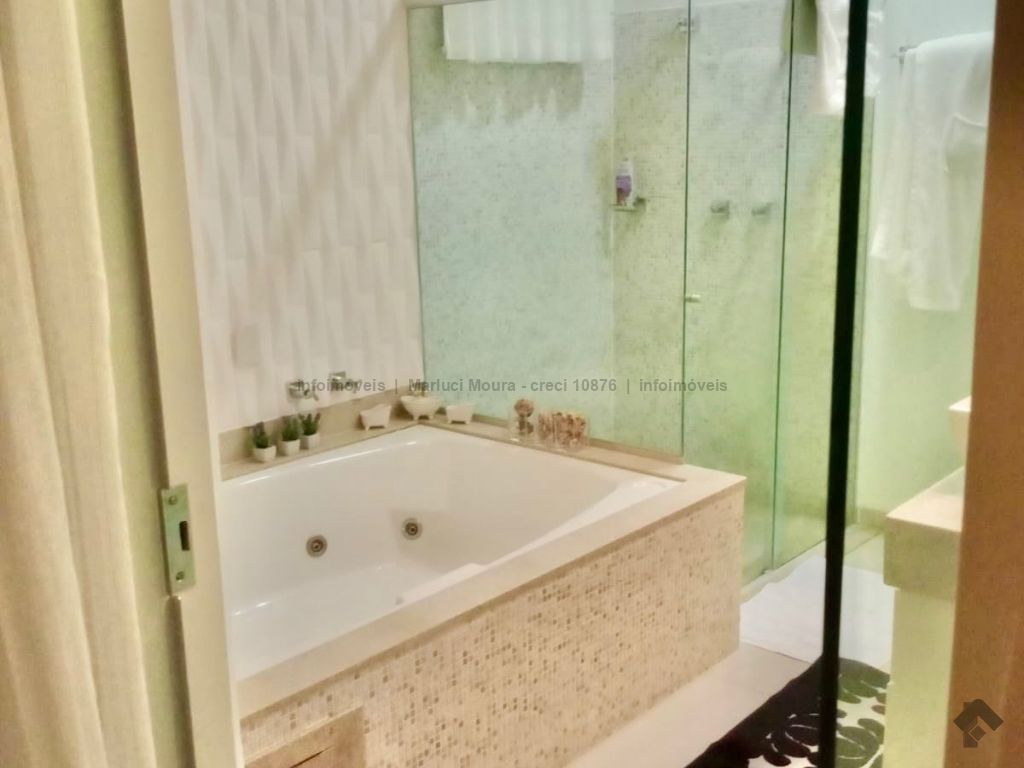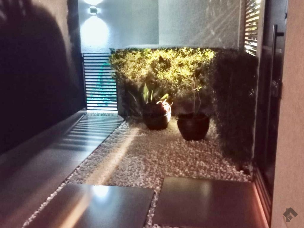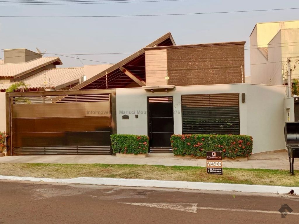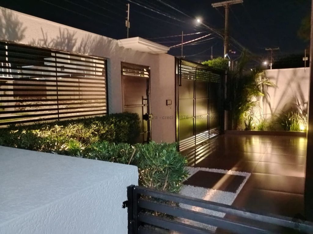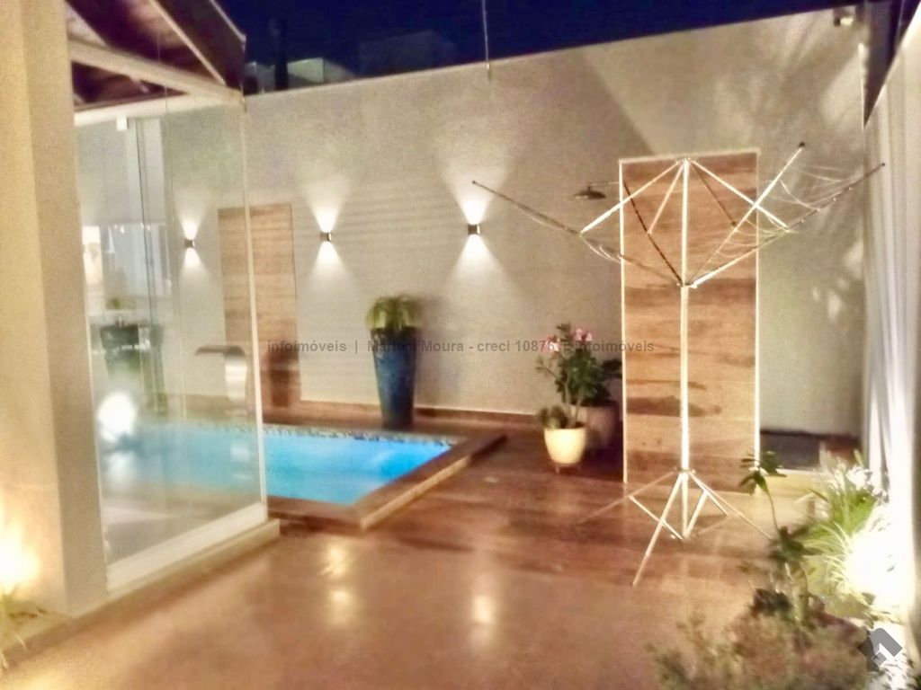 A casa dispõe de nove placas de energia, três suítes, sendo uma com banheira de hidromassagem, armários embutidos por toda a casa, espelhos, iluminação agradável e pendentes, um lavabo, cozinha com armários, salas amplas, área externa e gourmet com churrasqueira e vista para a piscina protegida por portas de vidro, um gazebo com plantas, jardinagem e bela iluminação, garagem para quatro veículos, corredor e muito bom gosto.