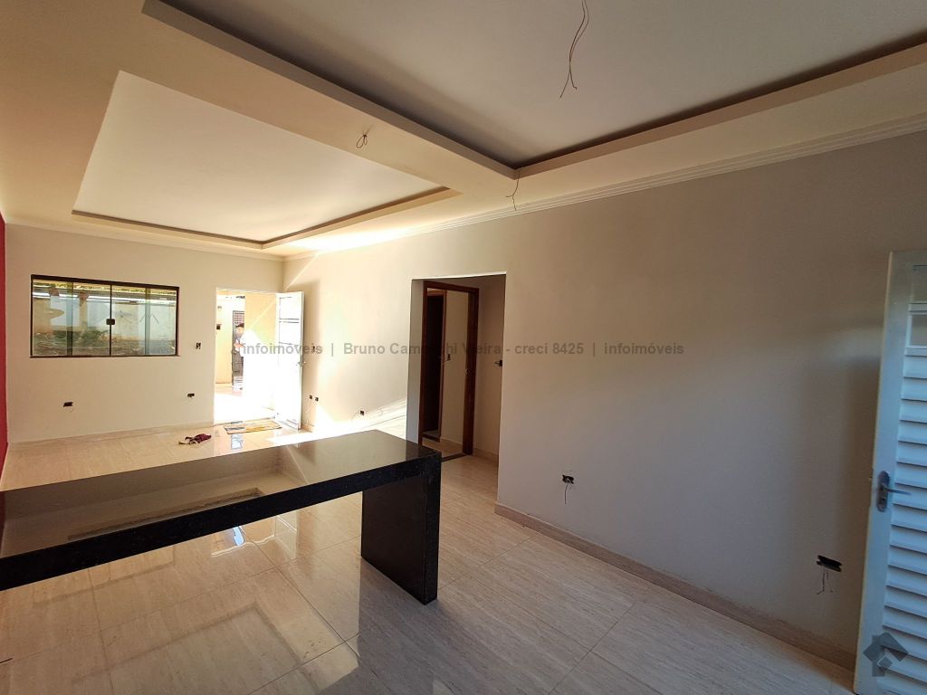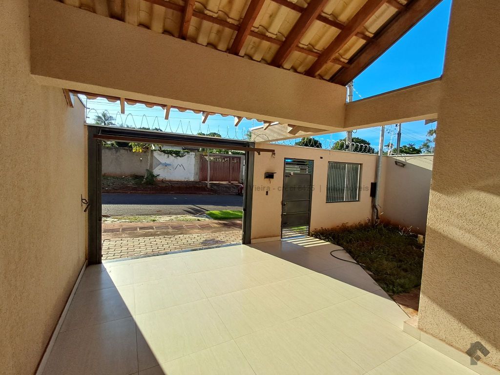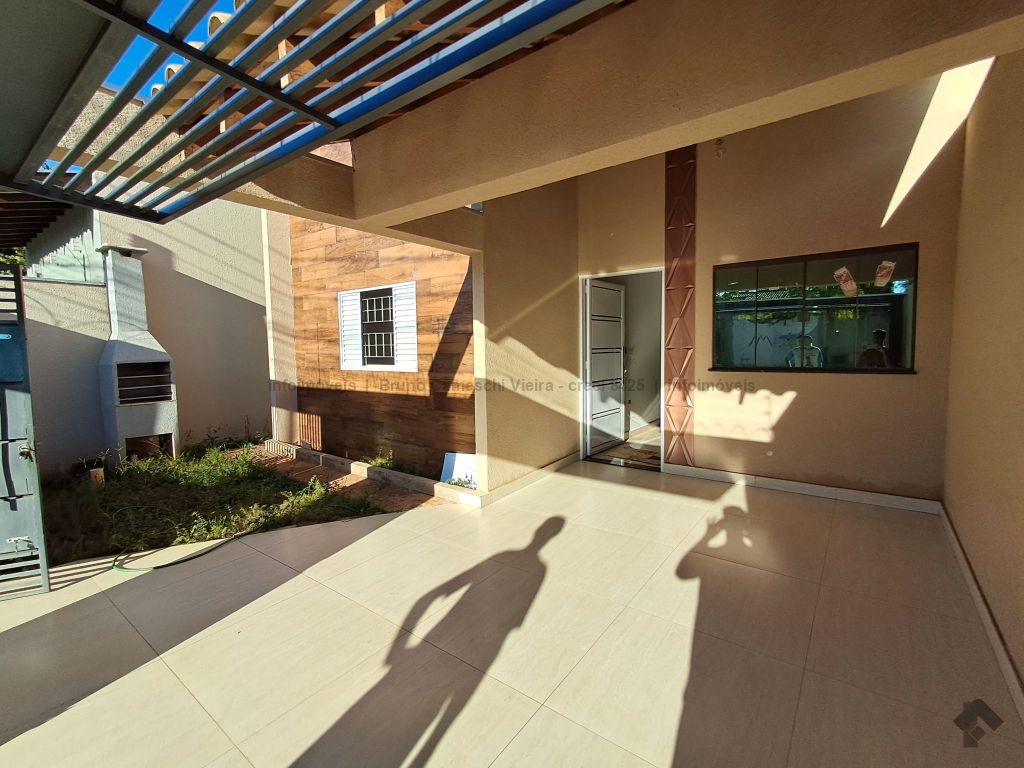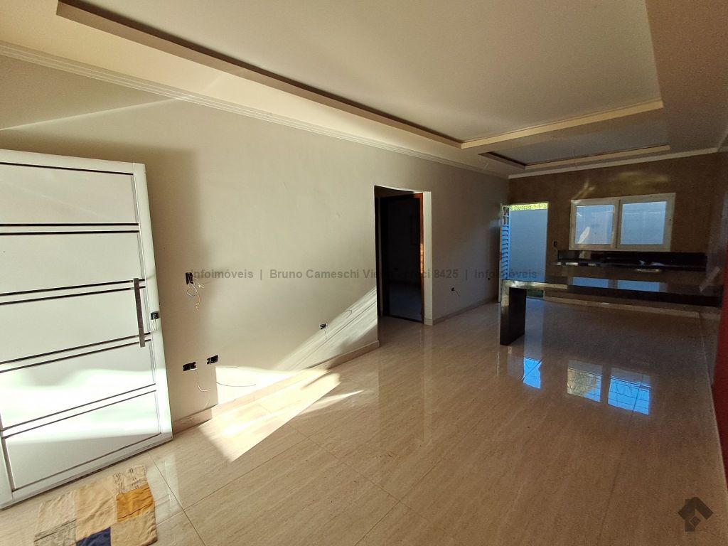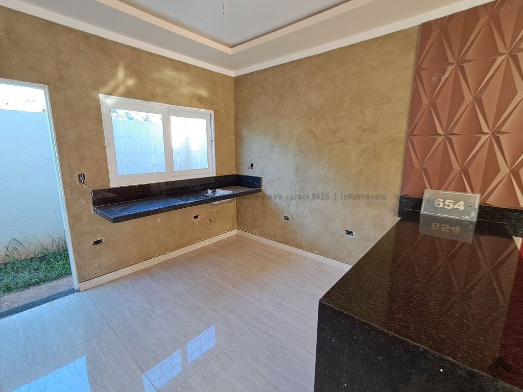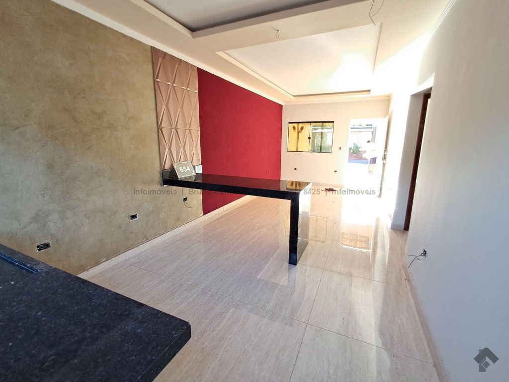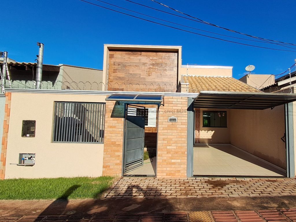 Casa de dois quartos, sendo um deles suíte, WC social, sala ampla, cozinha, garagem para um carro, com churrasqueira nos fundos.