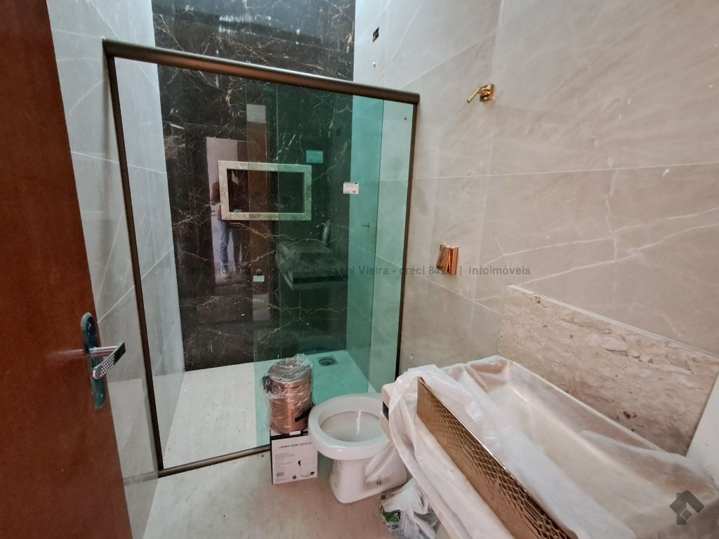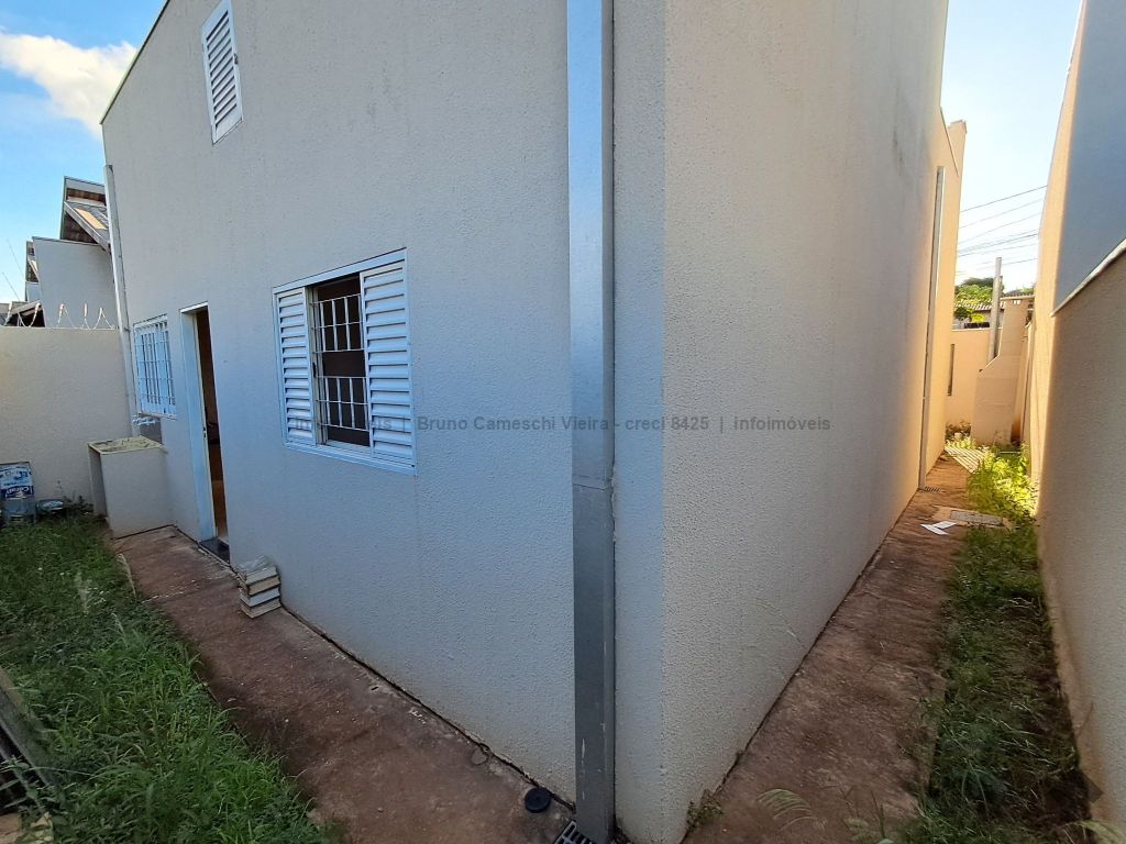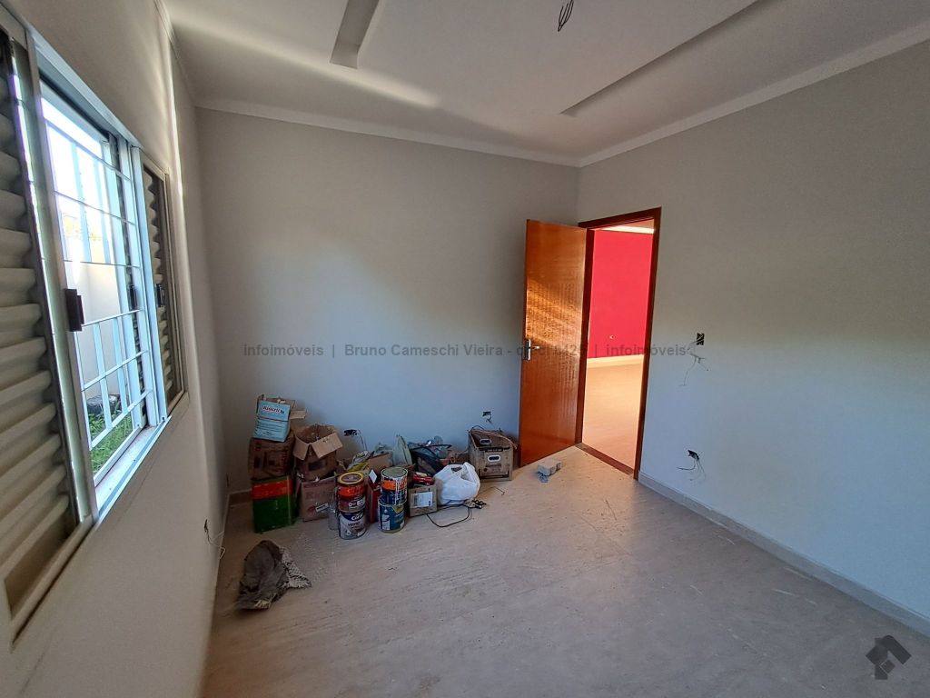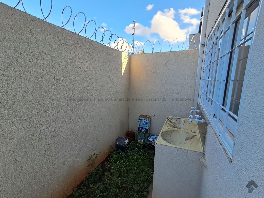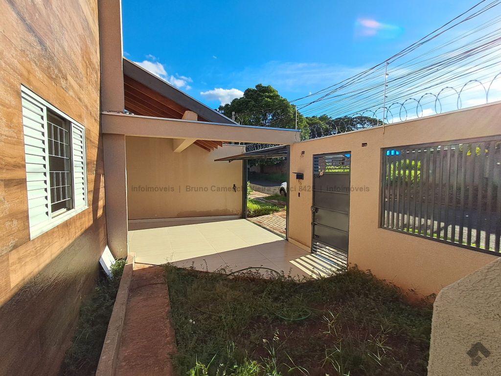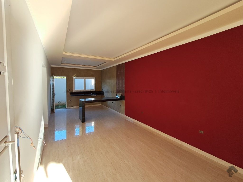 Casa de dois quartos, sendo um deles suíte, WC social, sala ampla, cozinha, garagem para um carro, com churrasqueira nos fundos.