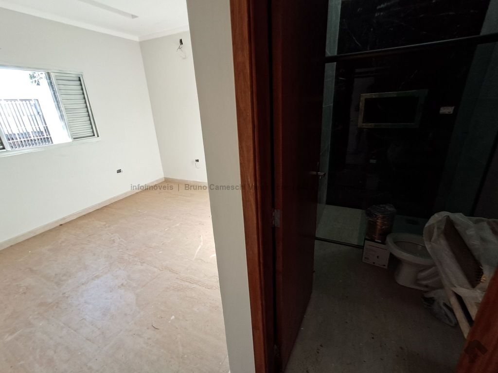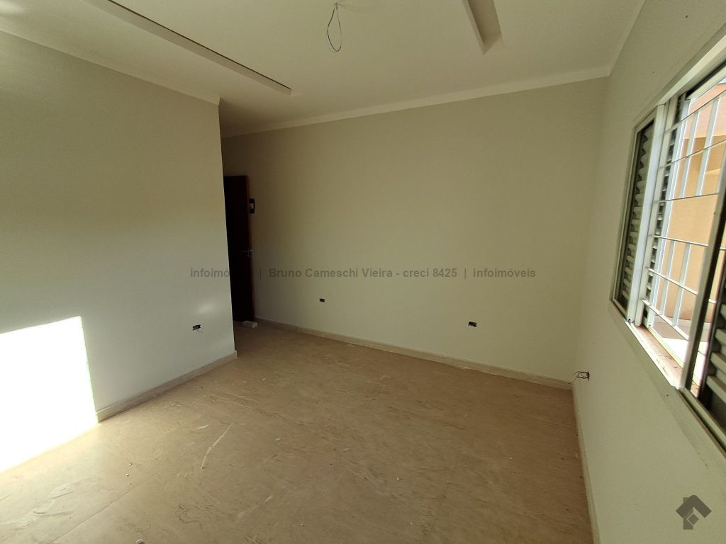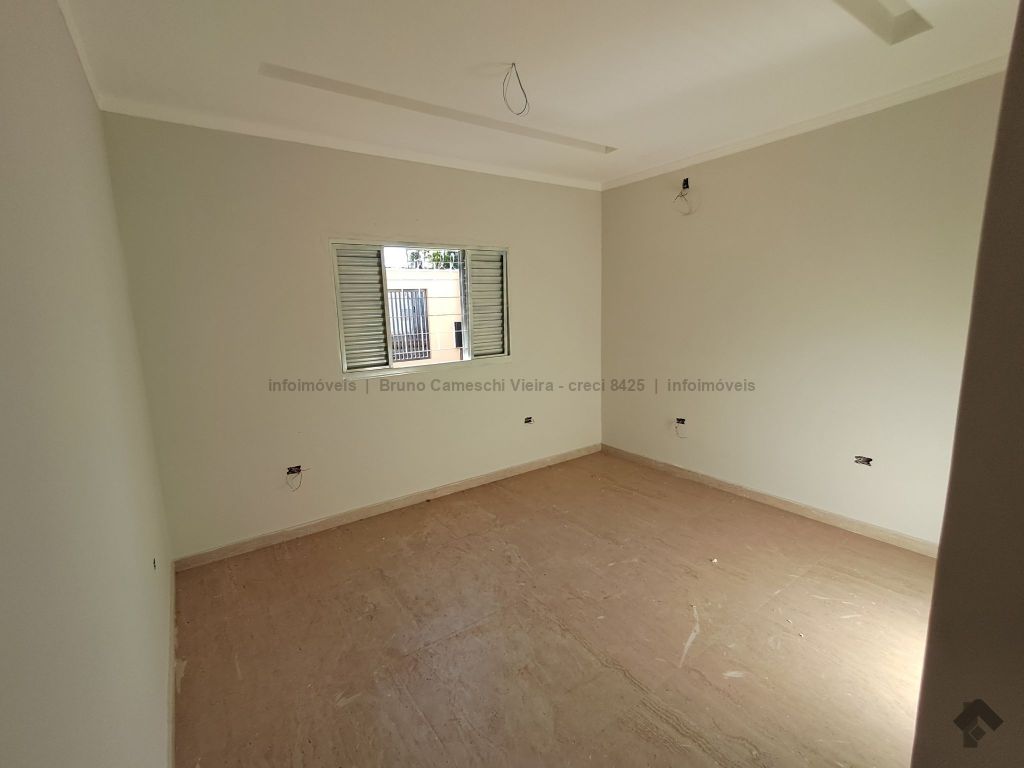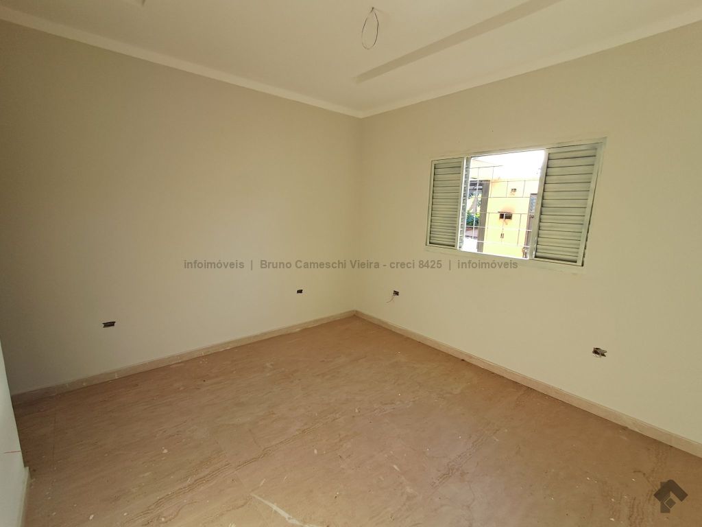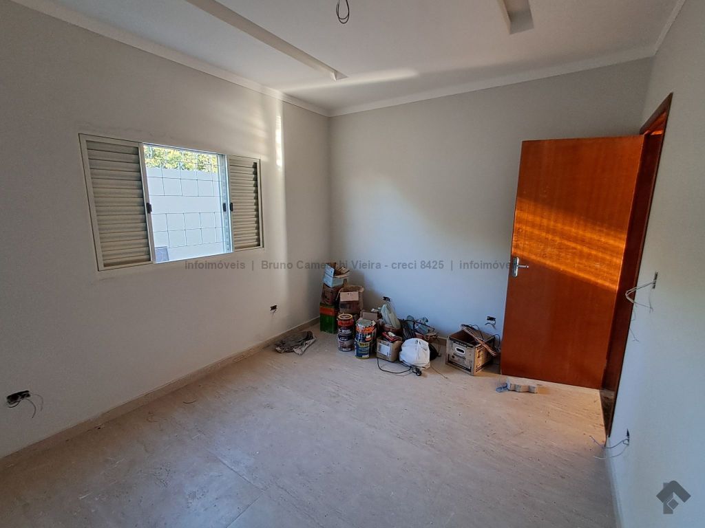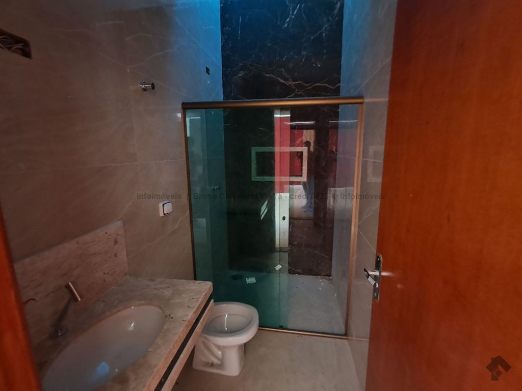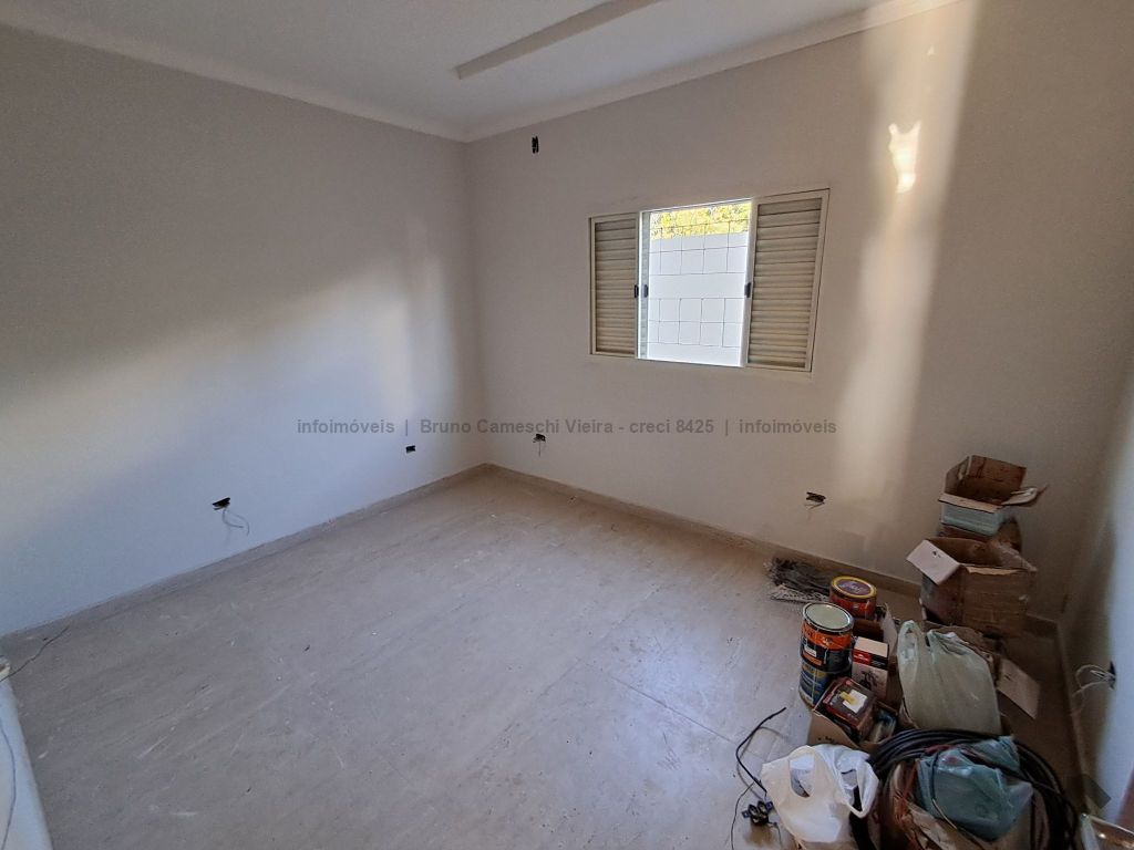Casa de dois quartos, sendo um deles suíte, WC social, sala ampla, cozinha, garagem para um carro, com churrasqueira nos fundos.