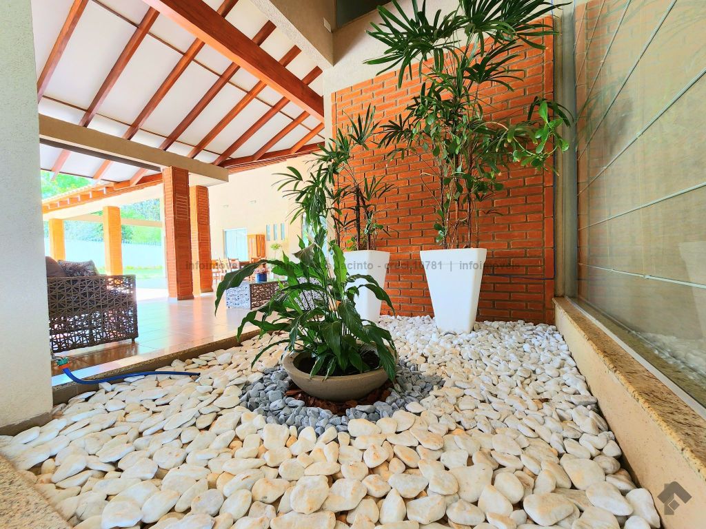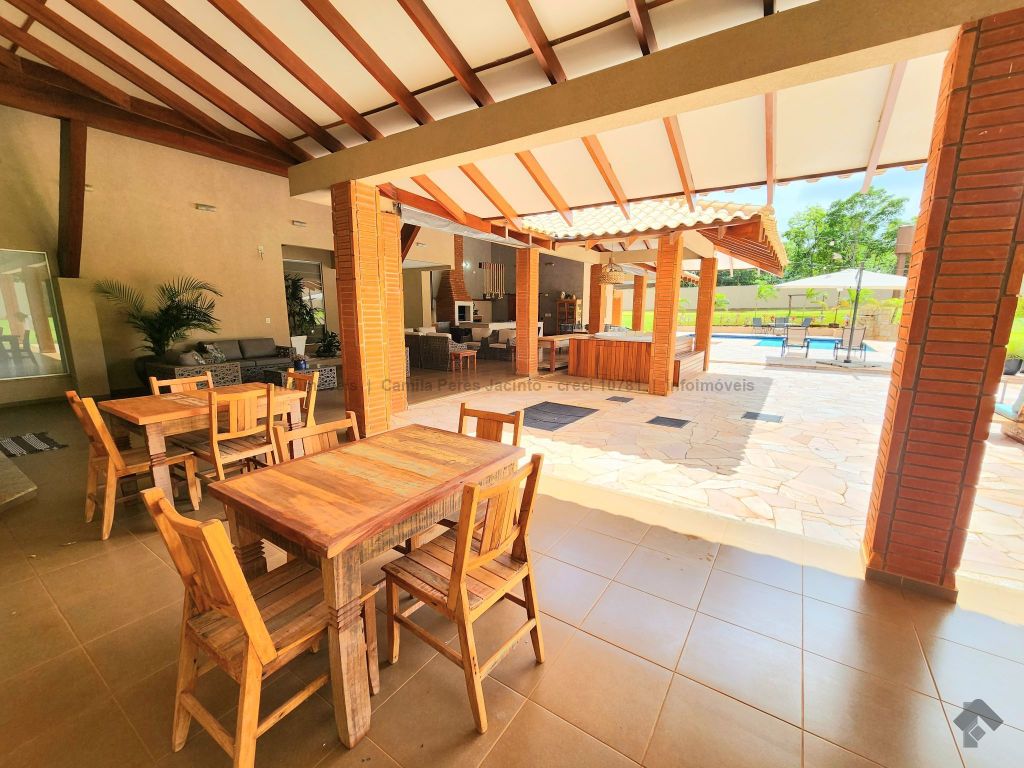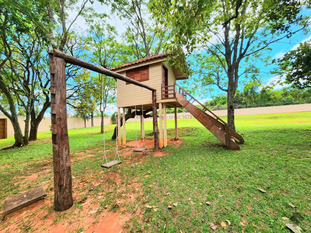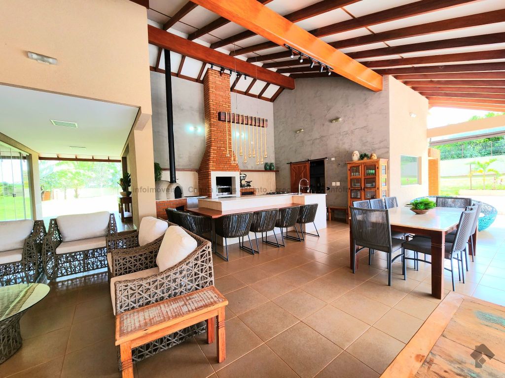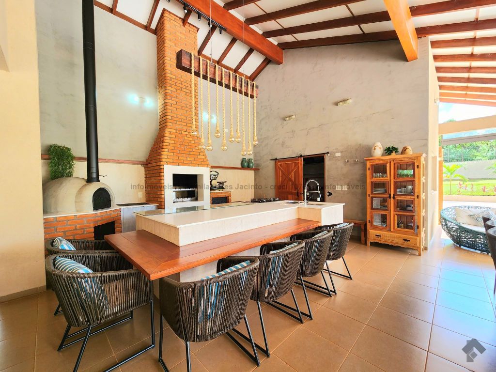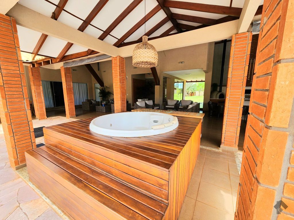 Uma suíte master com hidromassagem, duas suítes com hidromassagem, três suítes sendo duas para hóspedes, home theater, sala de jantar, sala de visitas, sala de TV, biblioteca, lareira, escritório, cozinha, despensa, área de serviço coberta, 2 banheiros, lavabo, sala de jogos, sauna, spa, toda avarandada, espaço gourmet completo com churrasqueira, fogão e forno a lenha, forno de pizza, câmara fria, bancada, ilha, despensa, fogão e forno embutido, piscina aquecida com cascata, aquecimento solar, campo de futebol, poço artesiano, garagem coberta para 6 carros, rica em madeira, armário em todos os cômodos, louças e metais Deca. Porcelanato tipo A retificado, toda murada, cerca elétrica e concertina.