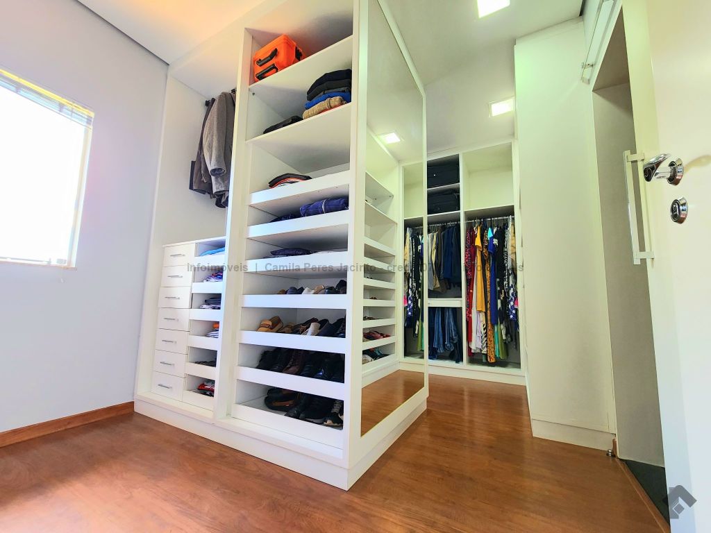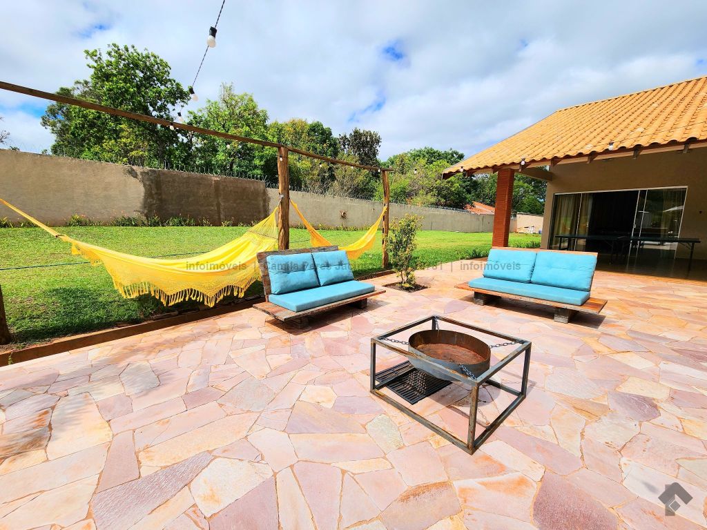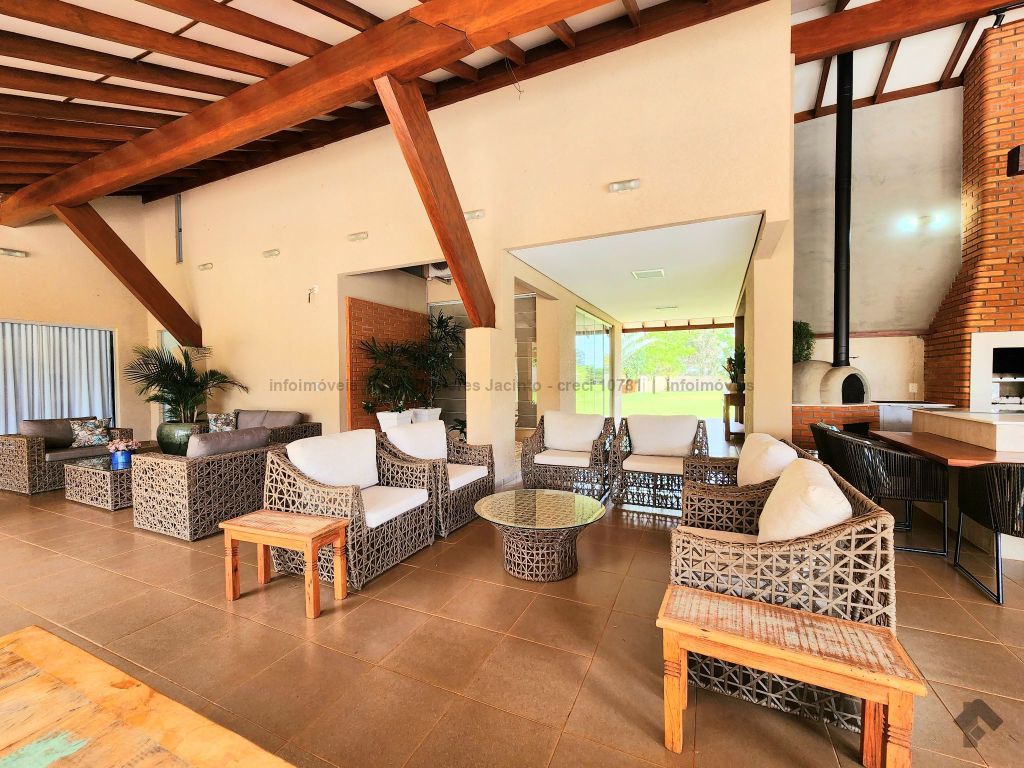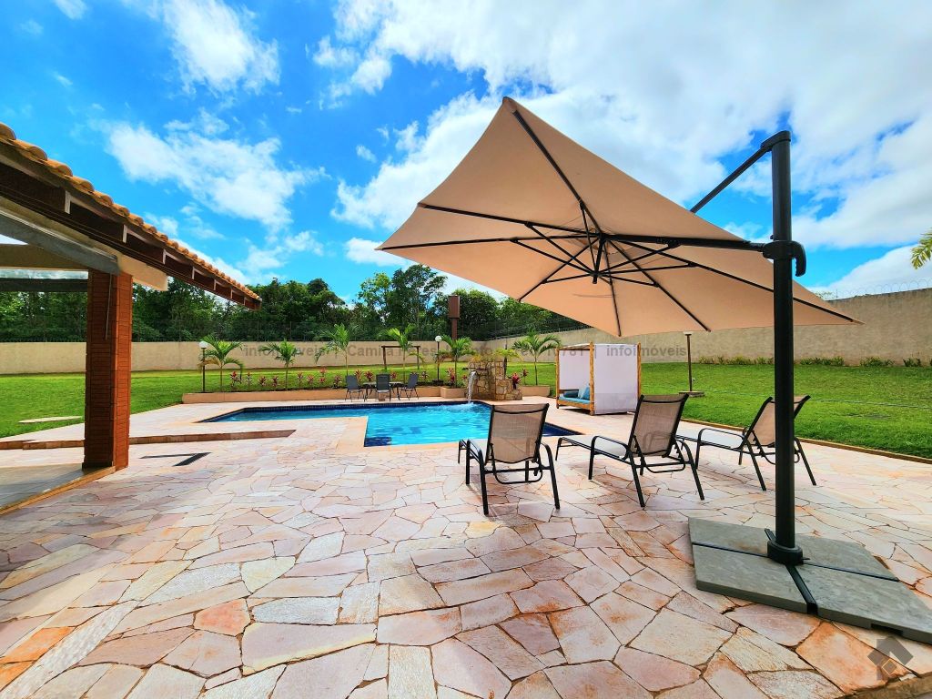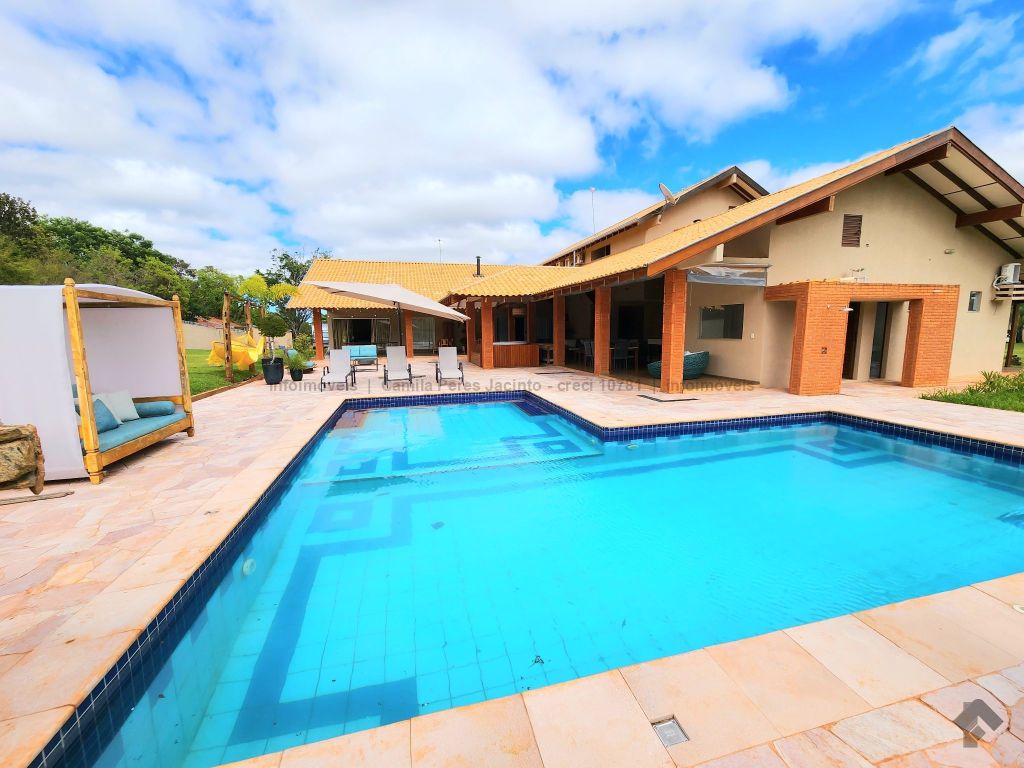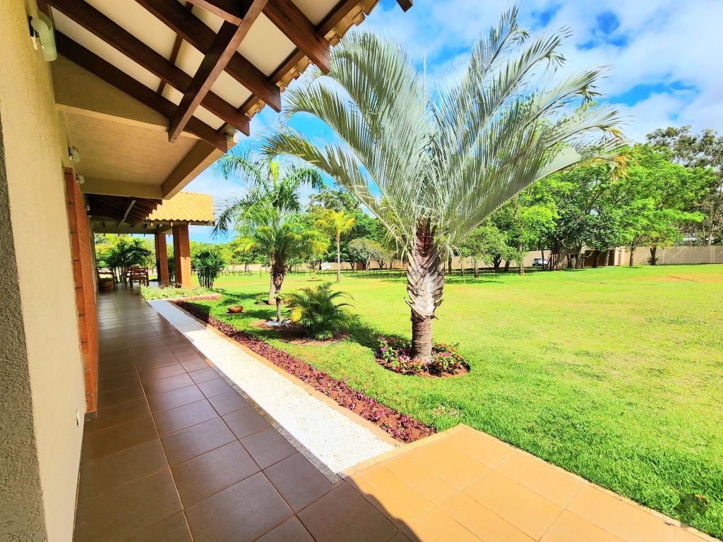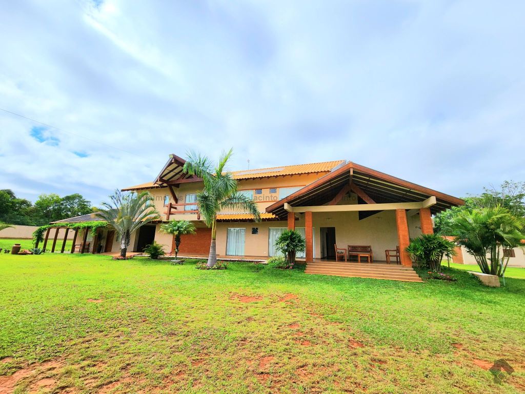 Uma suíte master com hidromassagem, duas suítes com hidromassagem, três suítes sendo duas para hóspedes, home theater, sala de jantar, sala de visitas, sala de TV, biblioteca, lareira, escritório, cozinha, despensa, área de serviço coberta, 2 banheiros, lavabo, sala de jogos, sauna, spa, toda avarandada, espaço gourmet completo com churrasqueira, fogão e forno a lenha, forno de pizza, câmara fria, bancada, ilha, despensa, fogão e forno embutido, piscina aquecida com cascata, aquecimento solar, campo de futebol, poço artesiano, garagem coberta para 6 carros, rica em madeira, armário em todos os cômodos, louças e metais Deca. Porcelanato tipo A retificado, toda murada, cerca elétrica e concertina.