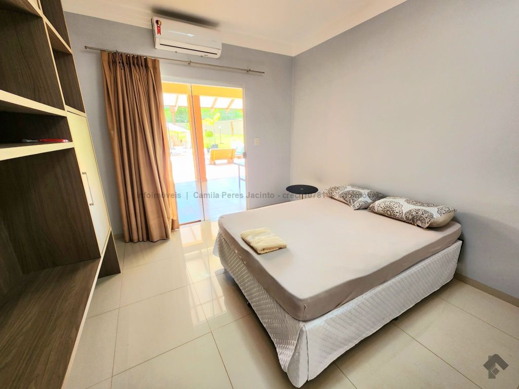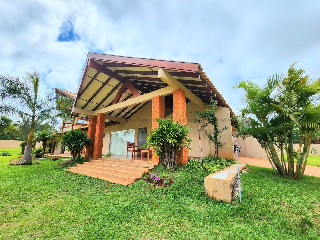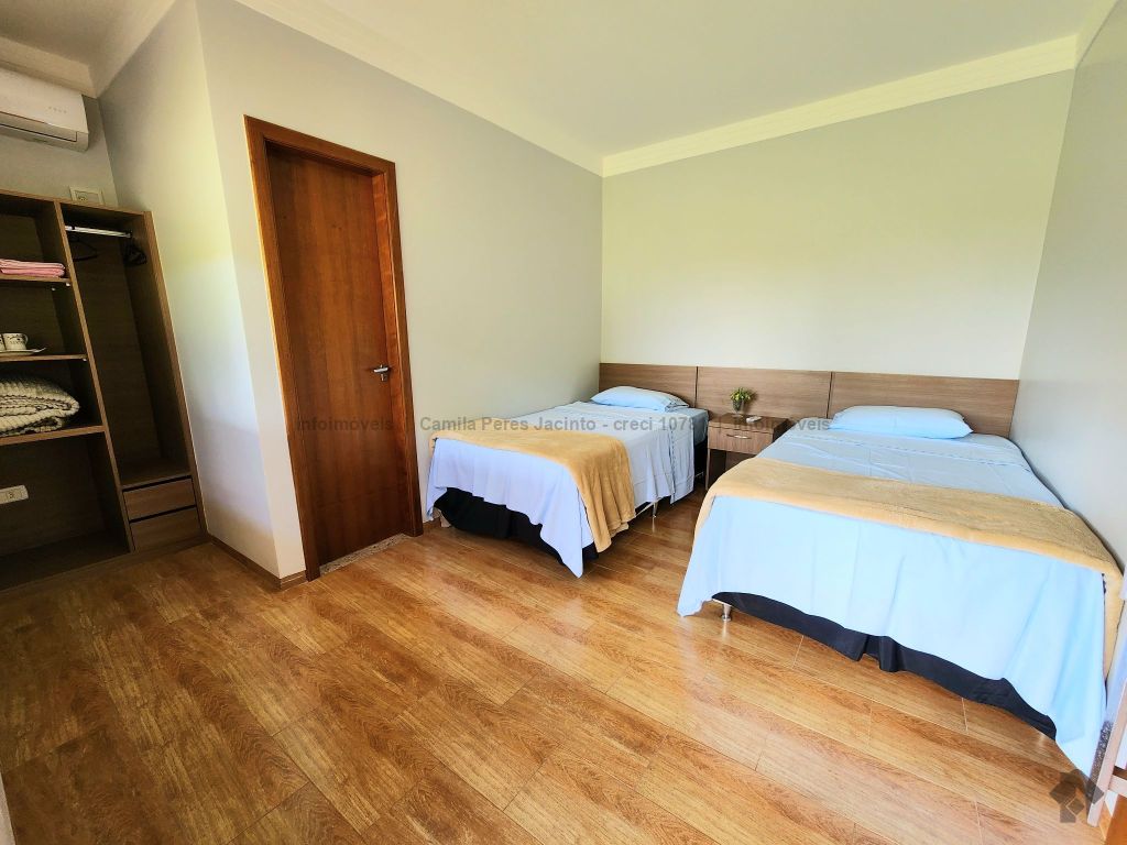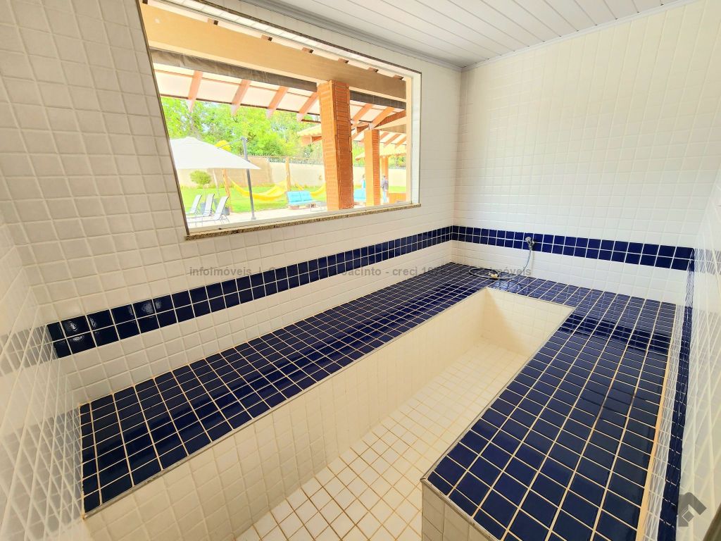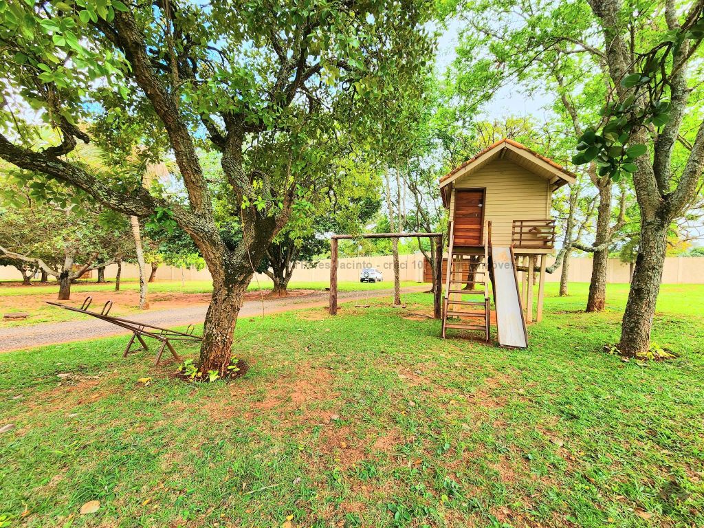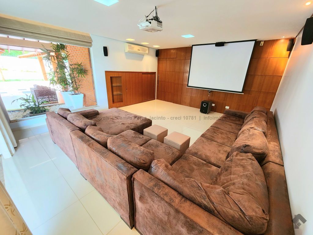 Uma suíte master com hidromassagem, duas suítes com hidromassagem, três suítes sendo duas para hóspedes, home theater, sala de jantar, sala de visitas, sala de TV, biblioteca, lareira, escritório, cozinha, despensa, área de serviço coberta, 2 banheiros, lavabo, sala de jogos, sauna, spa, toda avarandada, espaço gourmet completo com churrasqueira, fogão e forno a lenha, forno de pizza, câmara fria, bancada, ilha, despensa, fogão e forno embutido, piscina aquecida com cascata, aquecimento solar, campo de futebol, poço artesiano, garagem coberta para 6 carros, rica em madeira, armário em todos os cômodos, louças e metais Deca. Porcelanato tipo A retificado, toda murada, cerca elétrica e concertina.