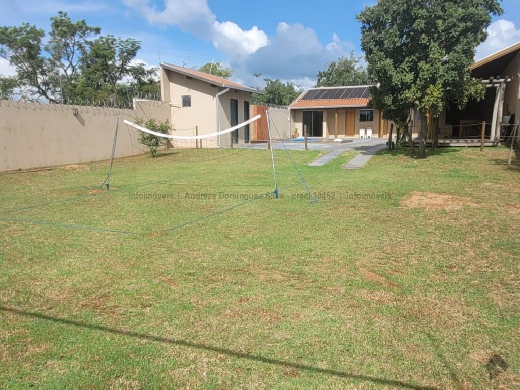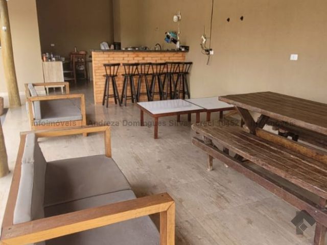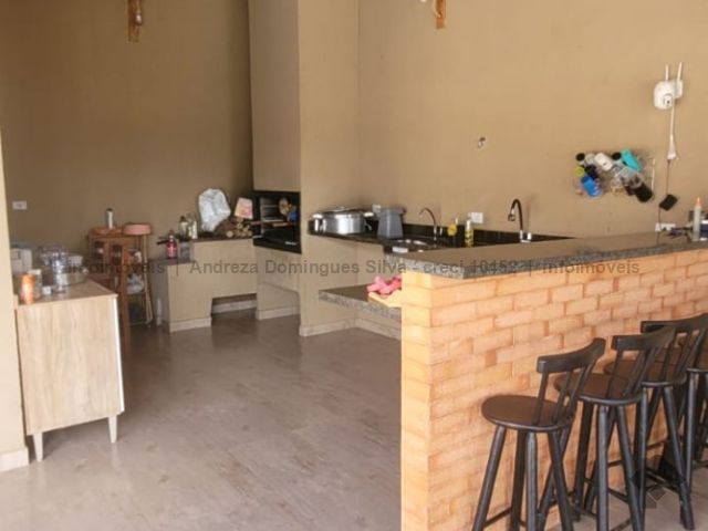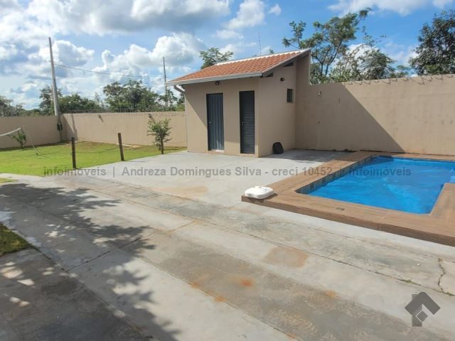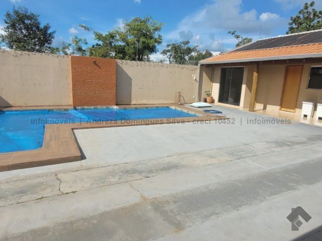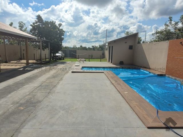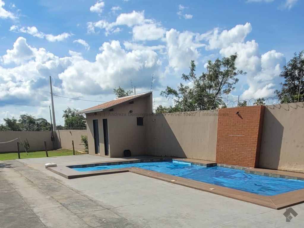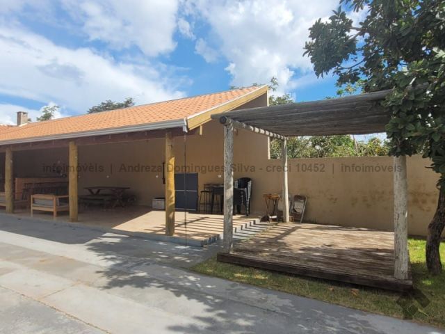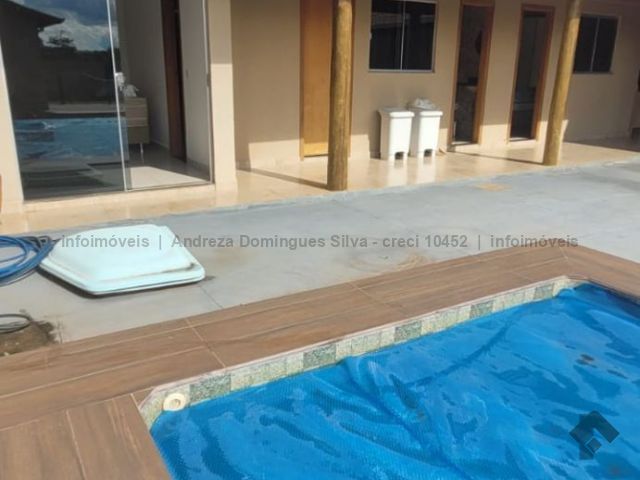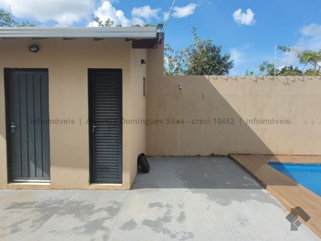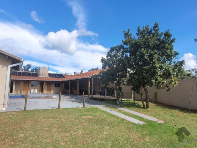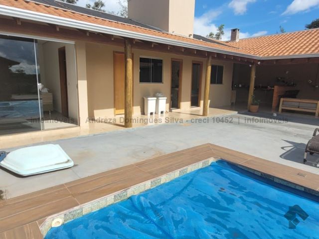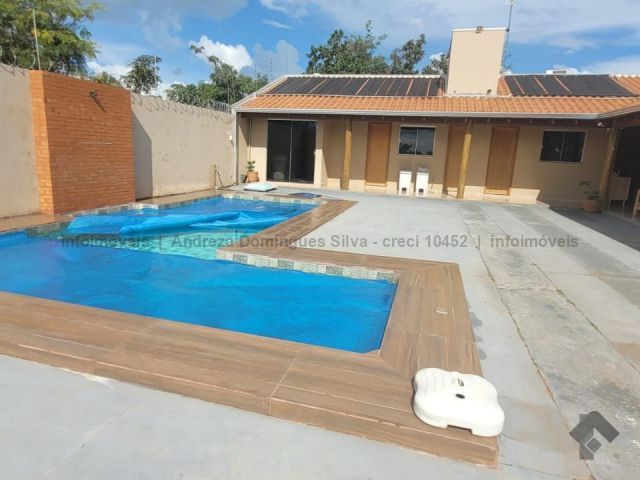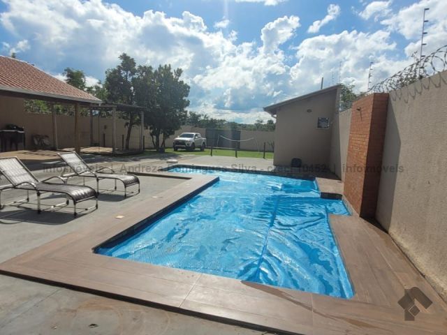 3 quartos, sendo 1 suíte, todos com ar condicionado e camas. Varanda com cozinha, piscina em L com hidromassagem, cascata, iluminação e aquecimento solar. Lavanderia/dispensa, 3 banheiros, churrasqueira com fogão a lenha, estacionamento para 10 carros. Todo fechado com muro e portão elétrico, concertina e cerca elétrica, 900 m do lago. Analisa permutas.