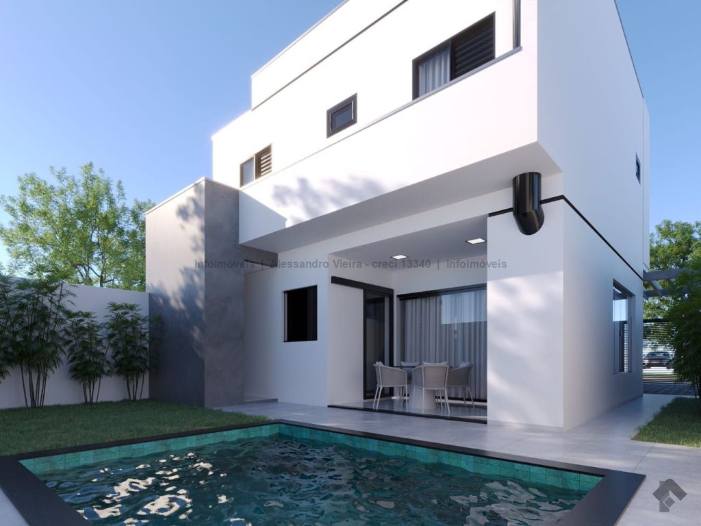 Sobrado novo com uma suíte e dois quartos, sala de estar e cozinha espaçosa com saída para área de serviço, banheiro social, área gourmet e piscina, lavanderia coberta, forro de gesso rebaixado e iluminação em LED. Todos os cômodos com iluminação natural e janelas grandes para melhor ventilação. Alto padrão de acabamento e projeto arquitetônico diferenciado.