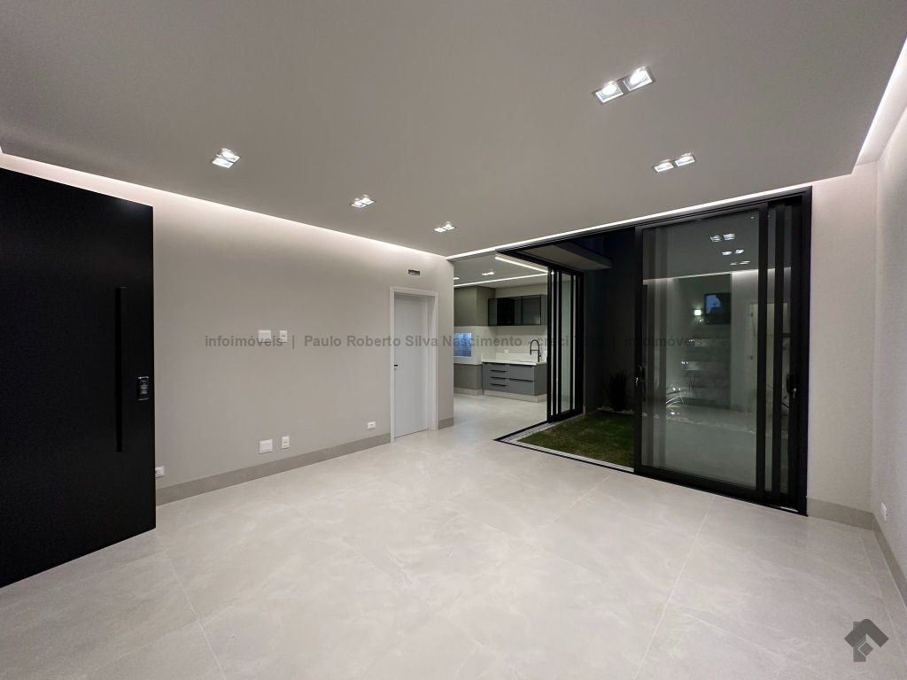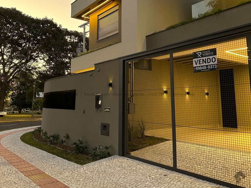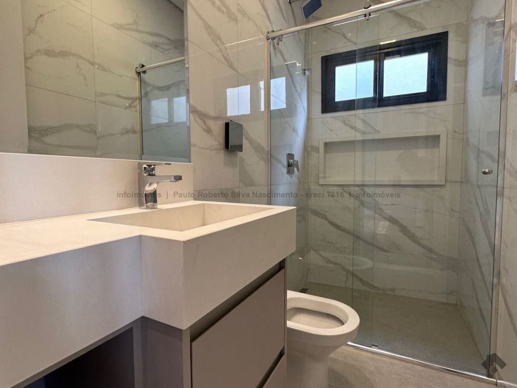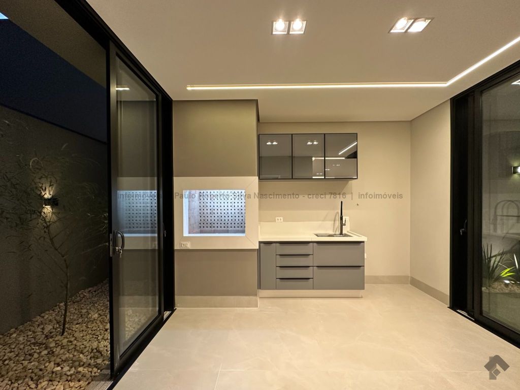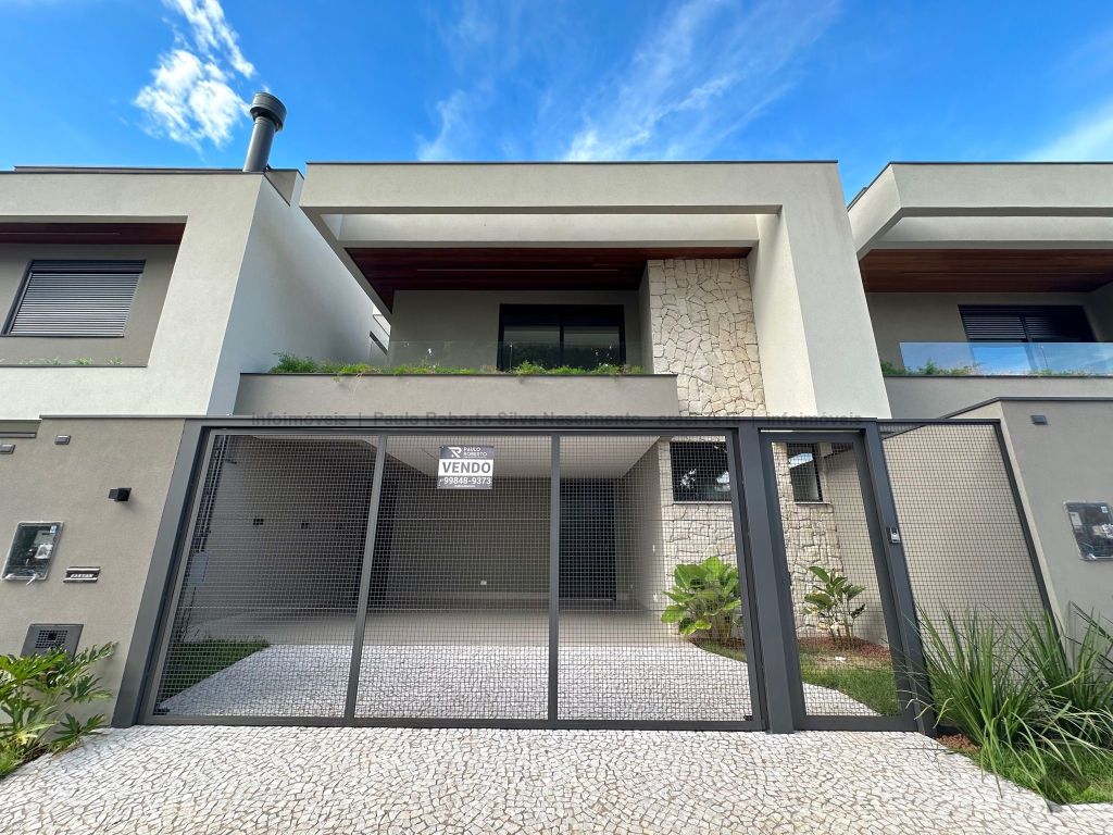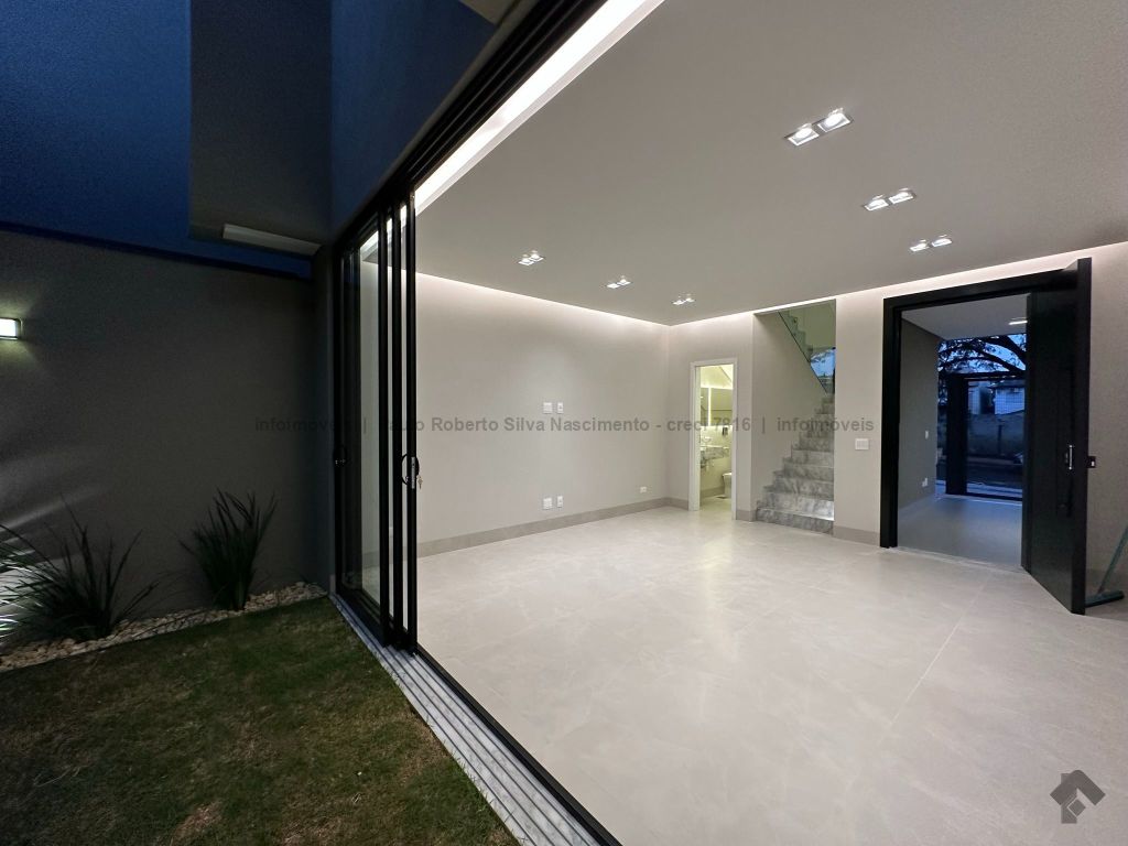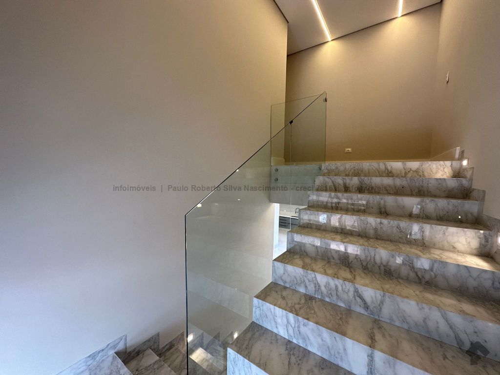 Piso térreo: com garagem ampla, sala, varanda gourmet com churrasqueira, lavabo, cozinha, lavanderia e quintal gramado. Piso superior: 01 suíte ampla (banheiro com cubas e duchas duplas) e sacada, 02 quartos amplos. Esquadrias em alumínio, persianas automatizadas, pisos grandes formatos 90x90m, sistema de água quente, com aquecedor instalado, banheiros com box e com conjuntos de louças marca deca, pontos para instalação de ares condicionados na sala, cozinha e suítes, armários embutidos na cozinha, área gourmet e banheiros, escada em mármore carrara.
