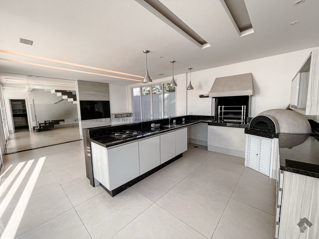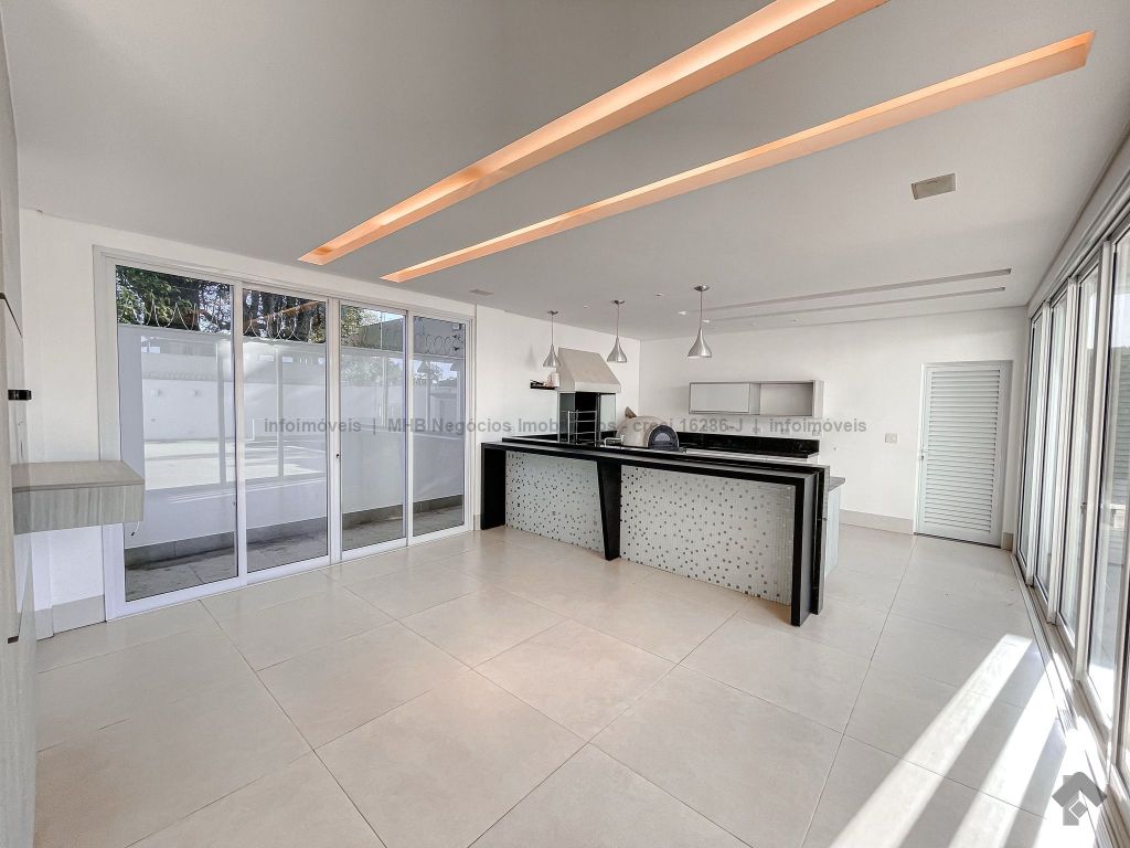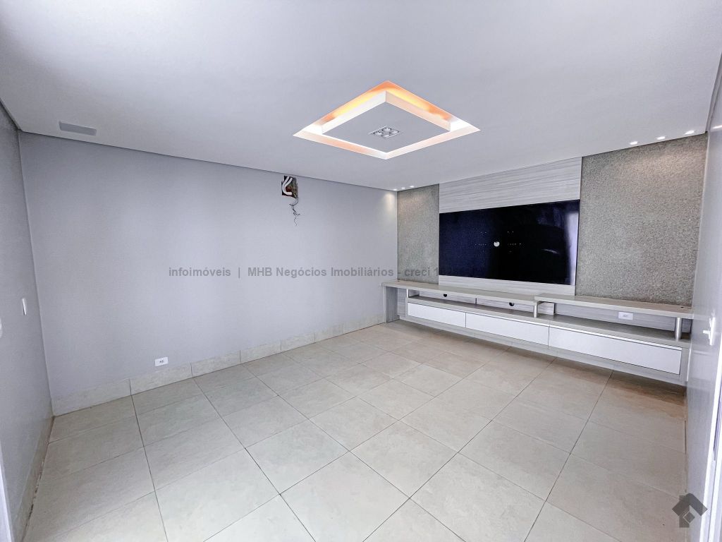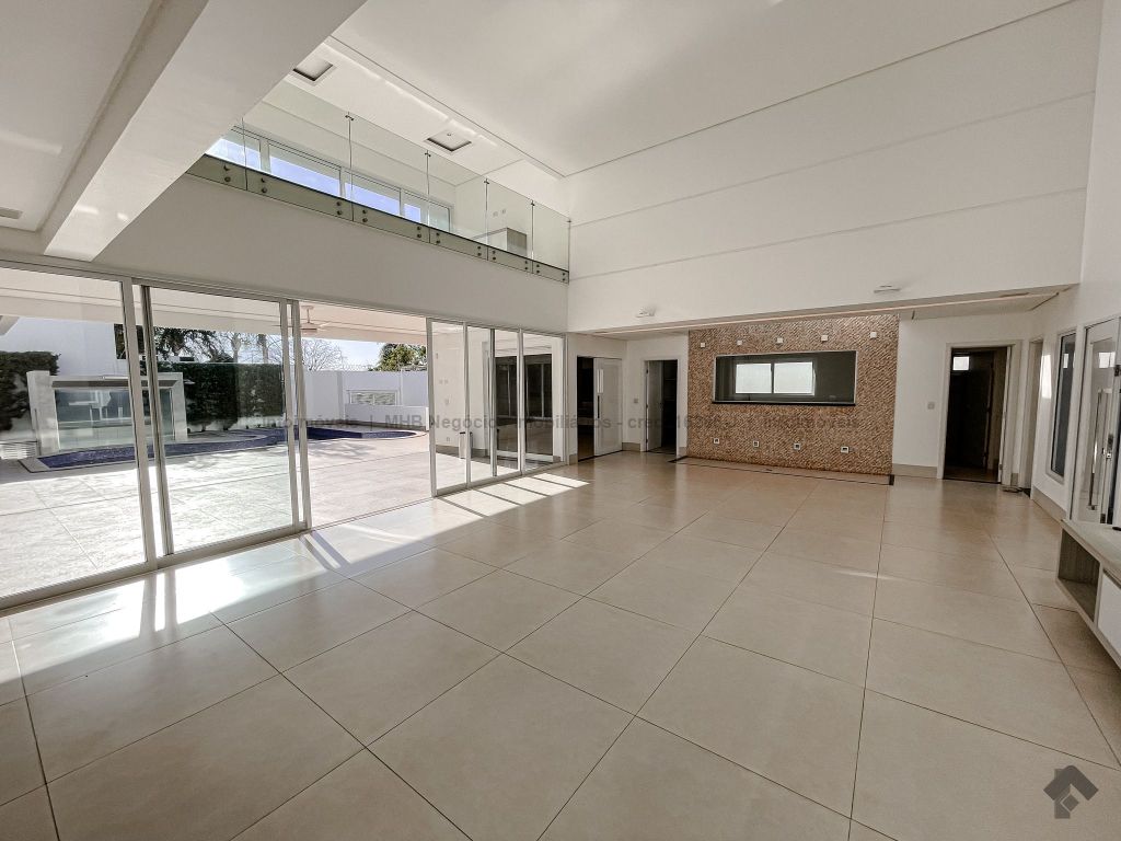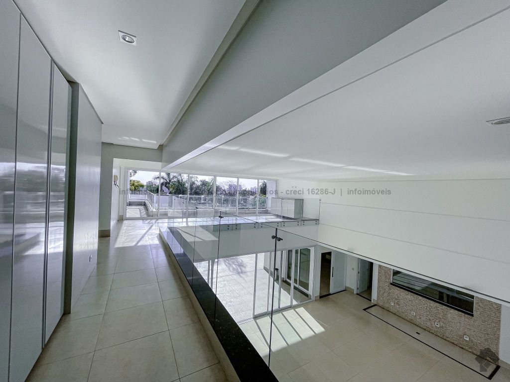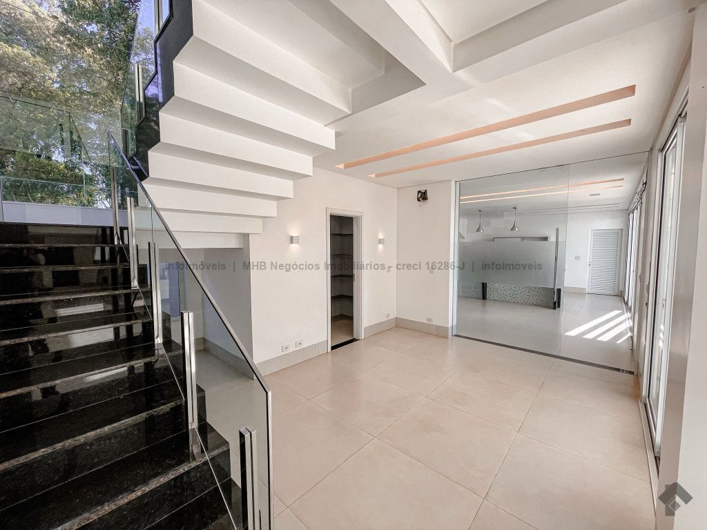 Piso inferior conta com uma suíte térrea e mais um quarto que pode ser revertido para suíte. Possui sala ampla para 2 ambientes, lavabo, escritório, sala de TV, cozinha, copa, área de serviço interna e externa, 2 despensas e banheiro de serviço. A área de lazer conta com área gourmet com sistema de som integrado, churrasqueira e forno de pizza, banheiro, sauna e piscina aquecida com cascata e hidro. O piso superior conta com antessala com sacada e roupeiro, duas suítes, sendo uma suíte master bem ampla com closet e sacada.