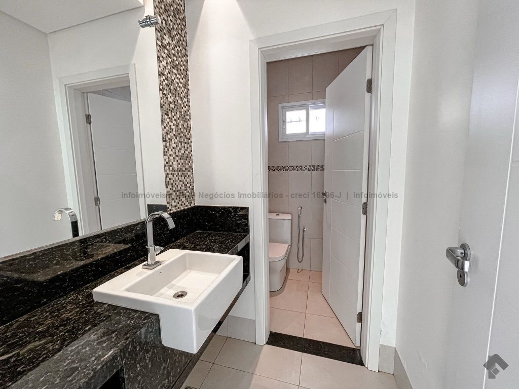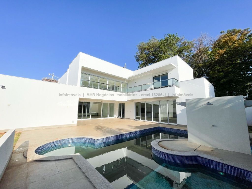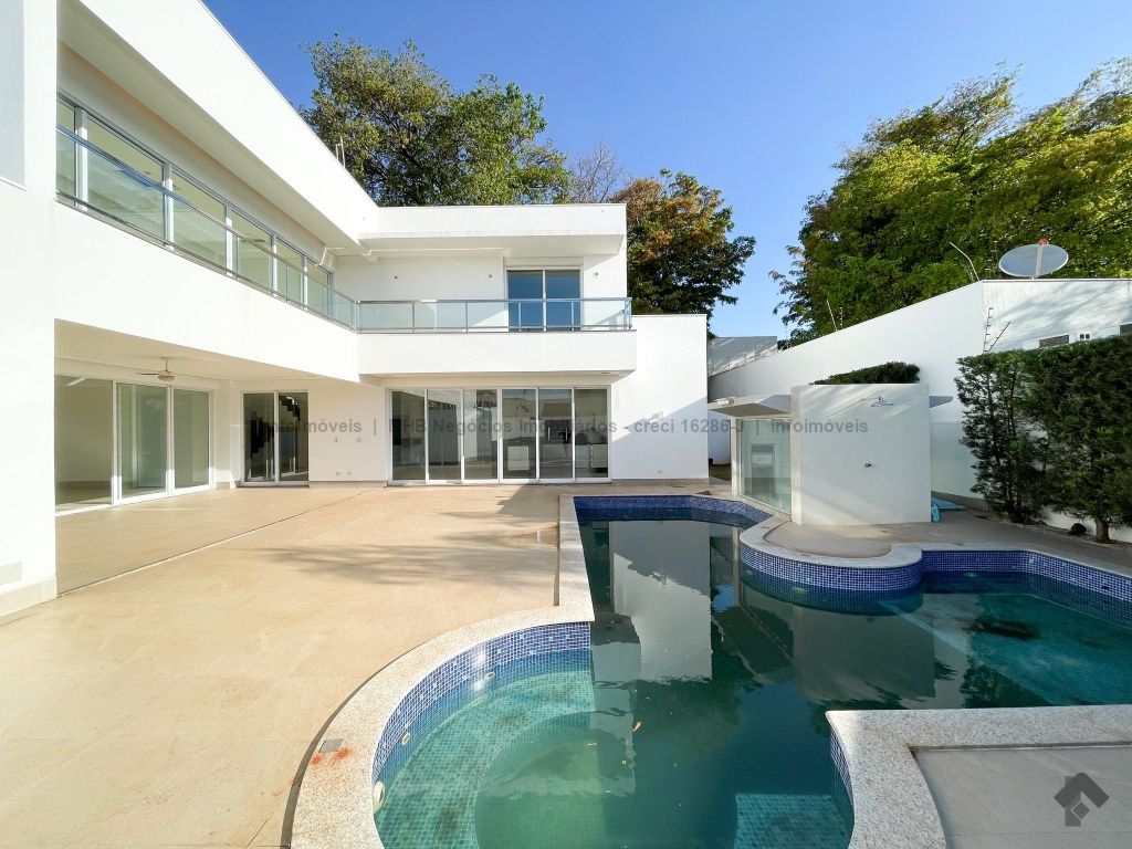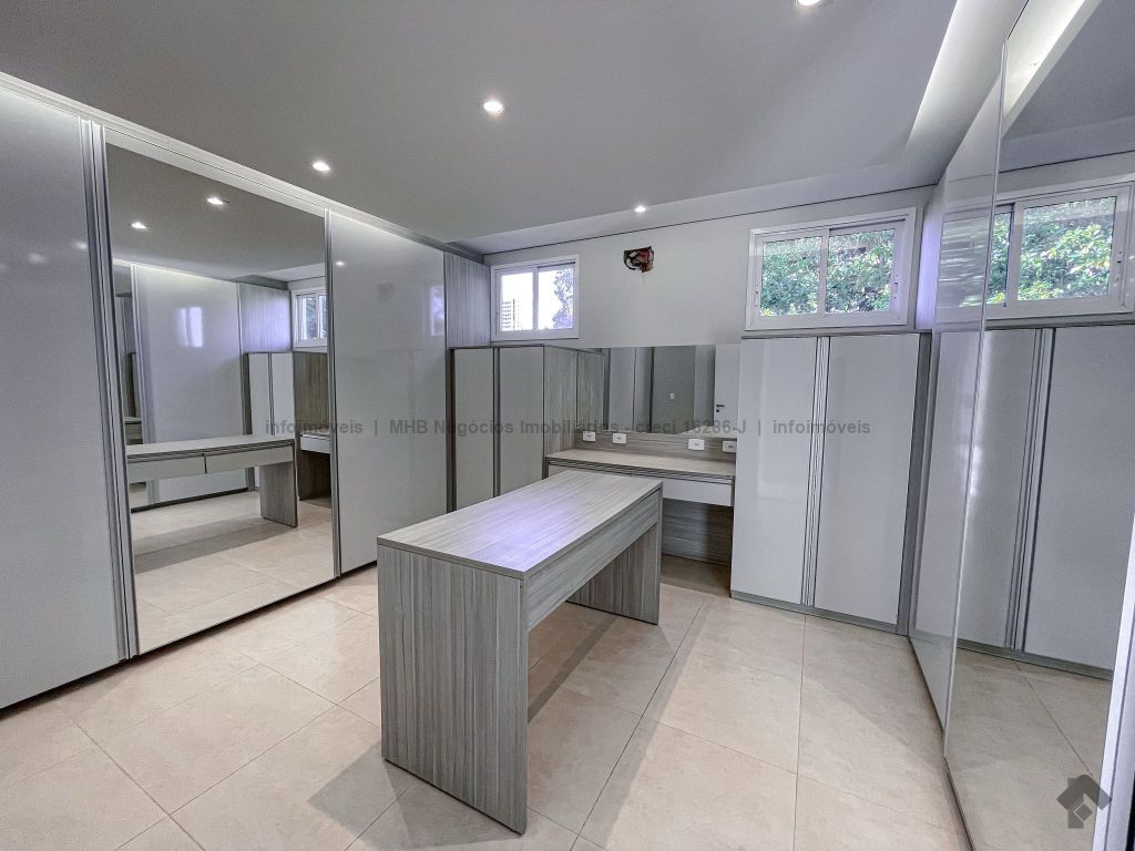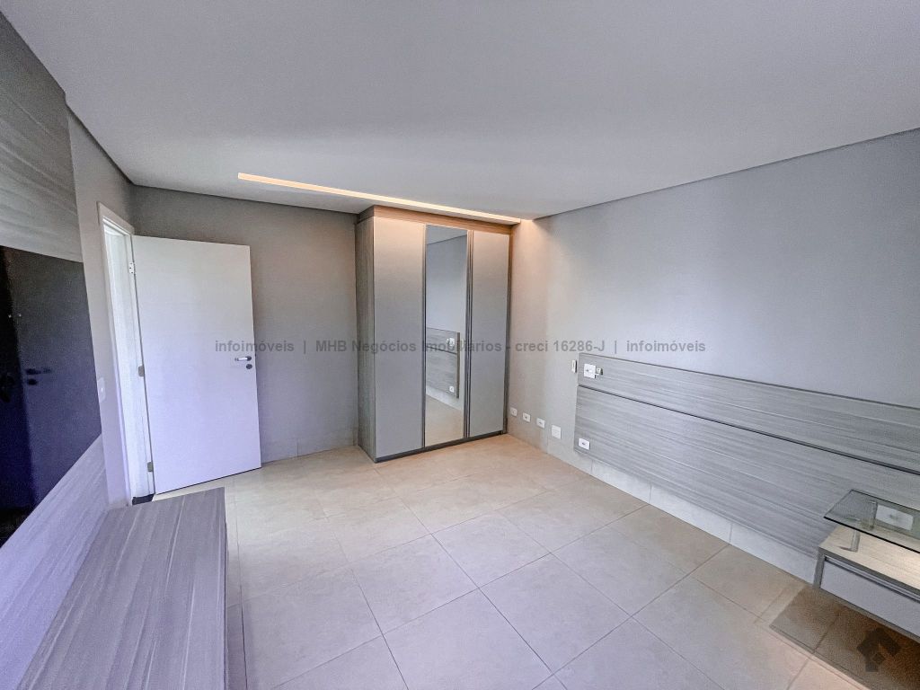 Piso inferior conta com uma suíte térrea e mais um quarto que pode ser revertido para suíte. Possui sala ampla para 2 ambientes, lavabo, escritório, sala de TV, cozinha, copa, área de serviço interna e externa, 2 despensas e banheiro de serviço. A área de lazer conta com área gourmet com sistema de som integrado, churrasqueira e forno de pizza, banheiro, sauna e piscina aquecida com cascata e hidro. O piso superior conta com antessala com sacada e roupeiro, duas suítes, sendo uma suíte master bem ampla com closet e sacada.
