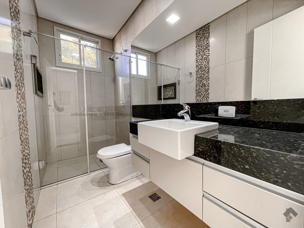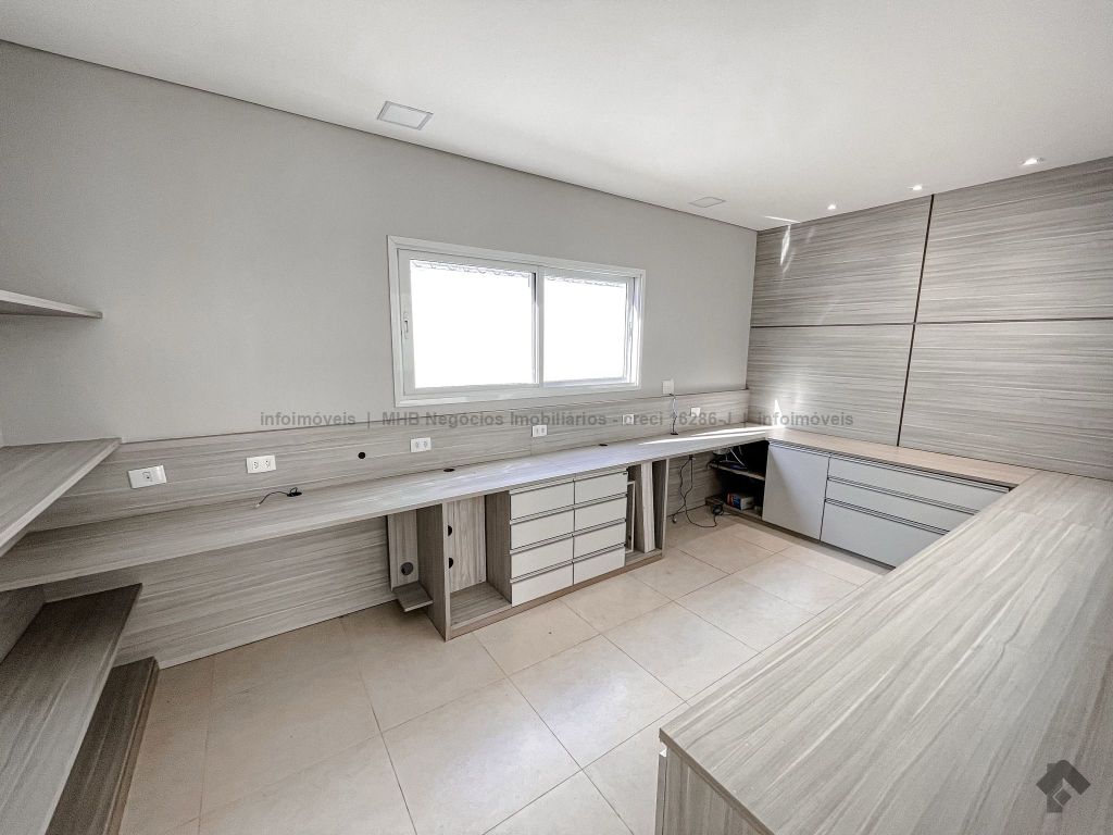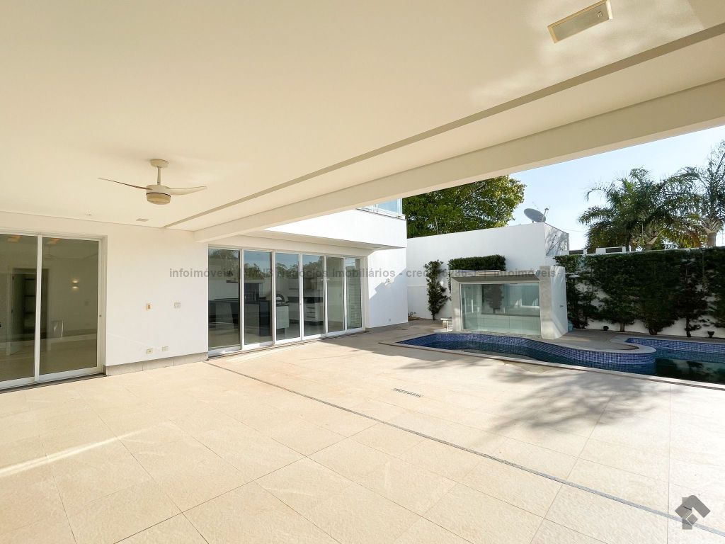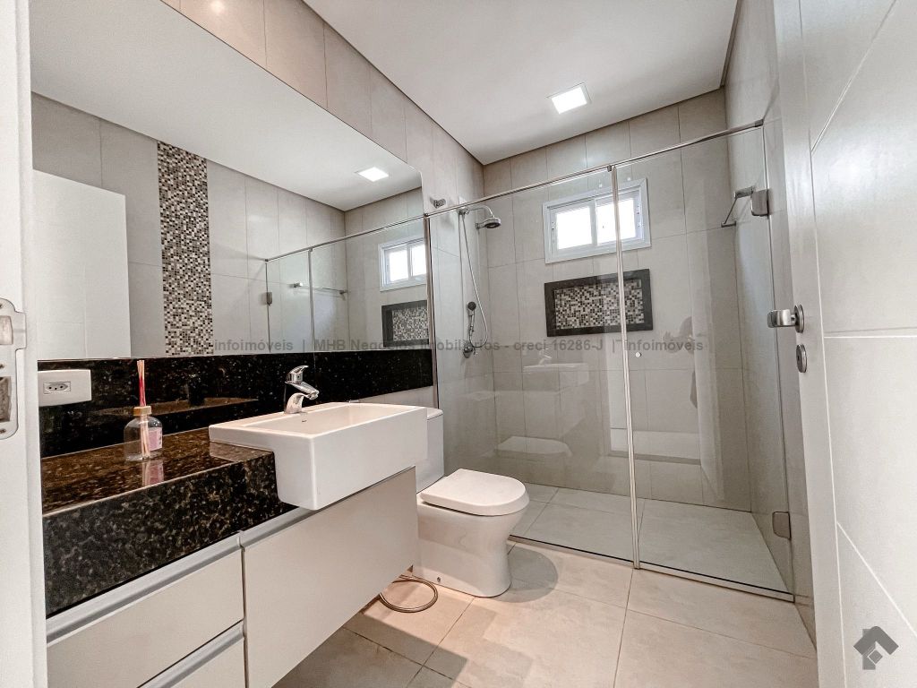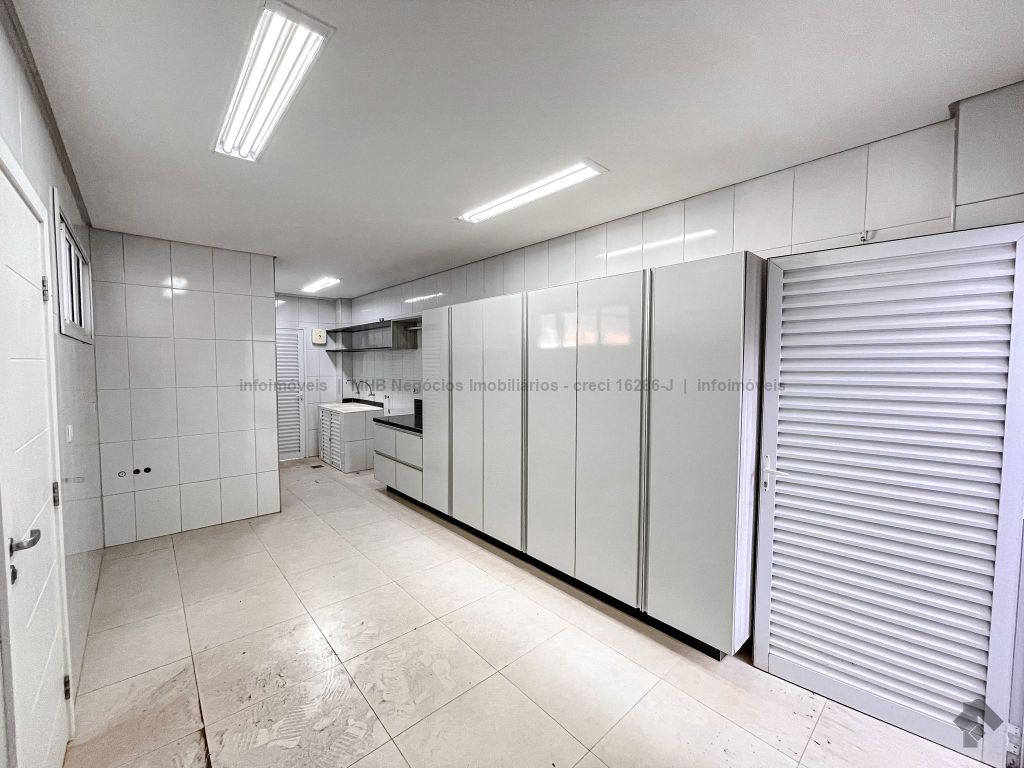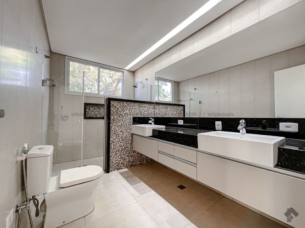 Piso inferior conta com uma suíte térrea e mais um quarto que pode ser revertido para suíte. Possui sala ampla para 2 ambientes, lavabo, escritório, sala de TV, cozinha, copa, área de serviço interna e externa, 2 despensas e banheiro de serviço. A área de lazer conta com área gourmet com sistema de som integrado, churrasqueira e forno de pizza, banheiro, sauna e piscina aquecida com cascata e hidro. O piso superior conta com antessala com sacada e roupeiro, duas suítes, sendo uma suíte master bem ampla com closet e sacada.