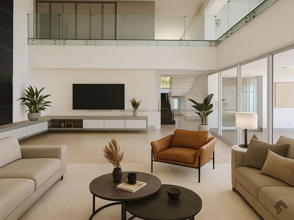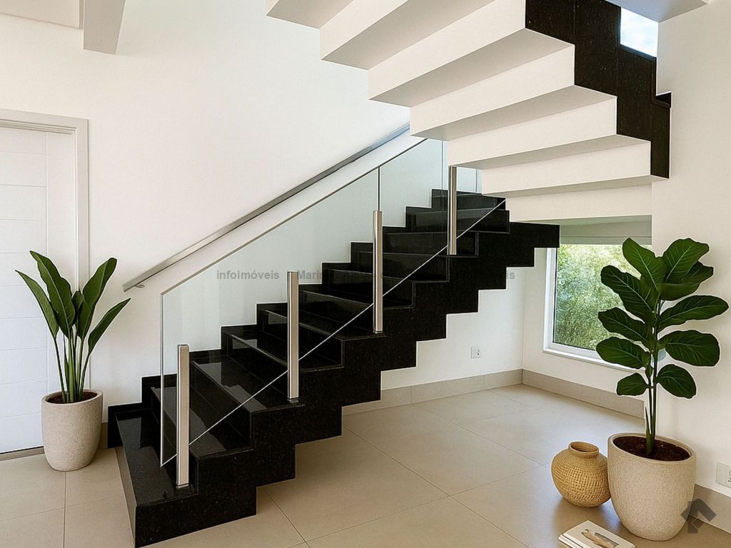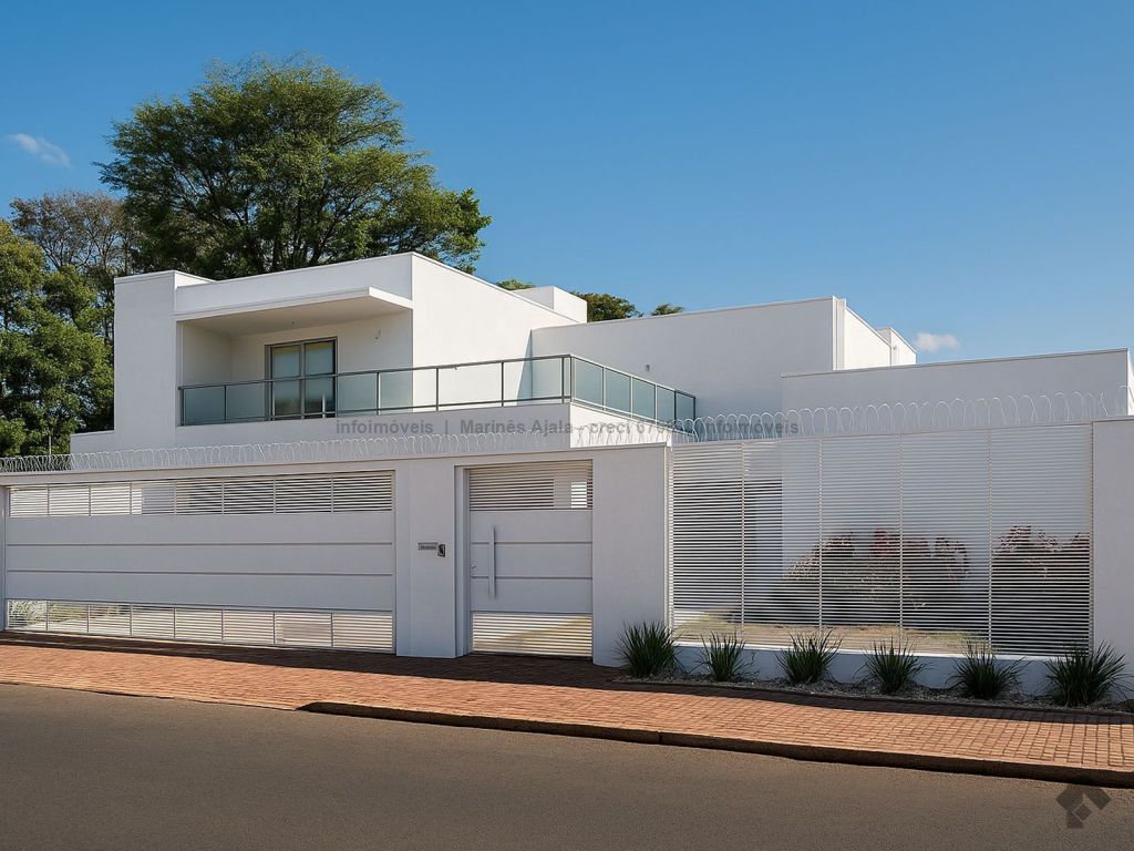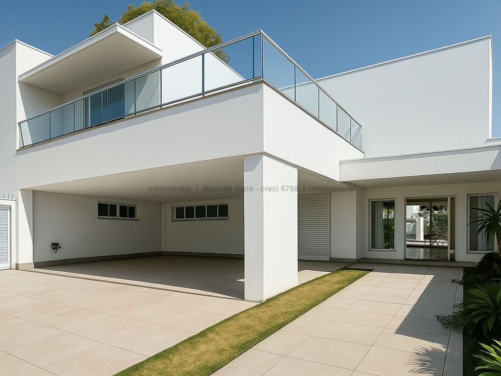 542,22 m² de área construída divididos em garagem coberta para até 3 carros, cabendo mais 3 carros na área descoberta da garagem, sala com pé-direito duplo, escritório, home theater, uma suíte no piso térreo com closet, lavabo, cozinha gourmet, banheiro auxiliar da cozinha gourmet, louseiro, copa, cozinha completa, área de serviço, armário de depósito externo na área de serviço e outro na garagem, varanda, piscina aquecida, sauna, entrada externa no fundo da casa que dá para uma rua sem saída, no piso superior espaço para academia, suíte master com closet, uma suíte júnior, varanda na área externa da suíte júnior e um quarto com banheiro.