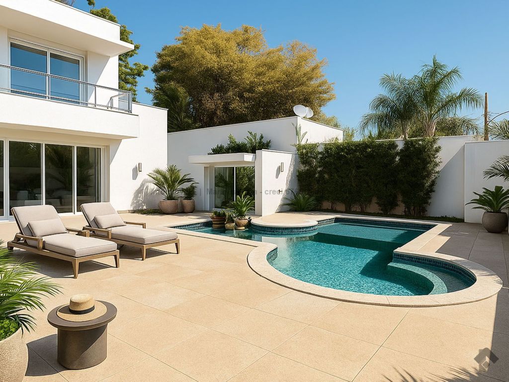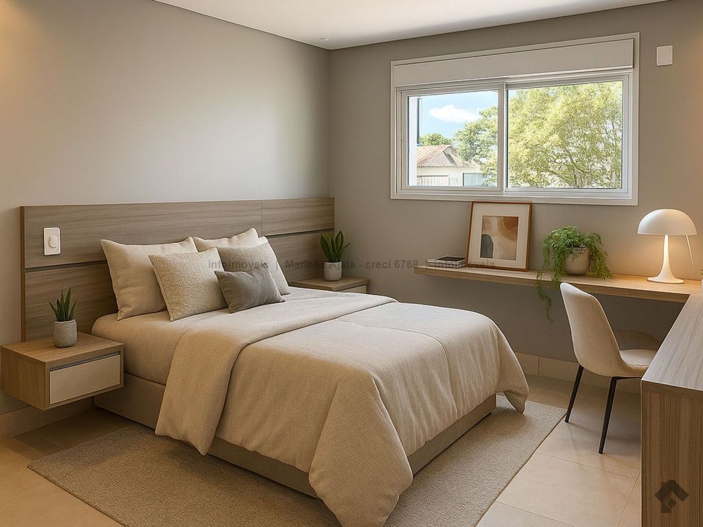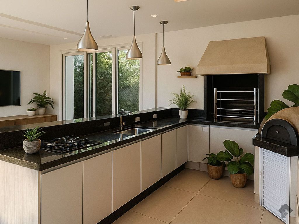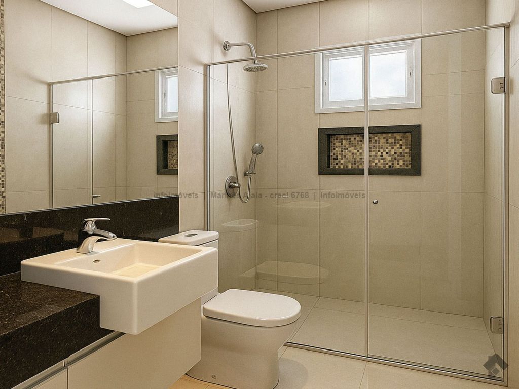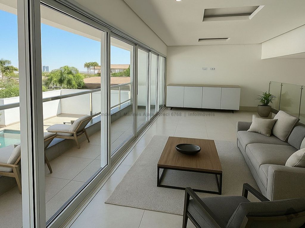 542,22 m² de área construída divididos em garagem coberta para até 3 carros, cabendo mais 3 carros na área descoberta da garagem, sala com pé-direito duplo, escritório, home theater, uma suíte no piso térreo com closet, lavabo, cozinha gourmet, banheiro auxiliar da cozinha gourmet, louseiro, copa, cozinha completa, área de serviço, armário de depósito externo na área de serviço e outro na garagem, varanda, piscina aquecida, sauna, entrada externa no fundo da casa que dá para uma rua sem saída, no piso superior espaço para academia, suíte master com closet, uma suíte júnior, varanda na área externa da suíte júnior e um quarto com banheiro.