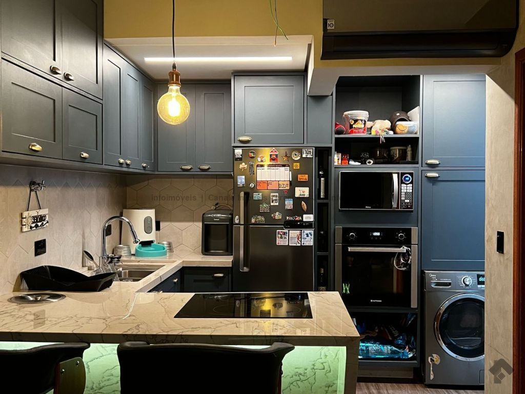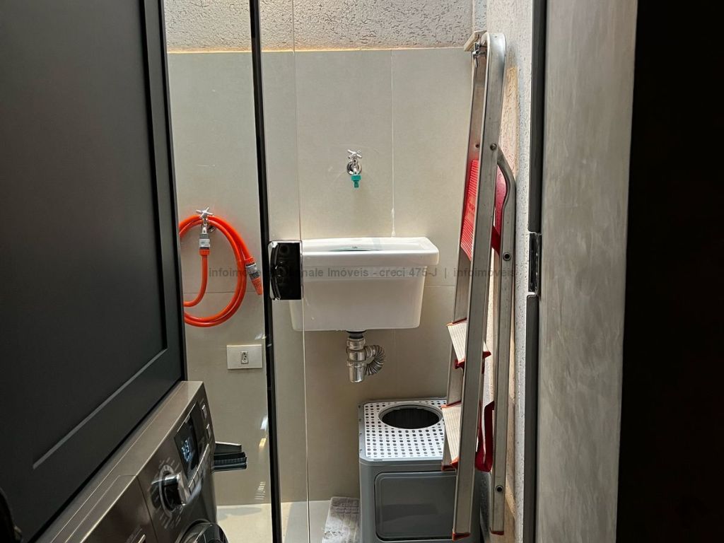 Sobrado com sala de estar, cozinha, lavabo, lavanderia e suíte com closet.