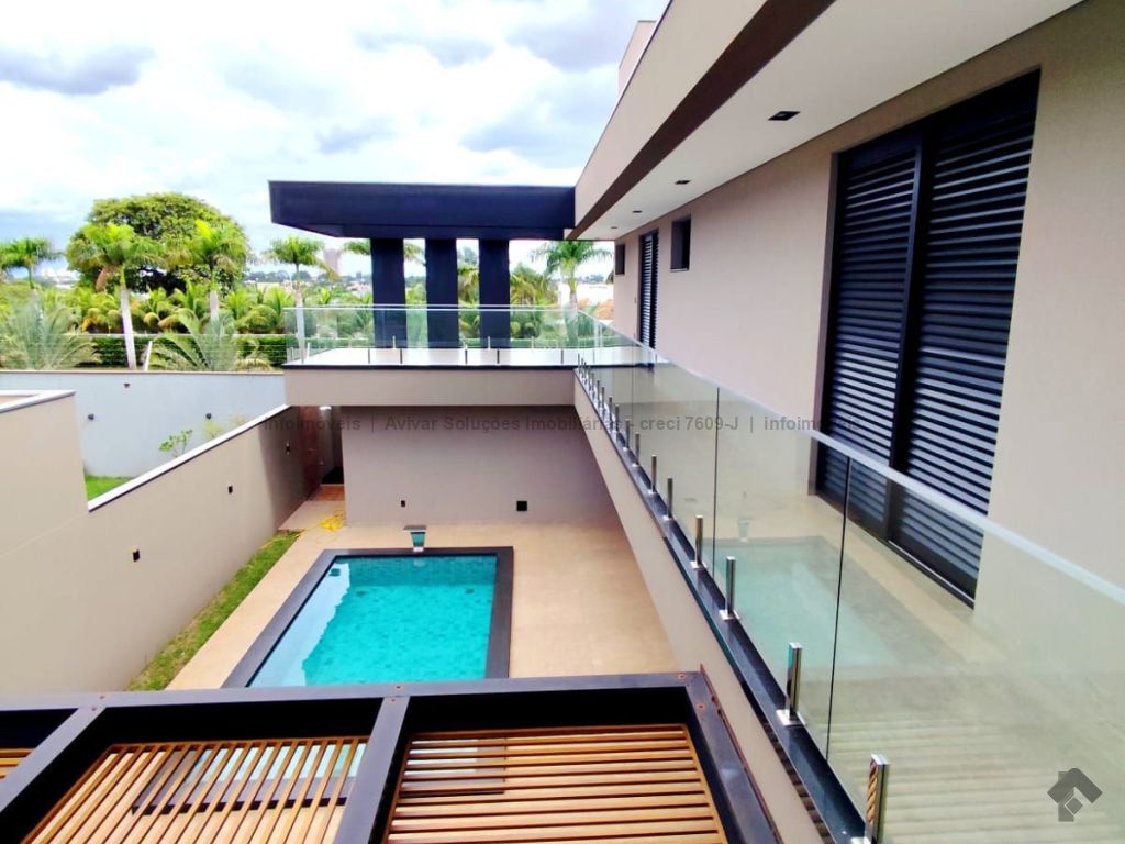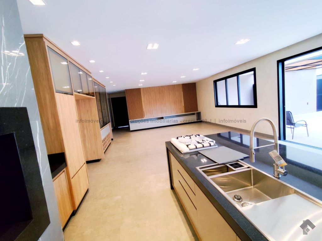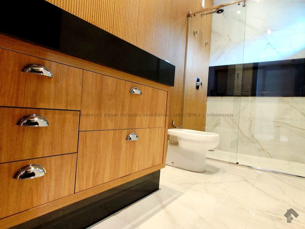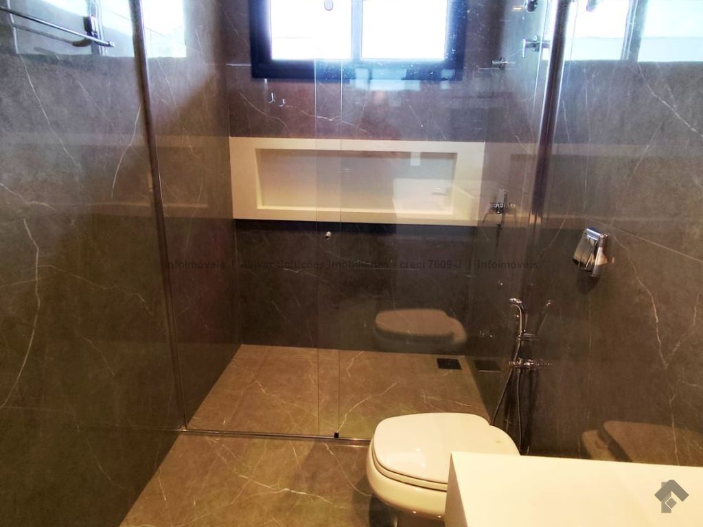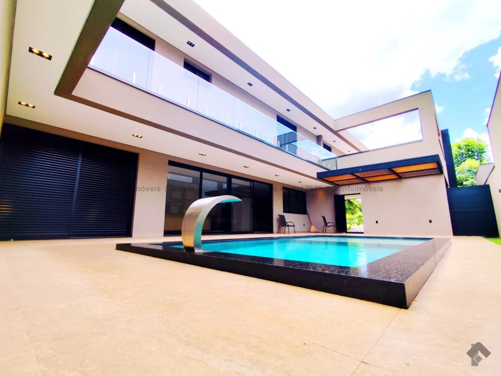 Excelente sobrado com sala de TV com painel, sala de jantar, cozinha gourmet com armários e churrasqueira, banheiro social com gabinete, três suítes com closet na parte superior e uma suíte na parte inferior, área de serviço ampla, piscina com cascata, iluminação e prainha e garagem coberta para quatro carros.