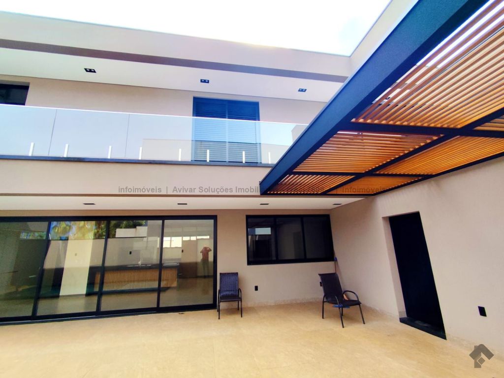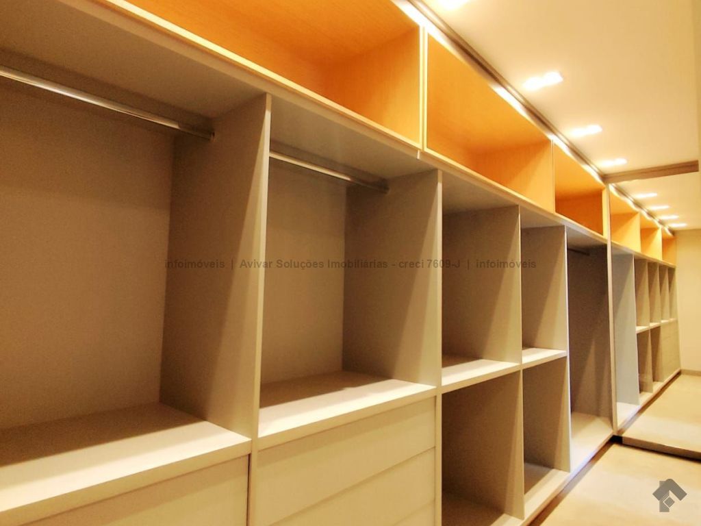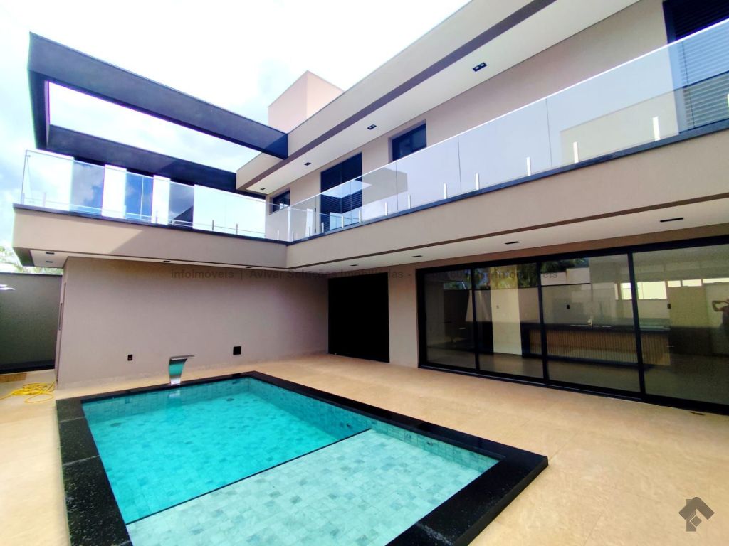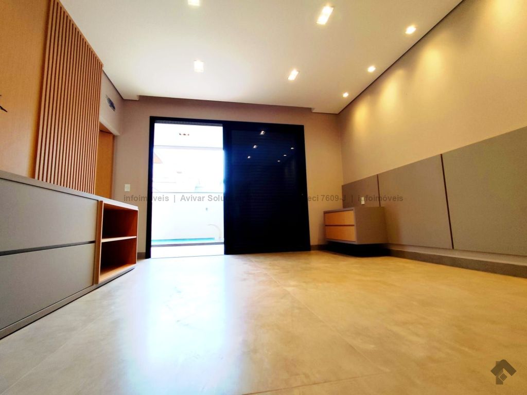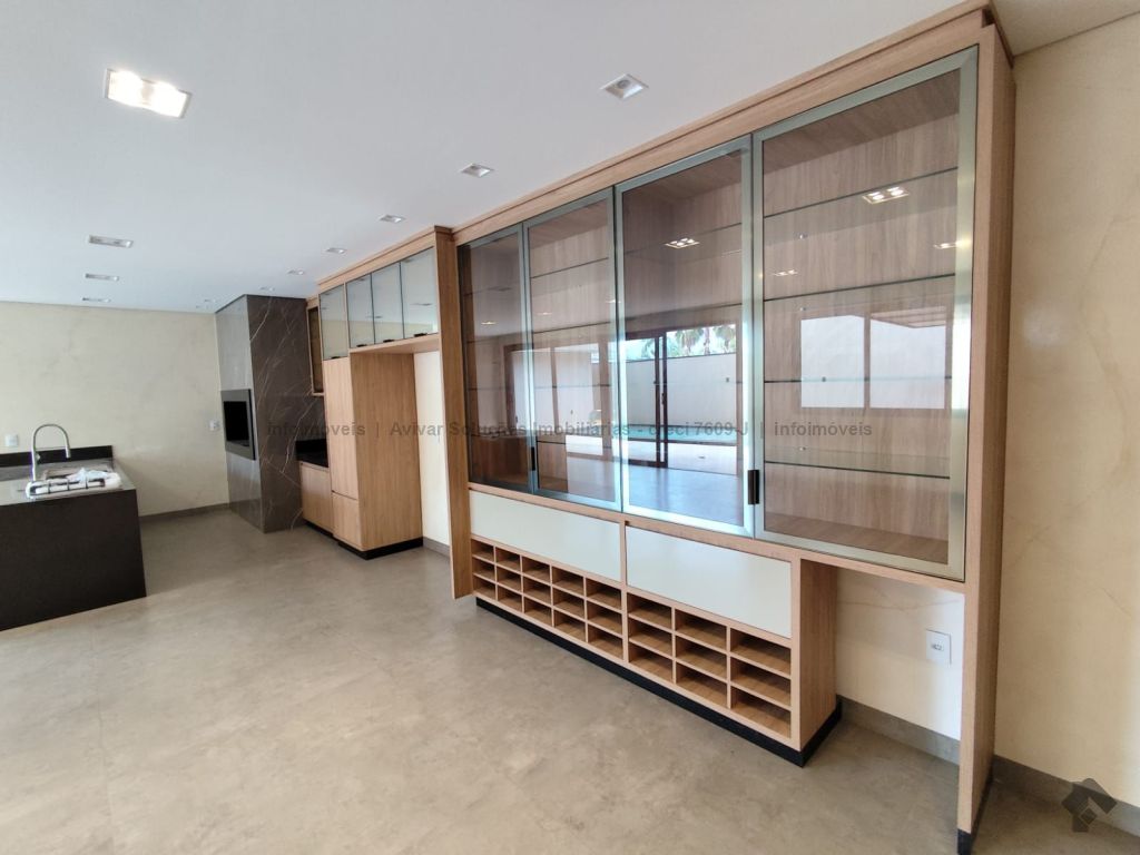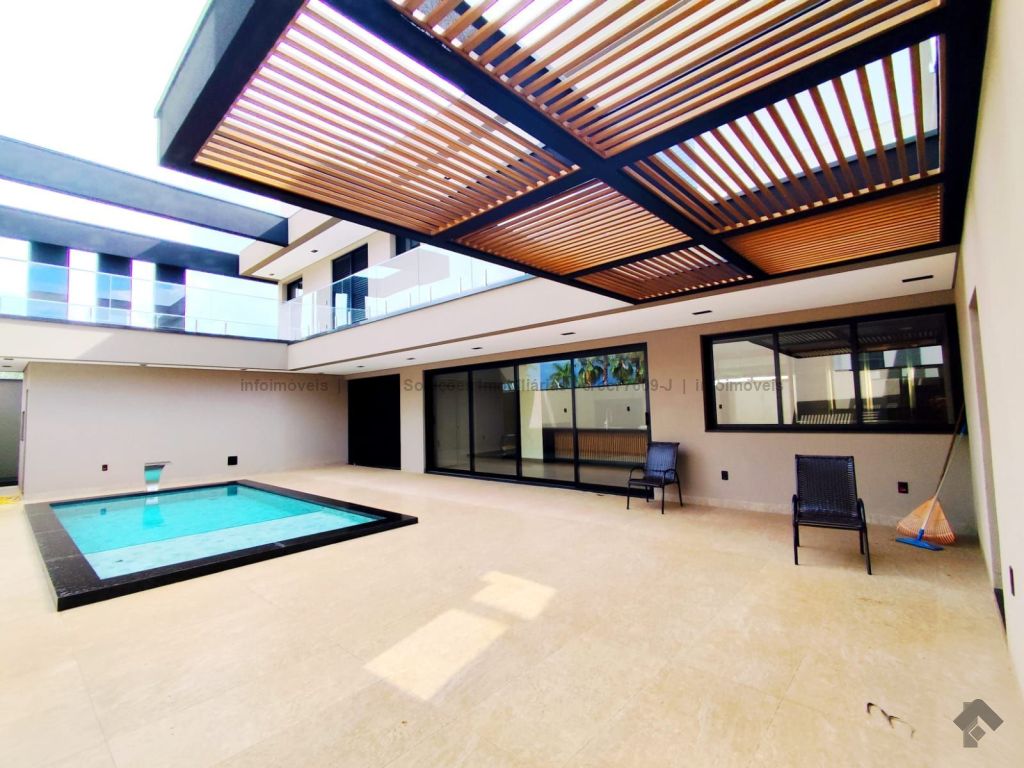 Excelente sobrado com sala de TV com painel, sala de jantar, cozinha gourmet com armários e churrasqueira, banheiro social com gabinete, três suítes com closet na parte superior e uma suíte na parte inferior, área de serviço ampla, piscina com cascata, iluminação e prainha e garagem coberta para quatro carros.