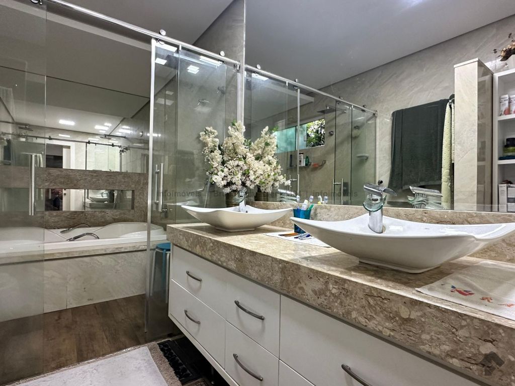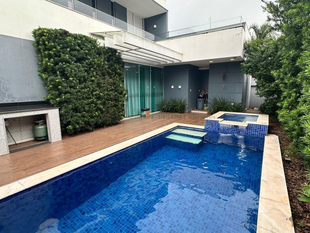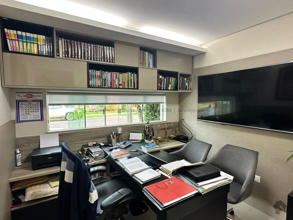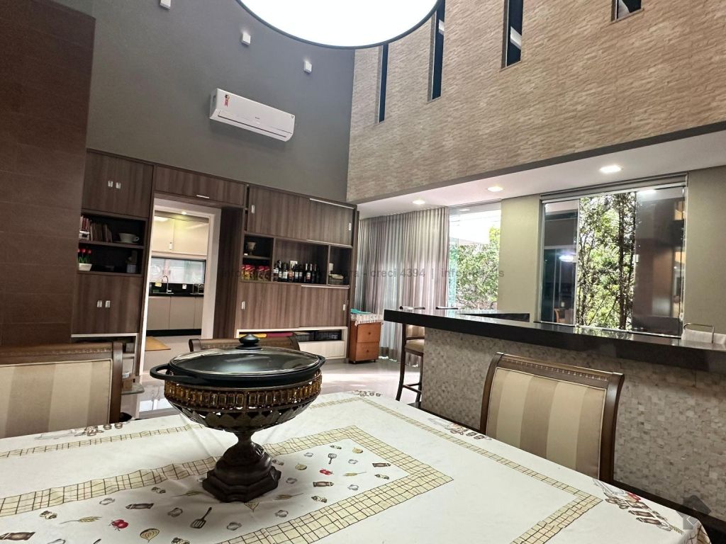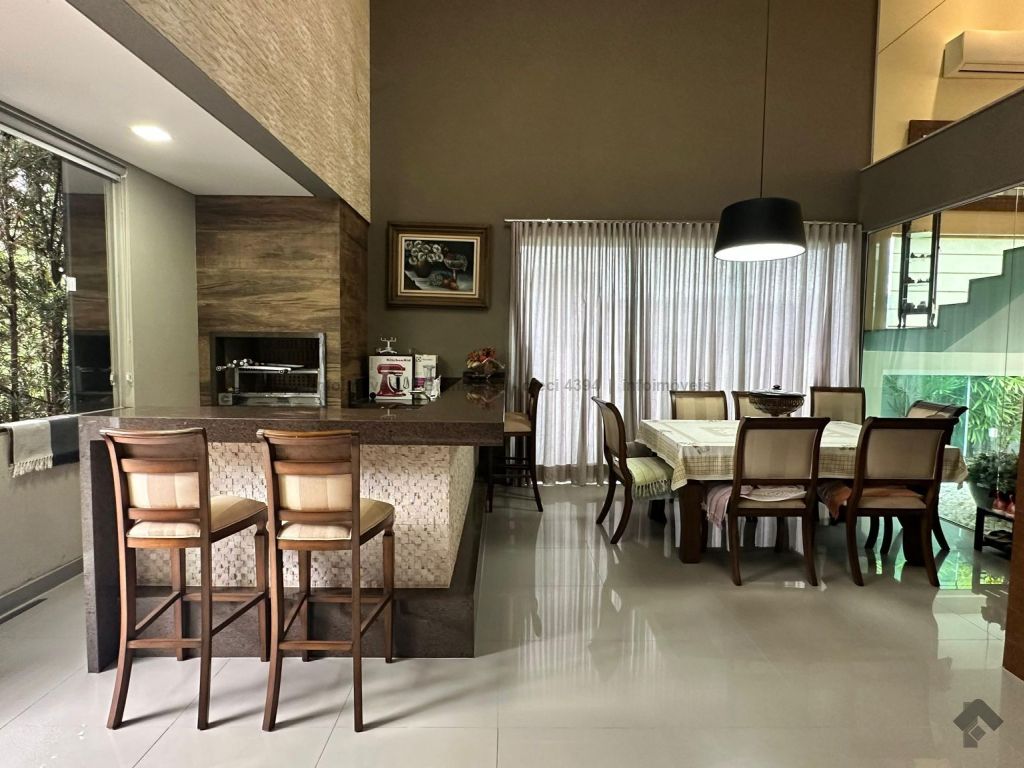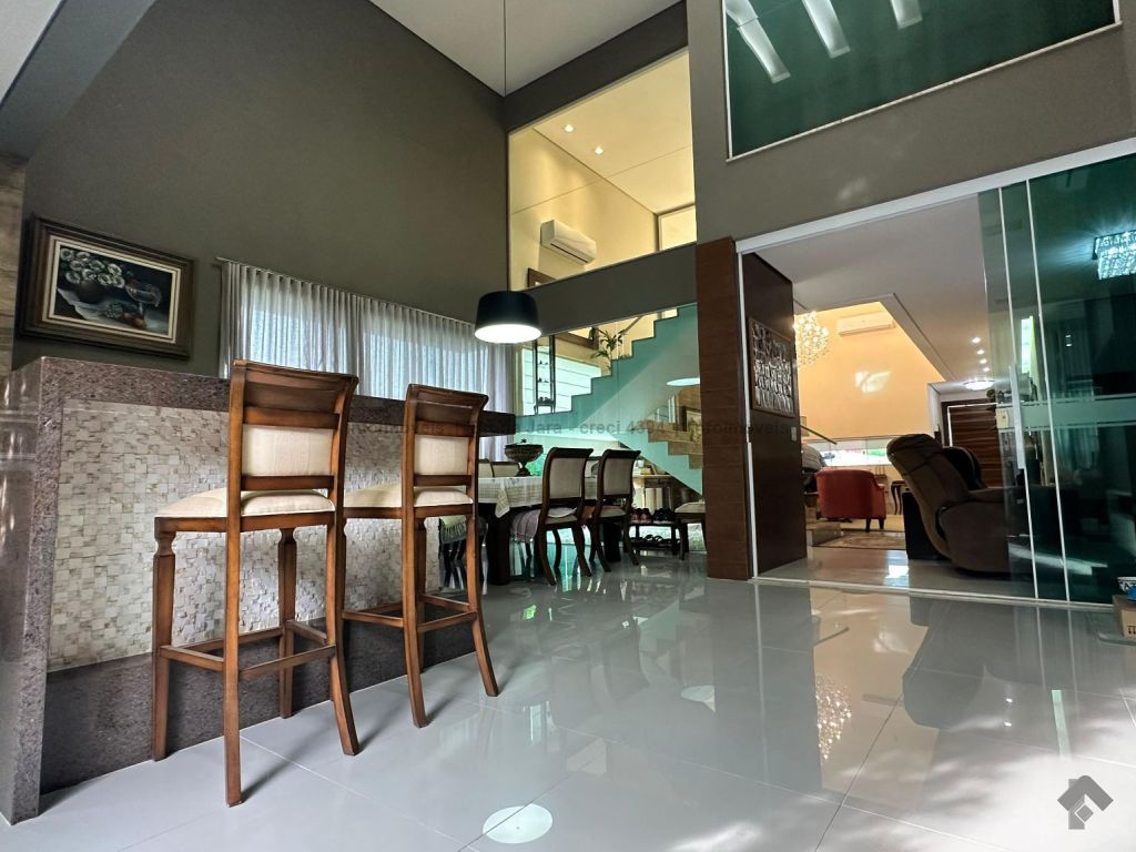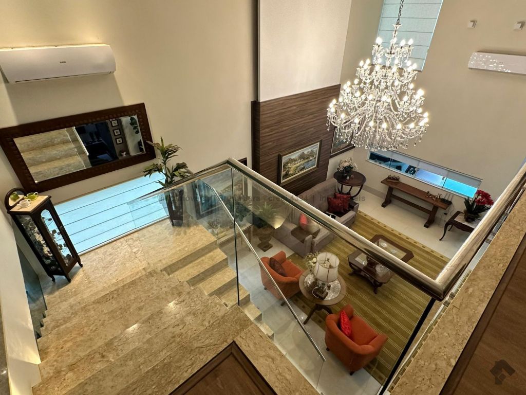 Sobrado bem estruturado, sendo o projeto elaborado por arquiteto renomado. No piso térreo, é composto por suíte máster, escritório, lavabo, sala ampla de estar, jantar e de TV, cozinha planejada e equipada, área gourmet com churrasqueira, área de serviço, despensa e piscina aquecida. No piso superior, é composto por hall, sala íntima/TV, 03 suítes com sacada. Os ambientes são planejados e climatizados.