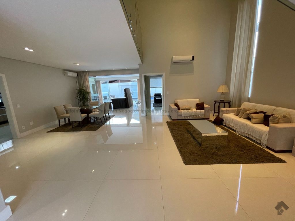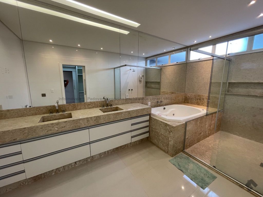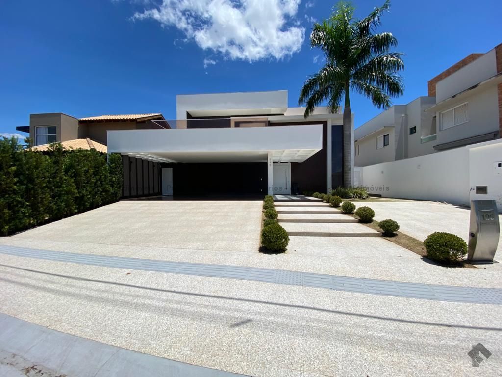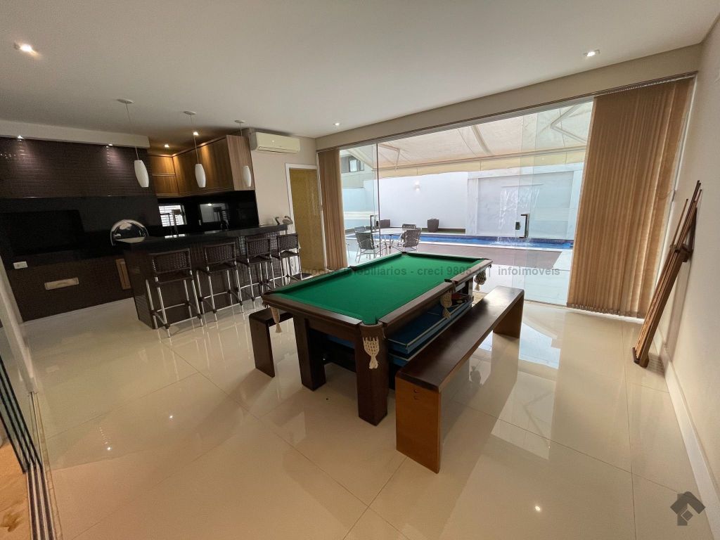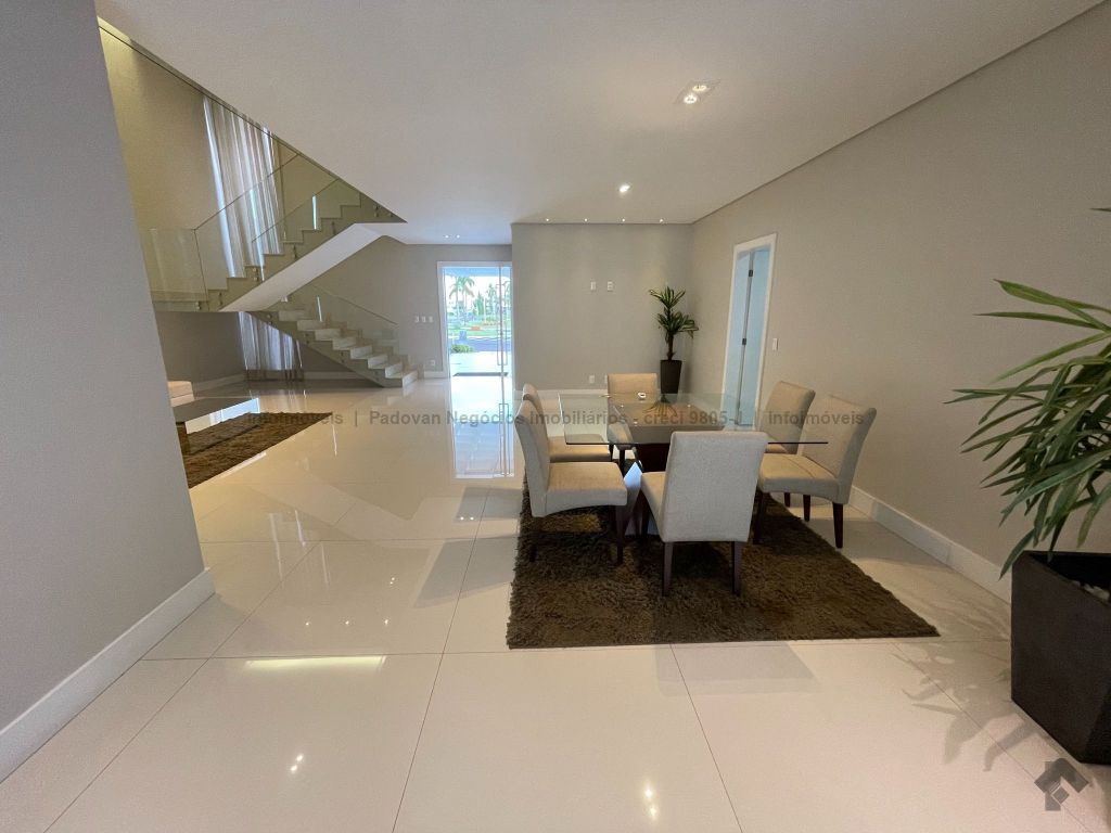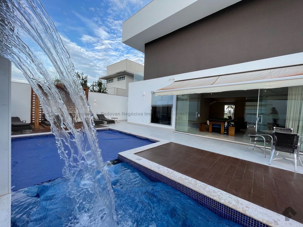 Sobrado bem localizado, próximo à guarita e sol da manhã, 7 vagas de garagem, sendo3 cobertas, sistema de segurança com 5 câmeras infravermelho de visão noturna com wi-fi pelo celular, aquecimento de água solar, a gás e elétrico, 3 suítes climatizadas, com persianas automatizadas e closet no andar superior, sendo uma master, todas com sacadas, sala ampla de estar e jantar com escadaria em mármore, lavabo, 1 suíte térrea com home office climatizado, área de serviço com wc e quarto de serviço climatizado com a/e, área gourmet climatizada com lavabo, mesa integrada de sinuca, ping pong e jantar, churrasqueira em granito preto, forno de pizza e bancada. Piscina aquecida com raia.