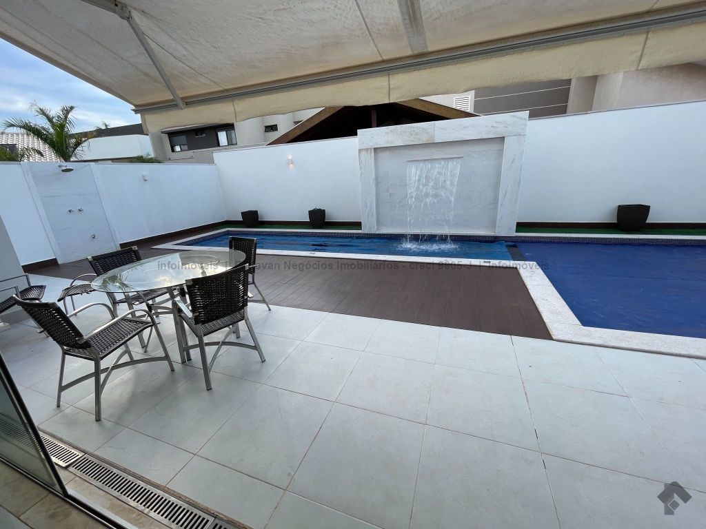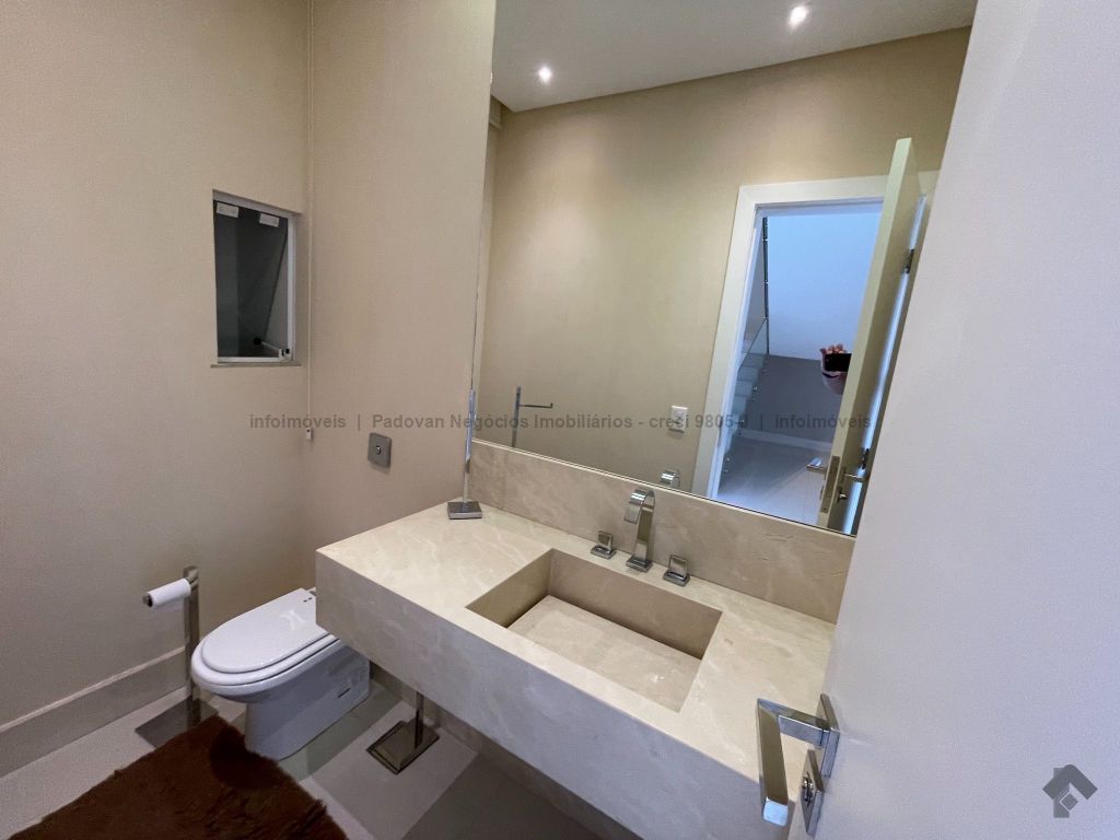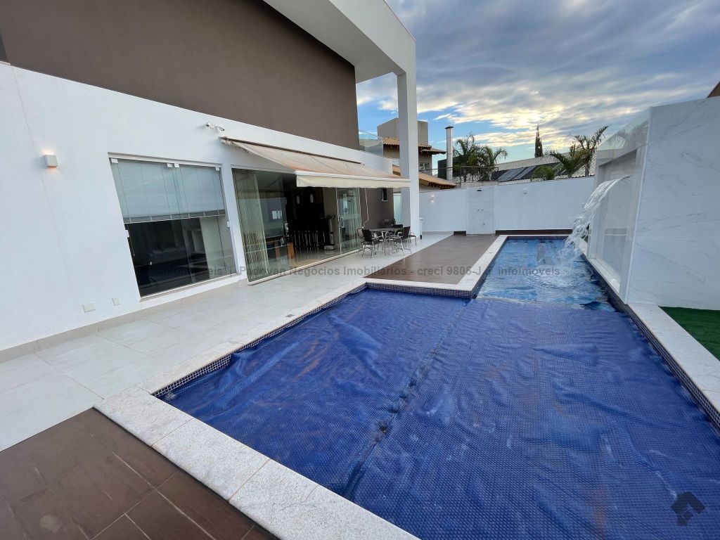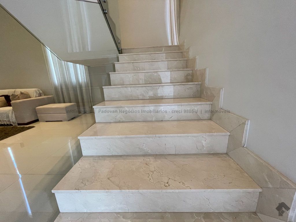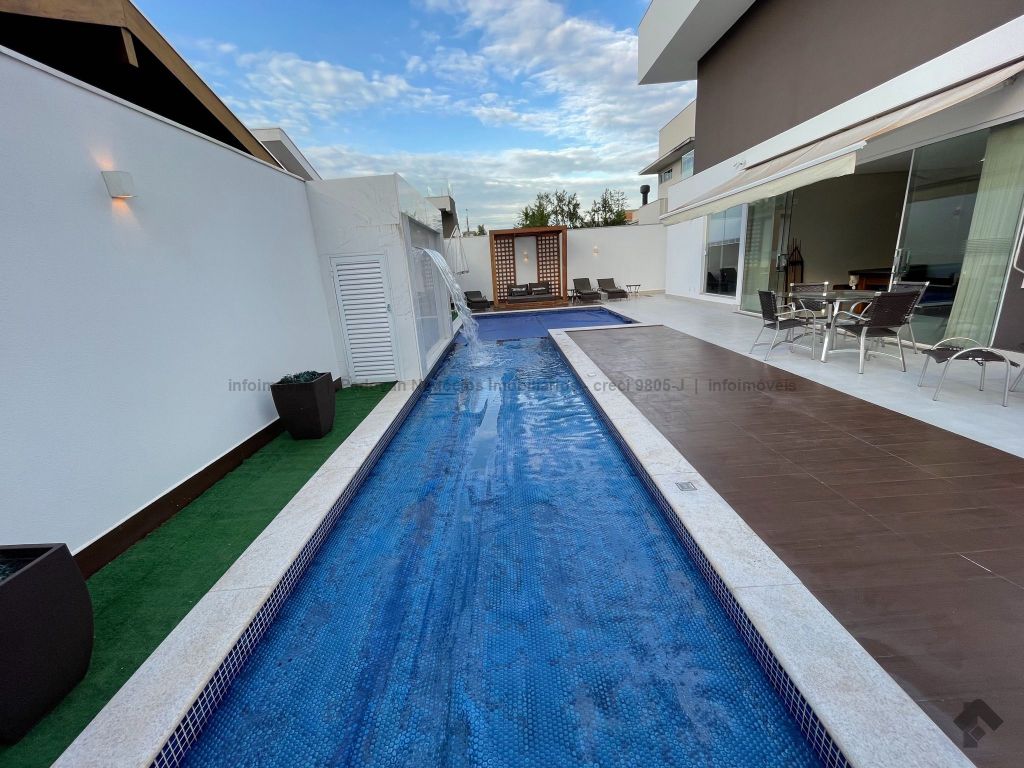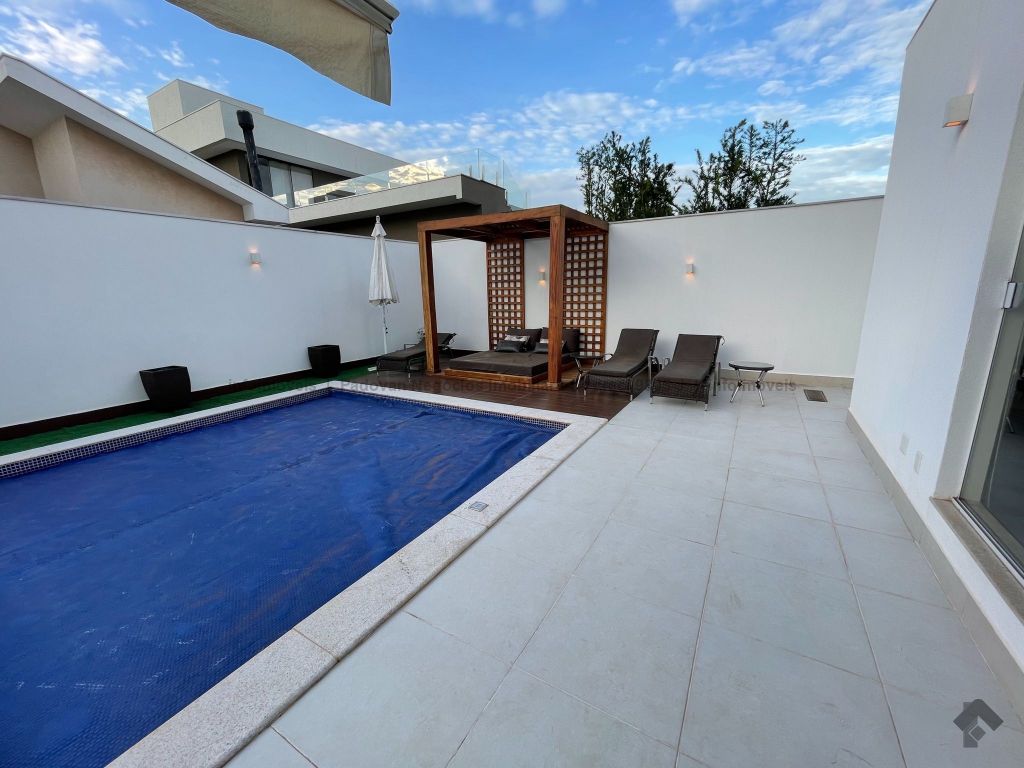 Sobrado bem localizado, próximo à guarita e sol da manhã, 7 vagas de garagem, sendo3 cobertas, sistema de segurança com 5 câmeras infravermelho de visão noturna com wi-fi pelo celular, aquecimento de água solar, a gás e elétrico, 3 suítes climatizadas, com persianas automatizadas e closet no andar superior, sendo uma master, todas com sacadas, sala ampla de estar e jantar com escadaria em mármore, lavabo, 1 suíte térrea com home office climatizado, área de serviço com wc e quarto de serviço climatizado com a/e, área gourmet climatizada com lavabo, mesa integrada de sinuca, ping pong e jantar, churrasqueira em granito preto, forno de pizza e bancada. Piscina aquecida com raia.