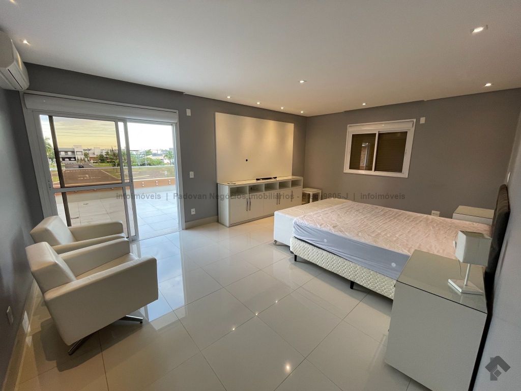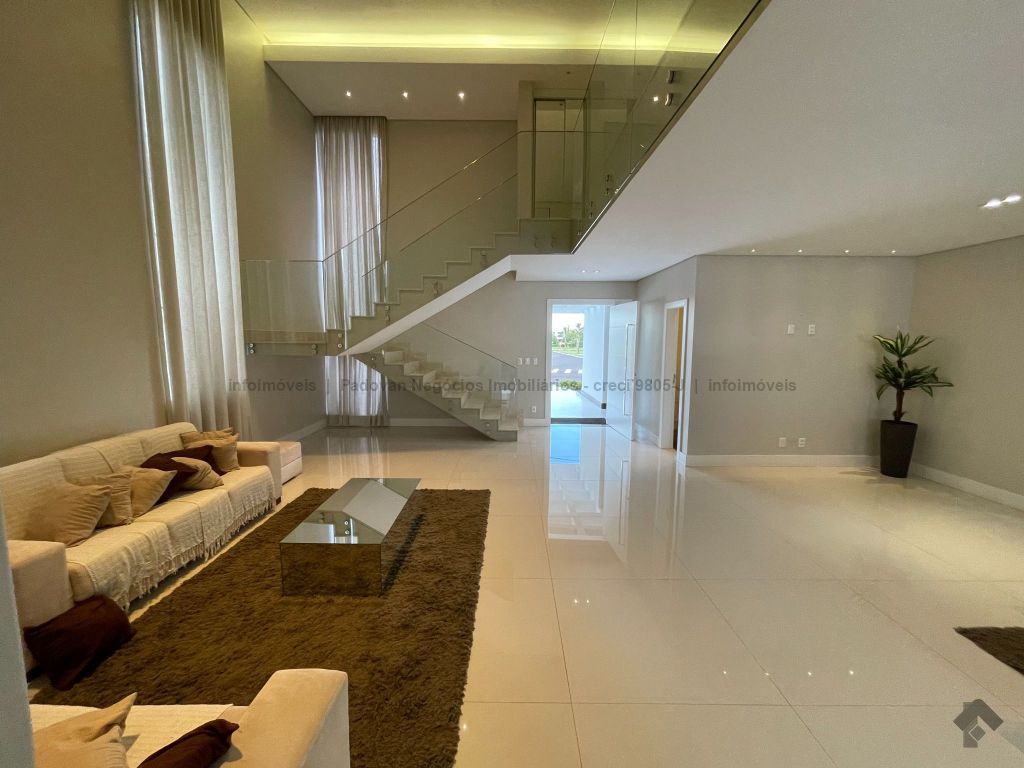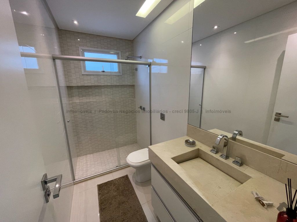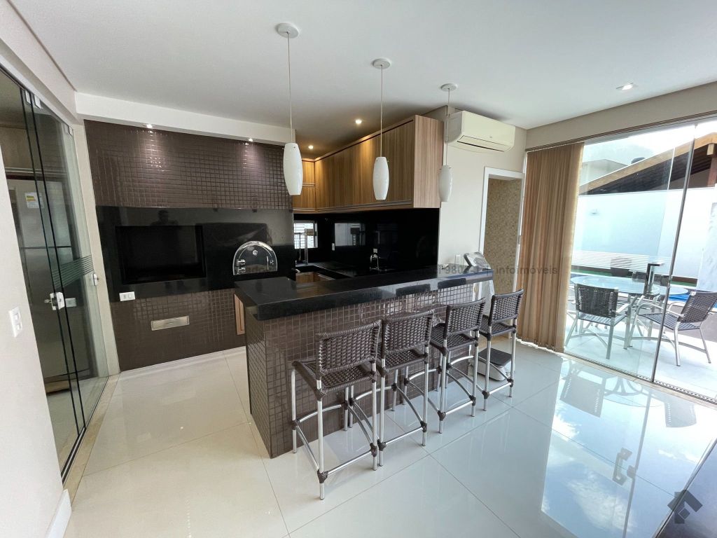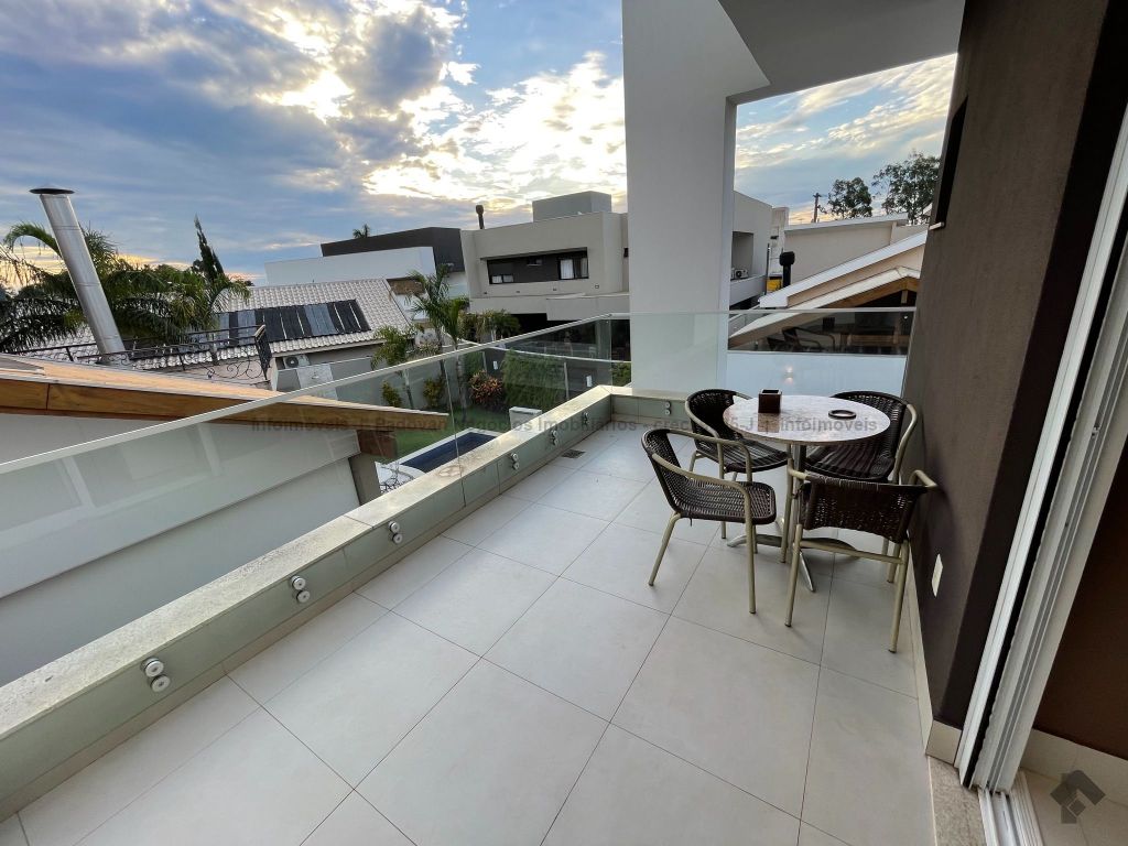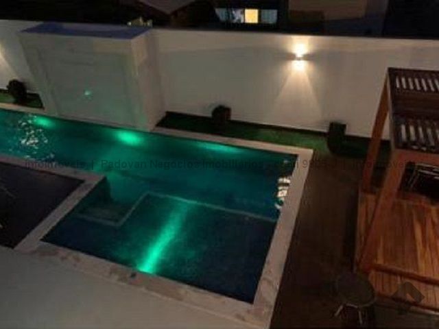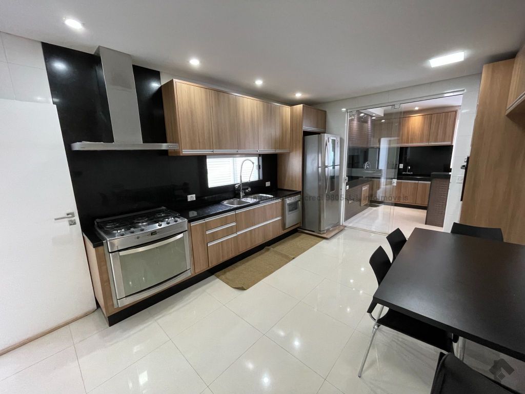 Sobrado bem localizado, próximo à guarita e sol da manhã, 7 vagas de garagem, sendo3 cobertas, sistema de segurança com 5 câmeras infravermelho de visão noturna com wi-fi pelo celular, aquecimento de água solar, a gás e elétrico, 3 suítes climatizadas, com persianas automatizadas e closet no andar superior, sendo uma master, todas com sacadas, sala ampla de estar e jantar com escadaria em mármore, lavabo, 1 suíte térrea com home office climatizado, área de serviço com wc e quarto de serviço climatizado com a/e, área gourmet climatizada com lavabo, mesa integrada de sinuca, ping pong e jantar, churrasqueira em granito preto, forno de pizza e bancada. Piscina aquecida com raia.