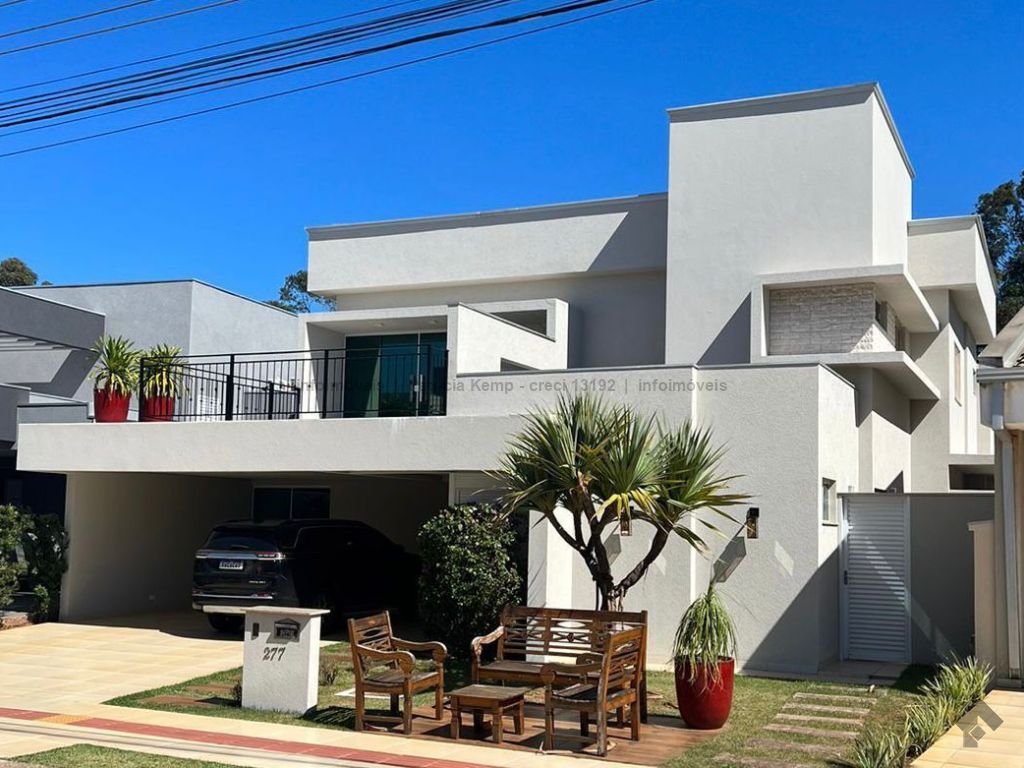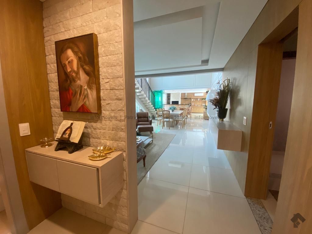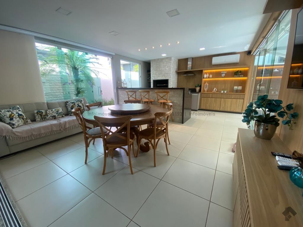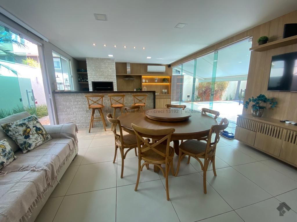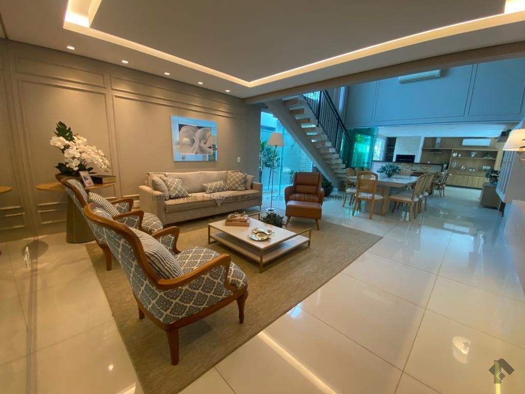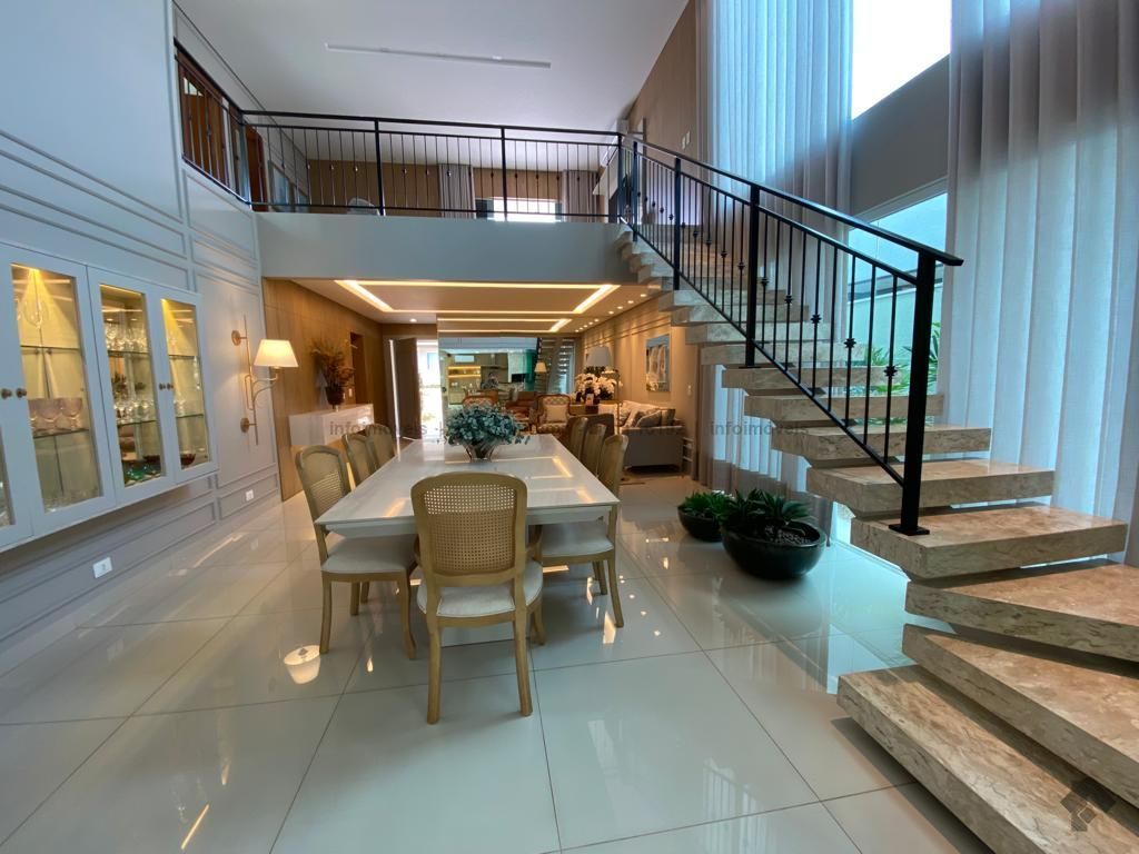 Sala com pé direito duplo para dois ambientes, três suítes com planejados, lavabo, espaço gourmet integrado, cozinha com planejados e lavanderia. Piso superior: sala de TV com ampla sacada, duas suítes com planejados, escritório com sacada, área externa, piscina aquecida, energia fotovoltaica.