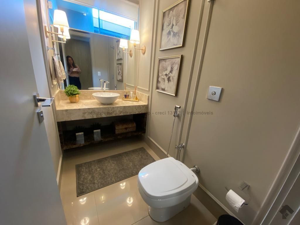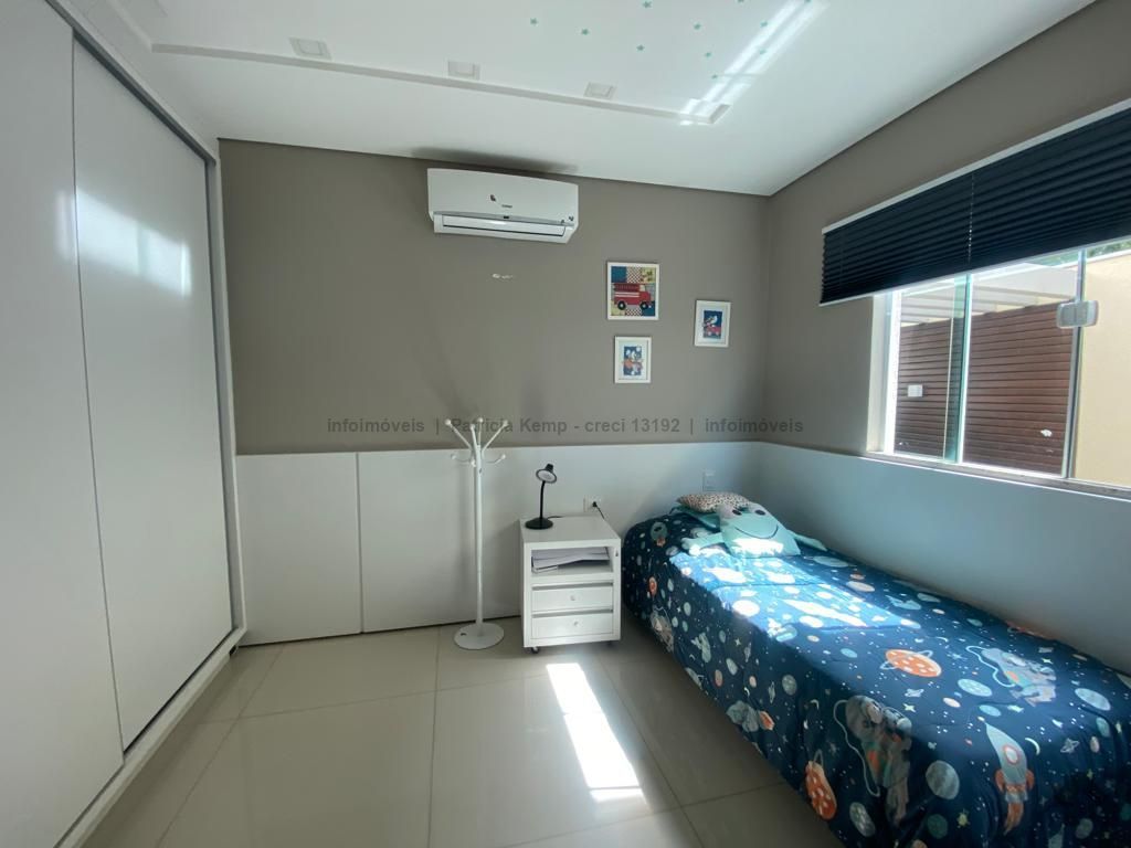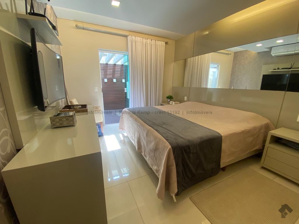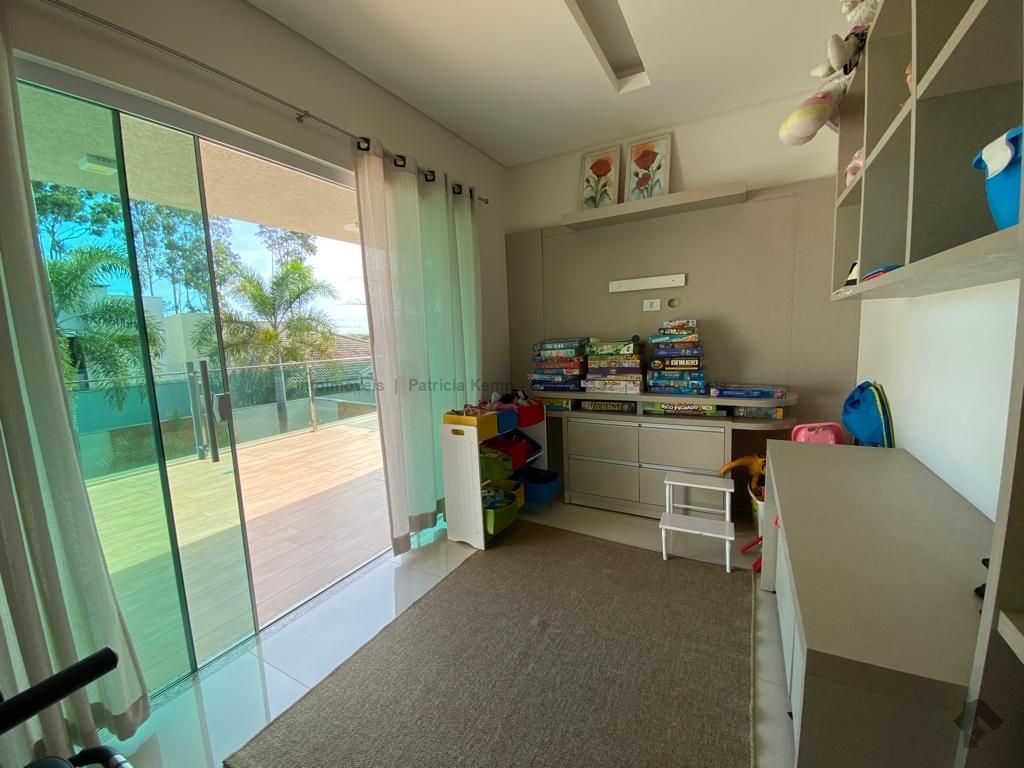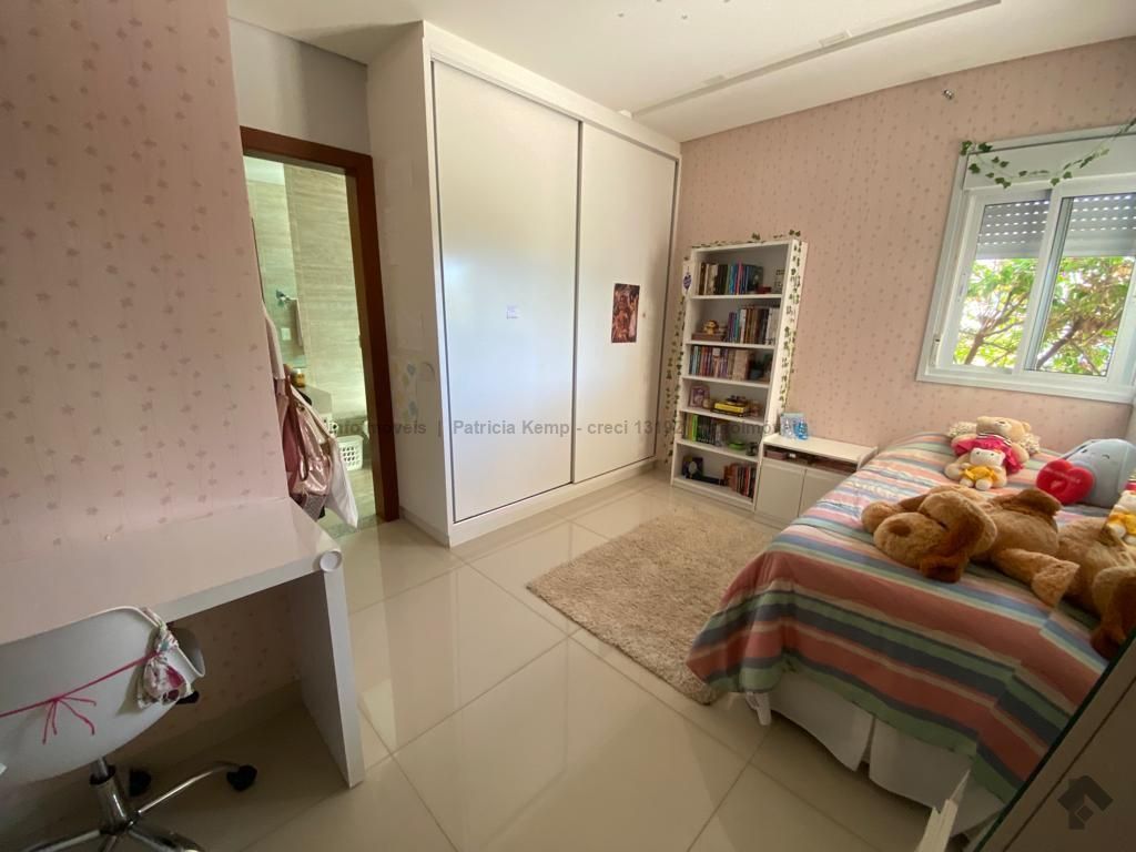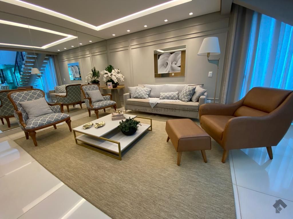 Sala com pé direito duplo para dois ambientes, três suítes com planejados, lavabo, espaço gourmet integrado, cozinha com planejados e lavanderia. Piso superior: sala de TV com ampla sacada, duas suítes com planejados, escritório com sacada, área externa, piscina aquecida, energia fotovoltaica.
