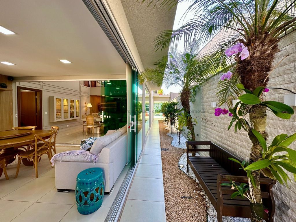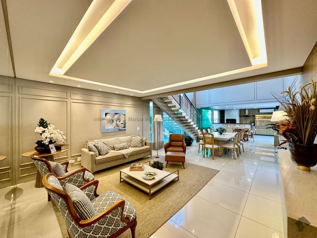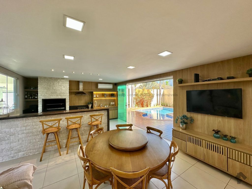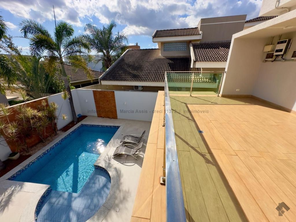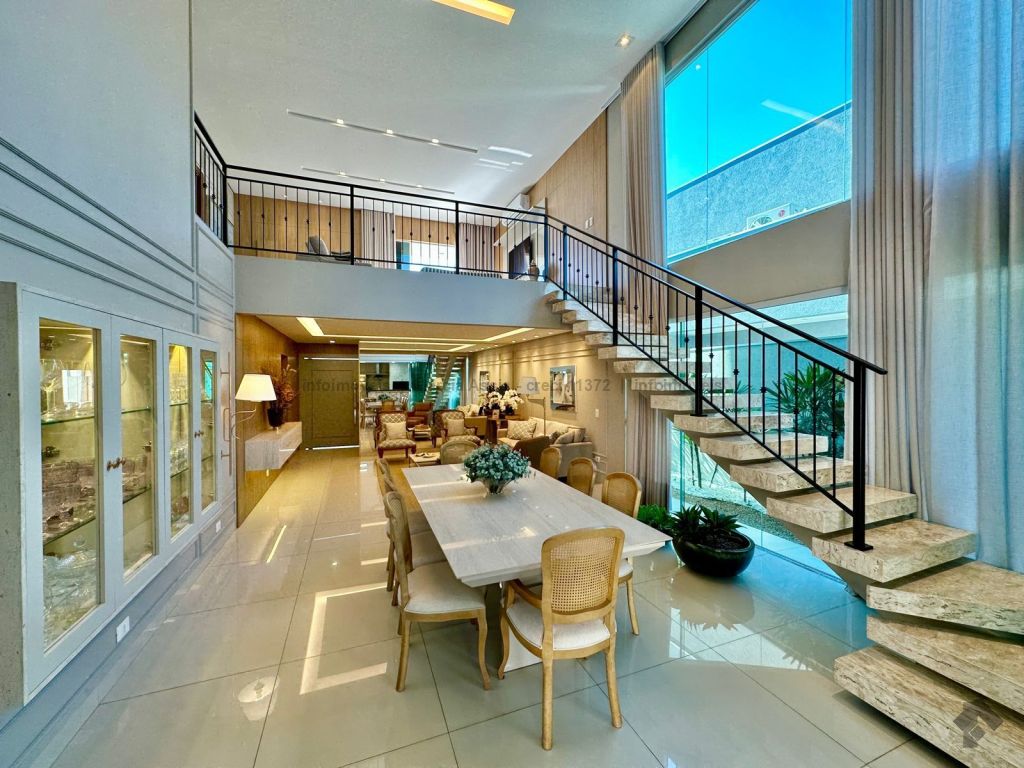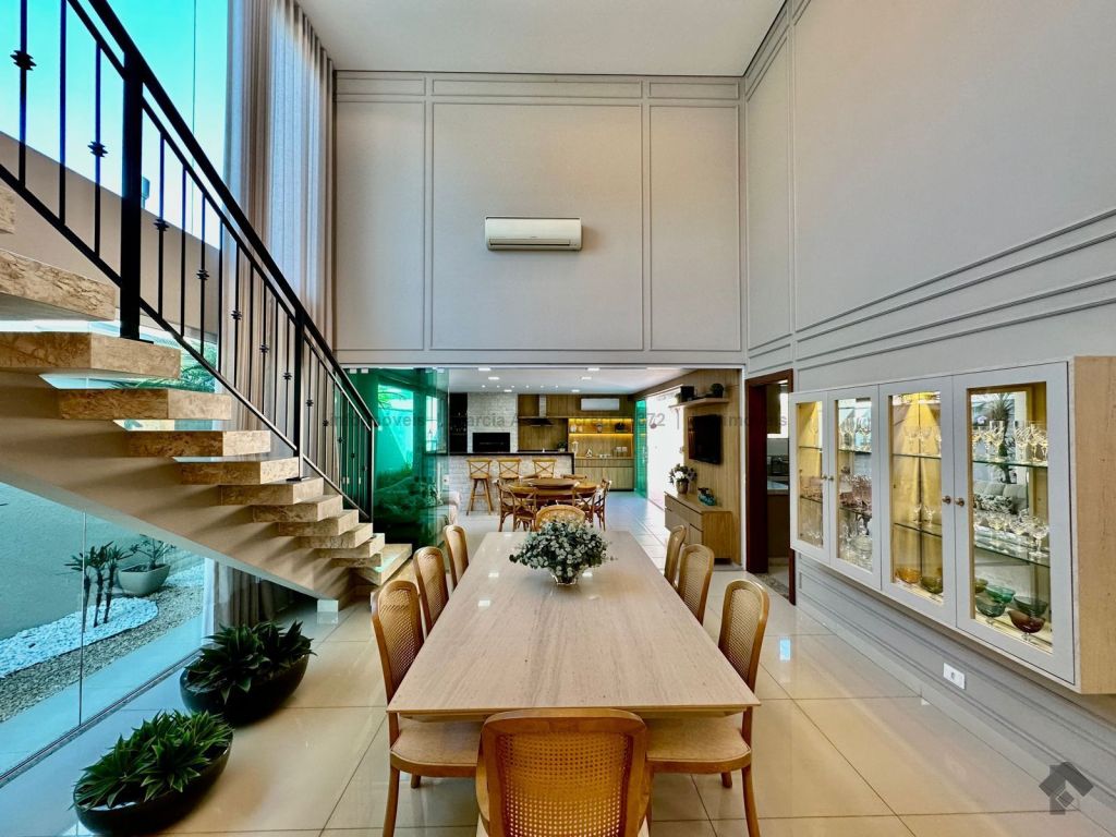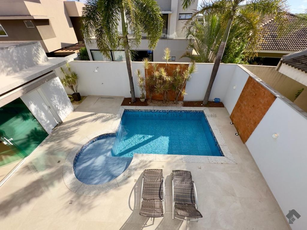 Espetacular sobrado com 5 suítes. Piso térreo: hall de entrada, lavabo, salas integradas dois ambientes com pé direito duplo. Um amplo espaço gourmet recém reformado, 3 suítes com armários planejados sendo a suíte máster com closet, banheiro com banheira, cozinha impecável, uma ampla lavanderia ao lado, banheiro externo e despensa, piscina aquecida com prainha, hidromassagem e com um incrível deck, jardinagem completa. Piso superior: sala de TV, com uma super sacada com vista para o condomínio, duas suítes e escritório ou brinquedoteca com sacada, vista para área de lazer, piscina. Imóvel com instalação de energia fotovoltaica 1.500 kWh ao mês.