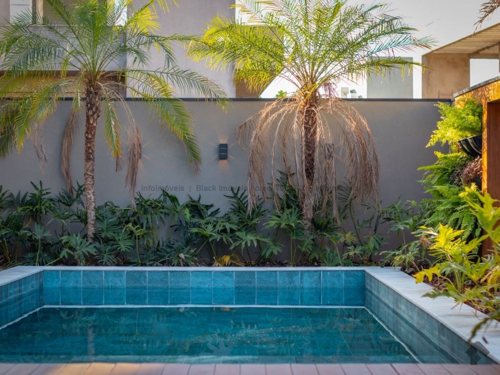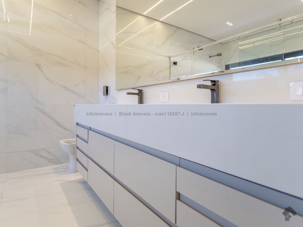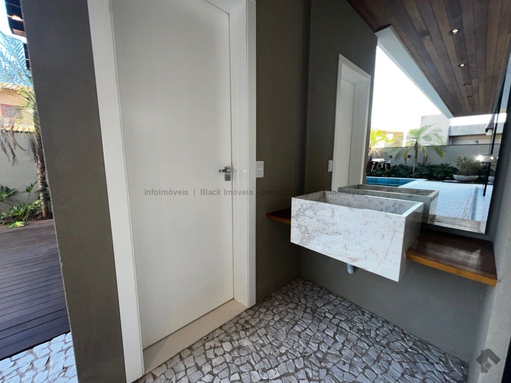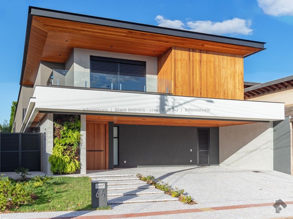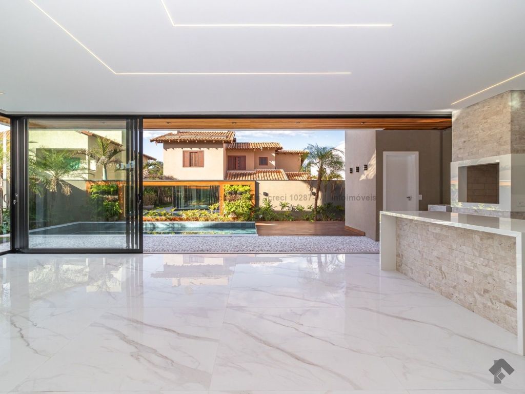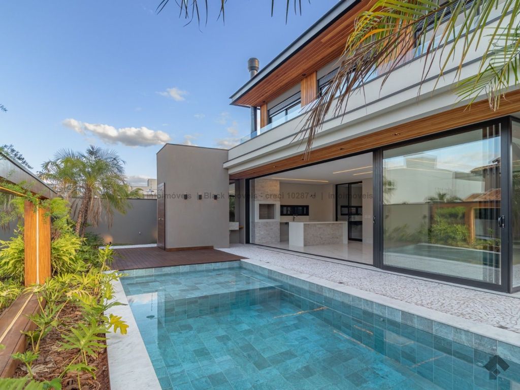 Sobrado com 5 suítes sendo 1 com closet, sacada e banheira dupla. Sala de cinema, living, lavabo, sala de jantar, gourmet, cozinha, lavanderia, 2 depósitos, wc da piscina, deck da piscina em madeira, piscina com prainha e hidromassagem. Garagem para 6 carros sendo 3 cobertas. Persianas automáticas com blackout.