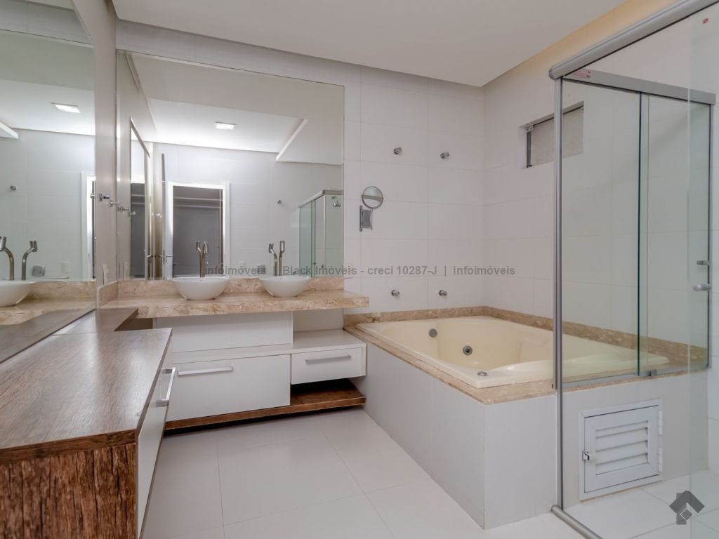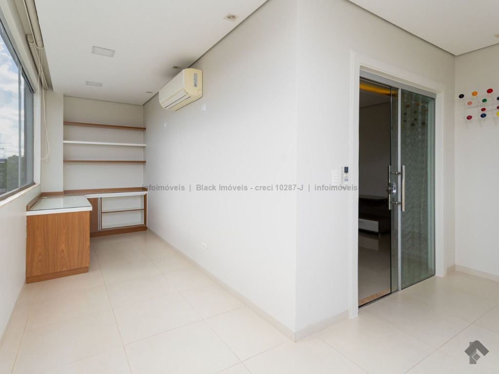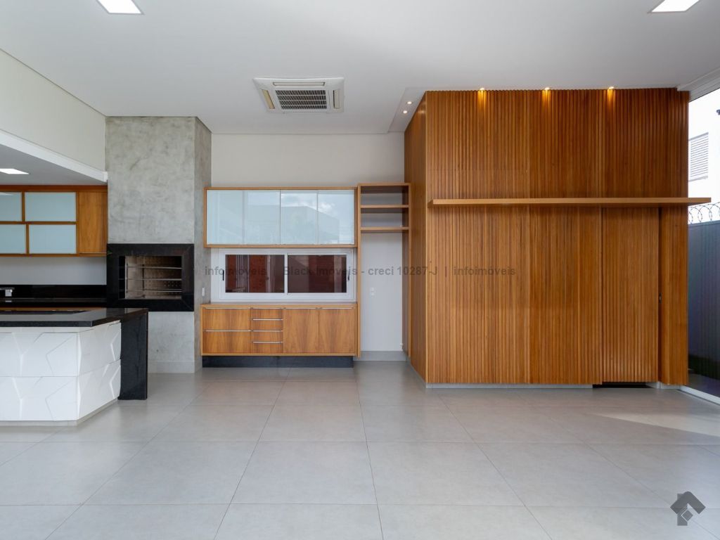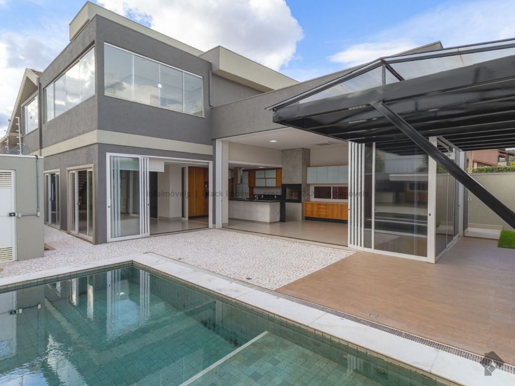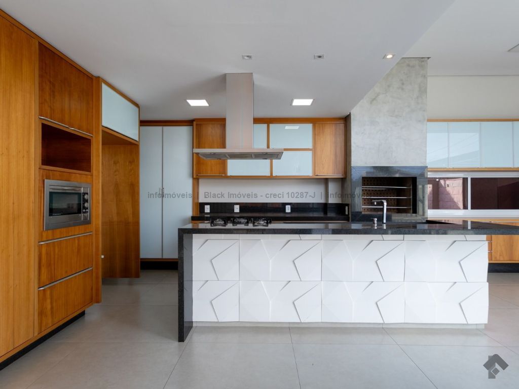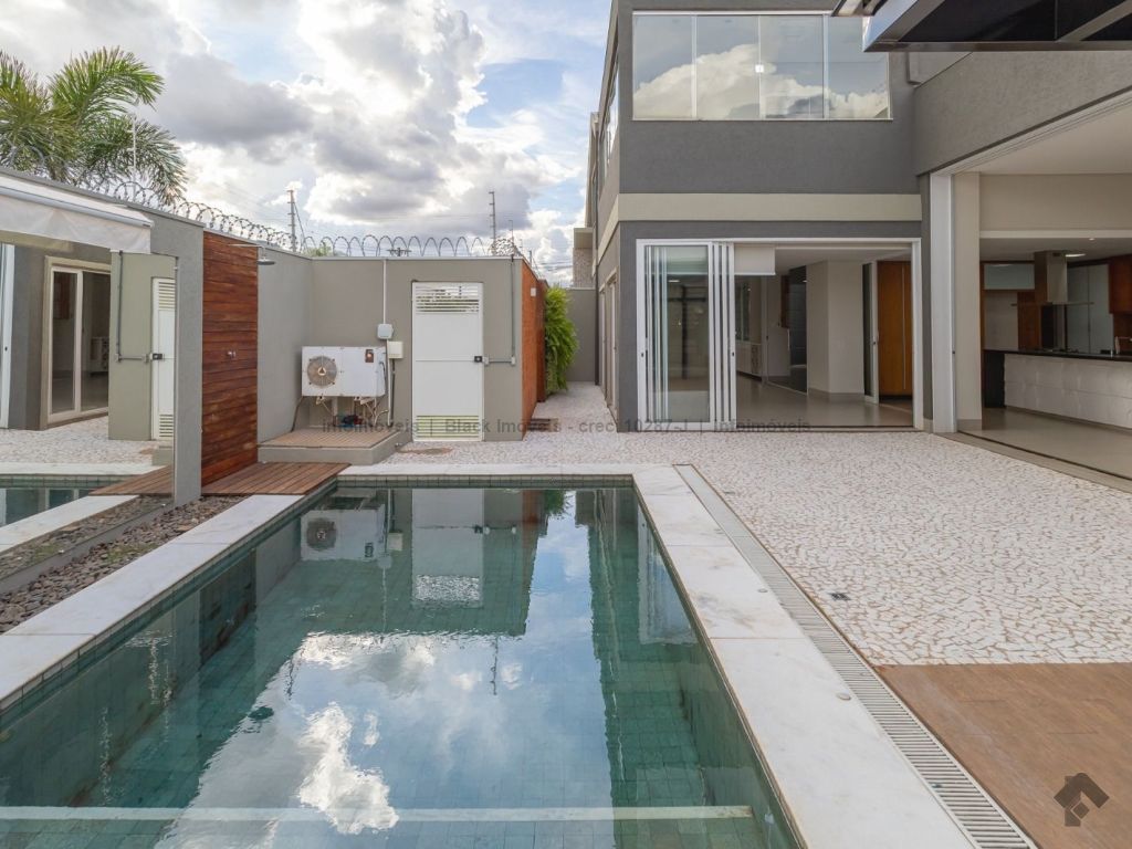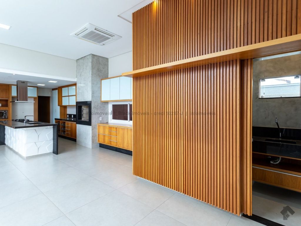 Sala ampla para três ambientes com planejados, lavabo, um escritório sem armário, contendo banheiro e ar condicionado, sala de TV com ar e ventilador, cozinha com planejados, com forno e cooktop, exaustor, ar condicionado cassete, espaço gourmet amplo com churrasqueira e planejado, lavanderia com planejados, piscina aquecida com boiler. Piso superior, sala de TV com ar e planejados, suítes master com closet, com hidro, sala íntima com ar e sacada, suíte com planejados com ar e sacada, suíte com planejados e ar condicionado, garagem para quatro veículos.