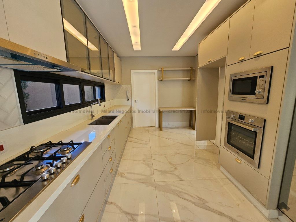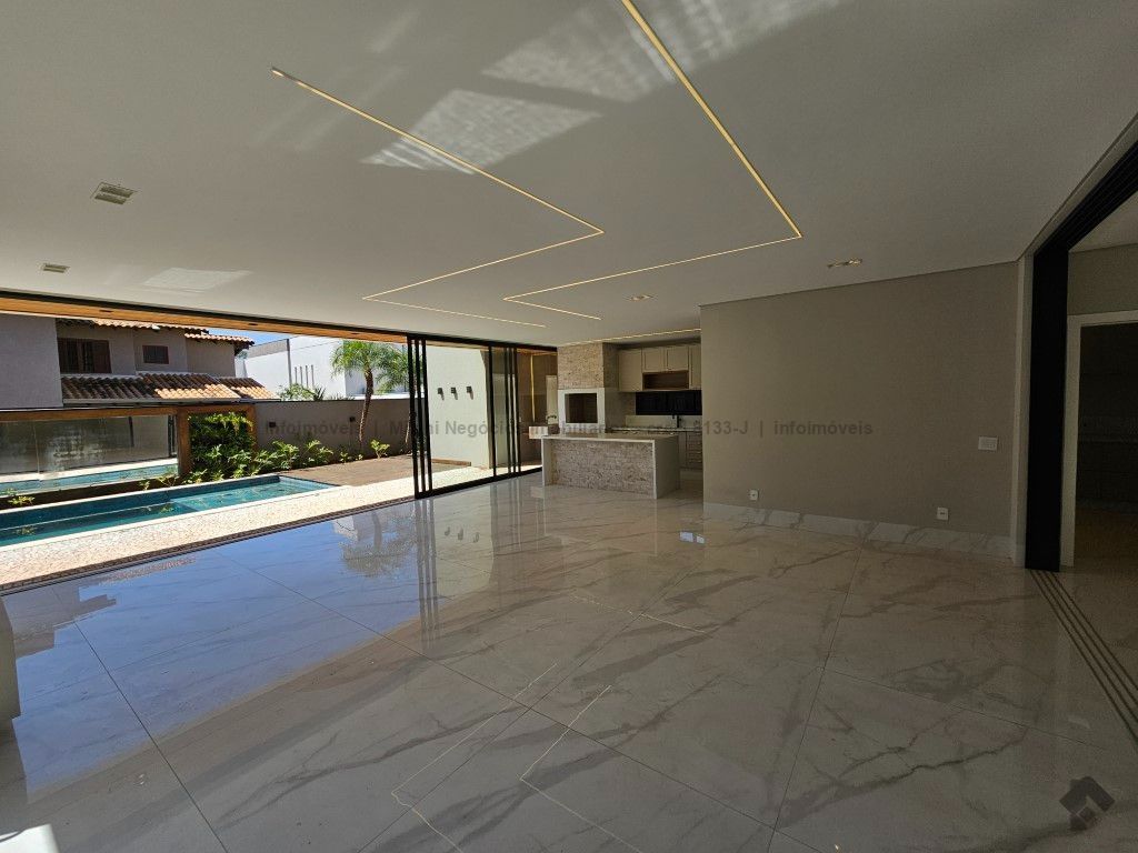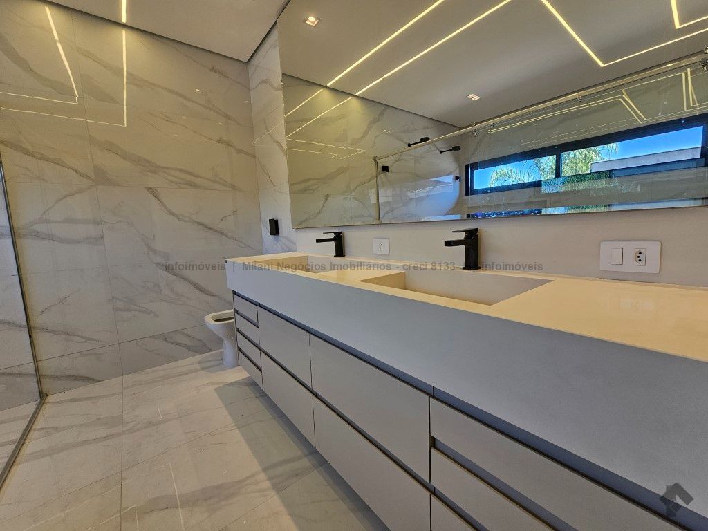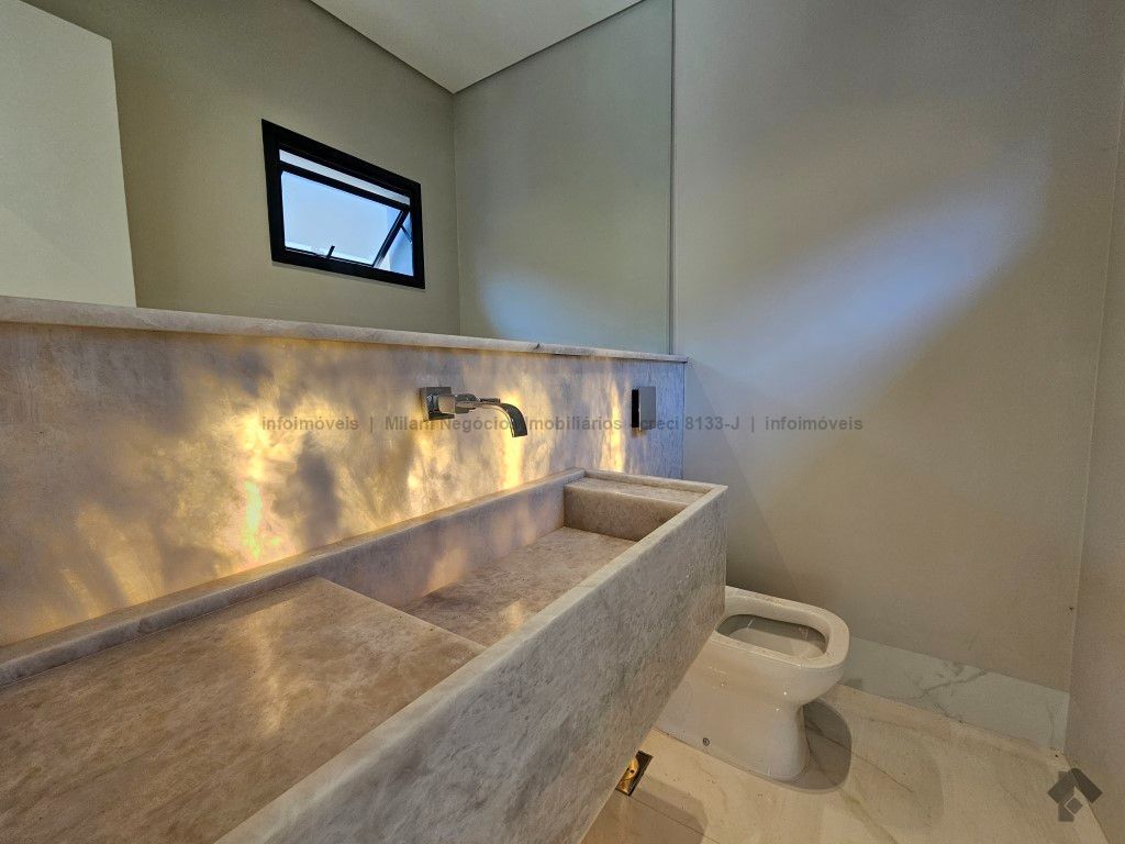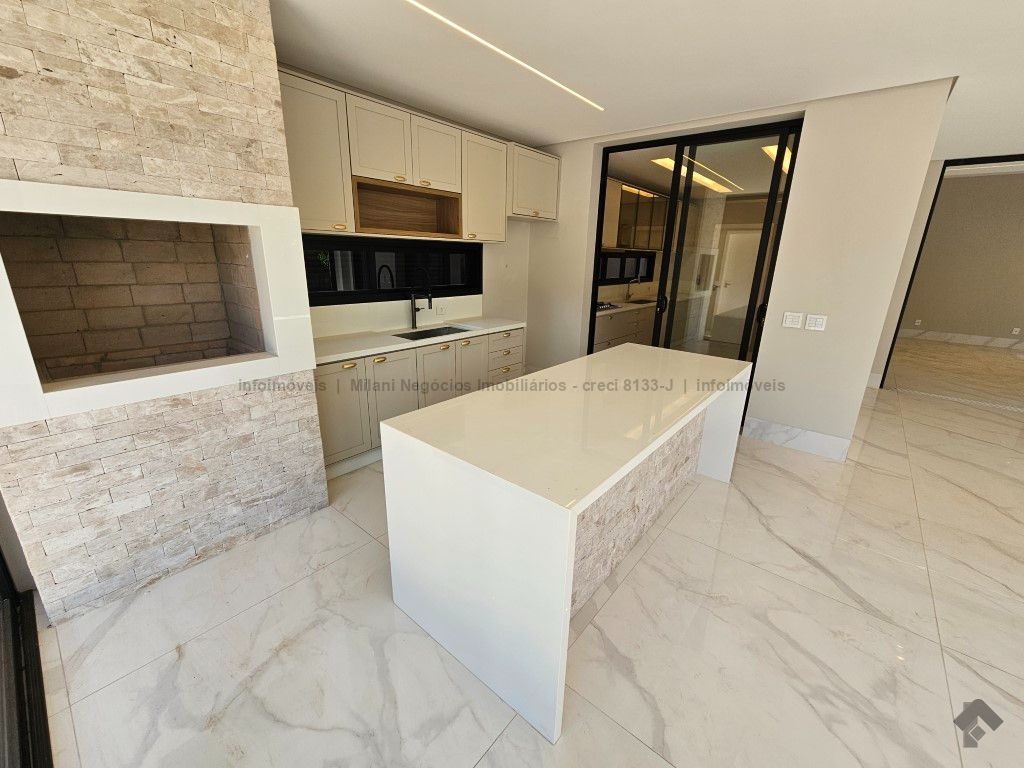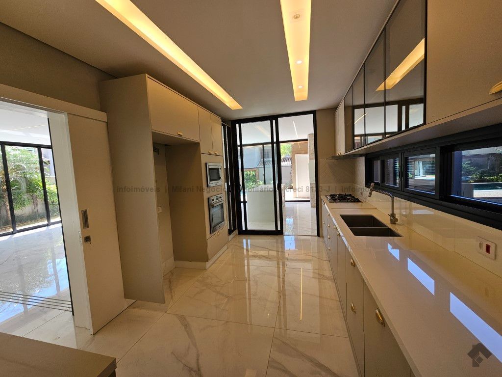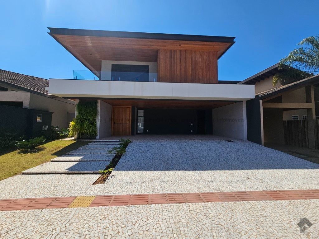 Sobrado de alto padrão com 05 suítes (01 no piso inferior), 01 home theater, living amplo com pé direito duplo, lavabo, espaço gourmet com bancada e ilha central, cozinha fechada com eletrodomésticos embutidos, despensa, WC de serviço na área gourmet/piscina, depósito. Acabamentos premium com piso 120 x 120 cm, bancadas supernanoglass, white plus (Fornari), mármore Michelangelo Nuvolato. 03 vagas de garagem coberta.