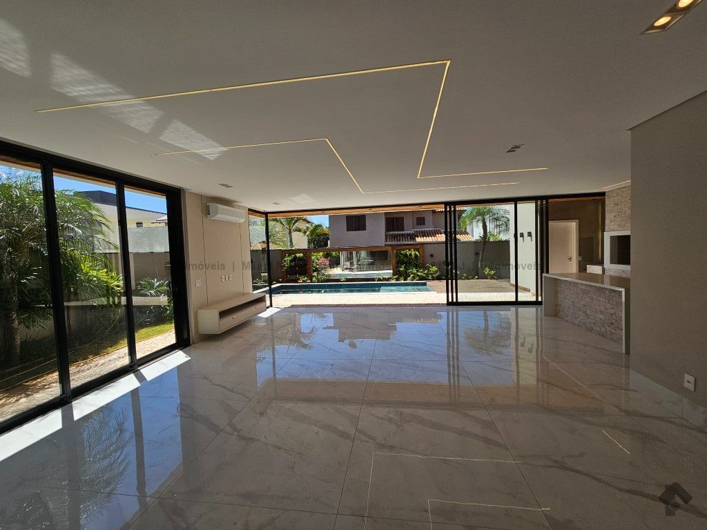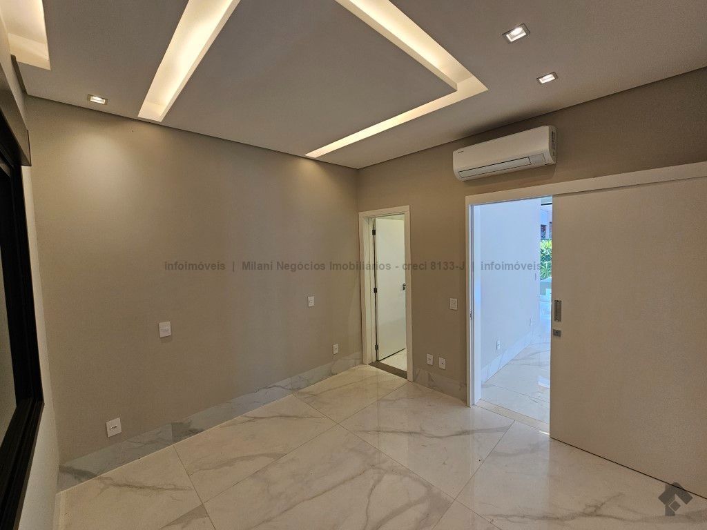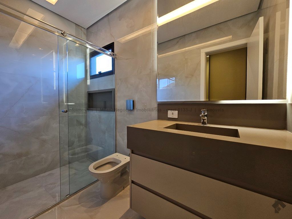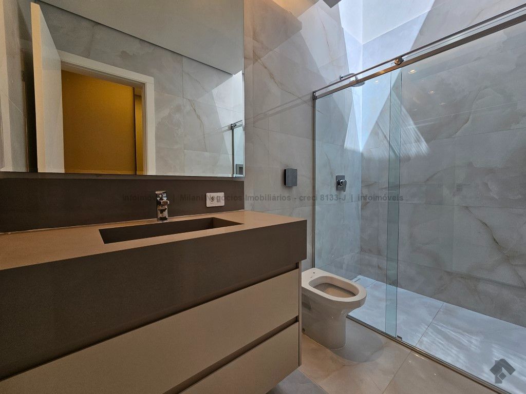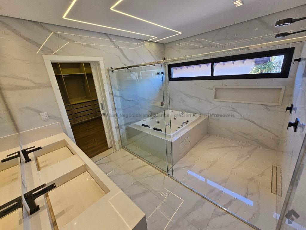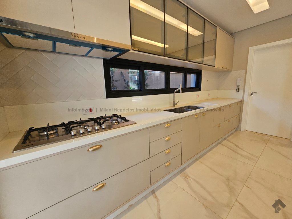 Sobrado de alto padrão com 05 suítes (01 no piso inferior), 01 home theater, living amplo com pé direito duplo, lavabo, espaço gourmet com bancada e ilha central, cozinha fechada com eletrodomésticos embutidos, despensa, WC de serviço na área gourmet/piscina, depósito. Acabamentos premium com piso 120 x 120 cm, bancadas supernanoglass, white plus (Fornari), mármore Michelangelo Nuvolato. 03 vagas de garagem coberta.