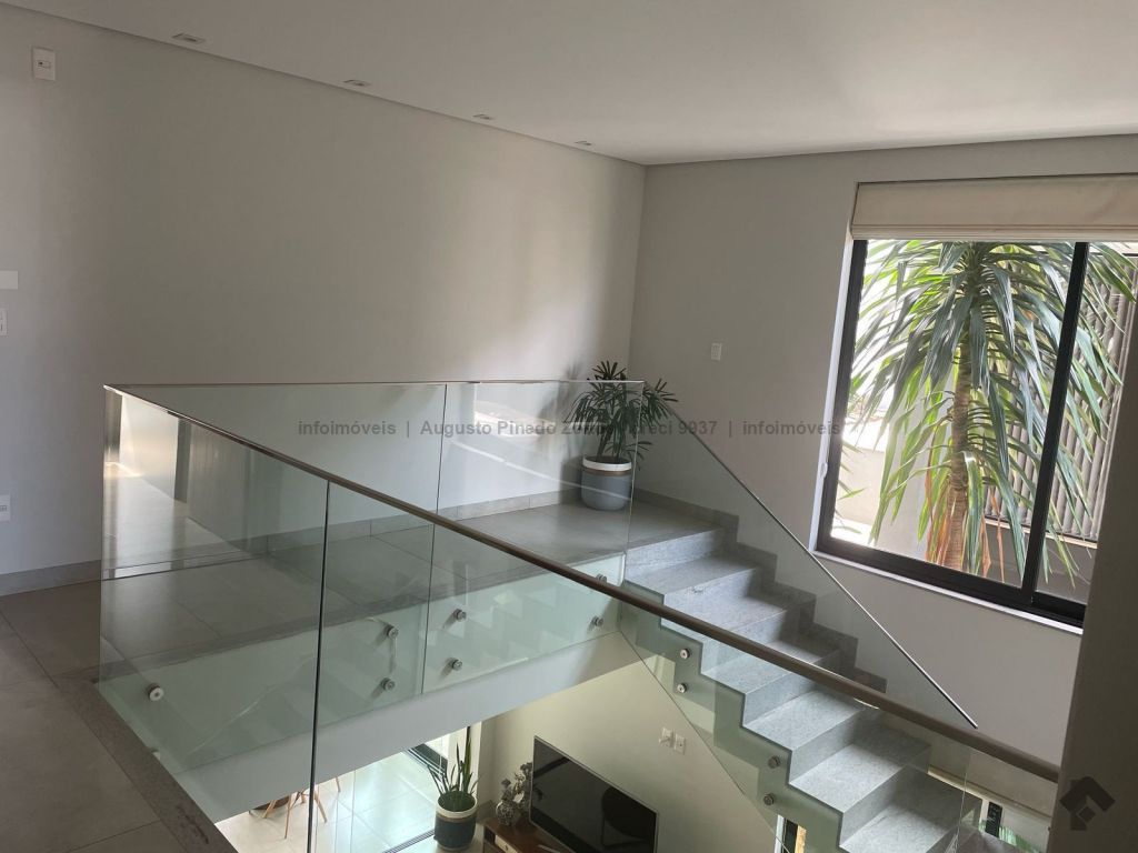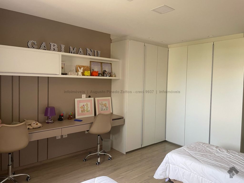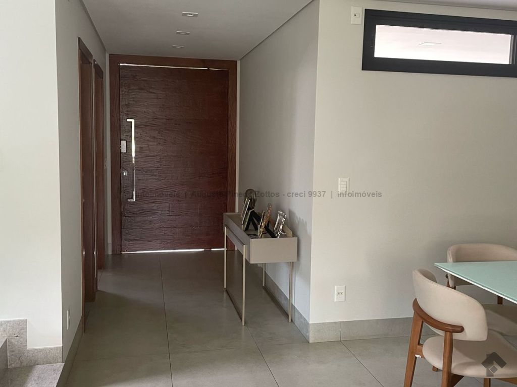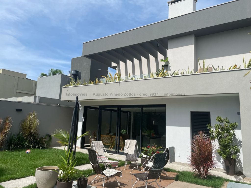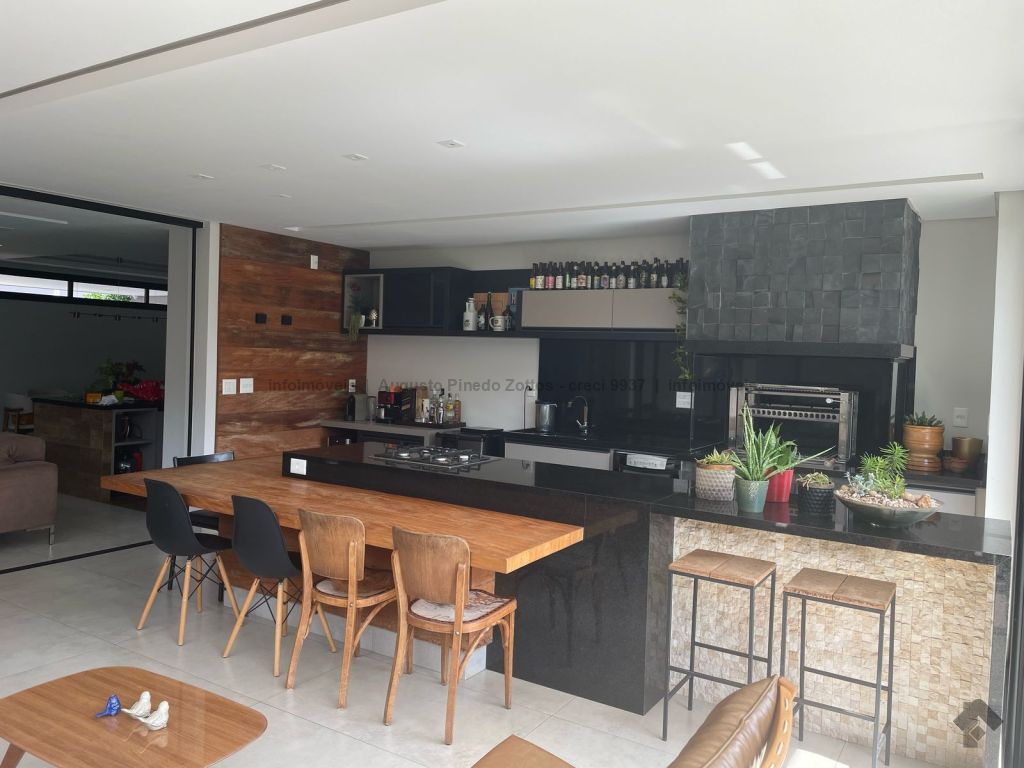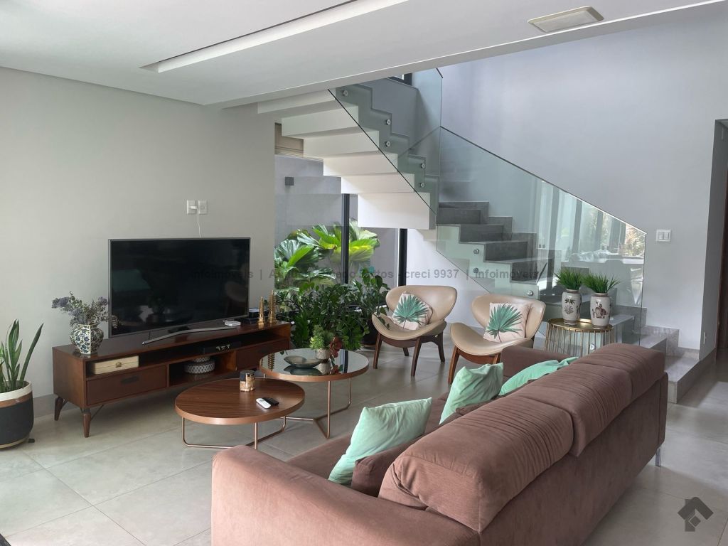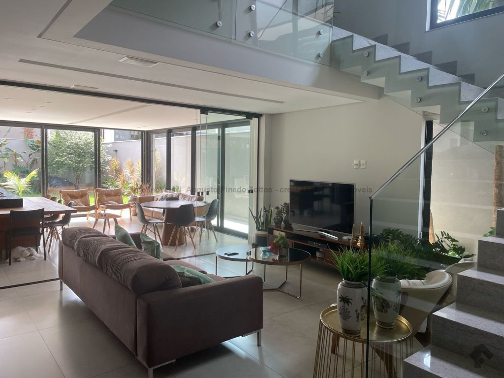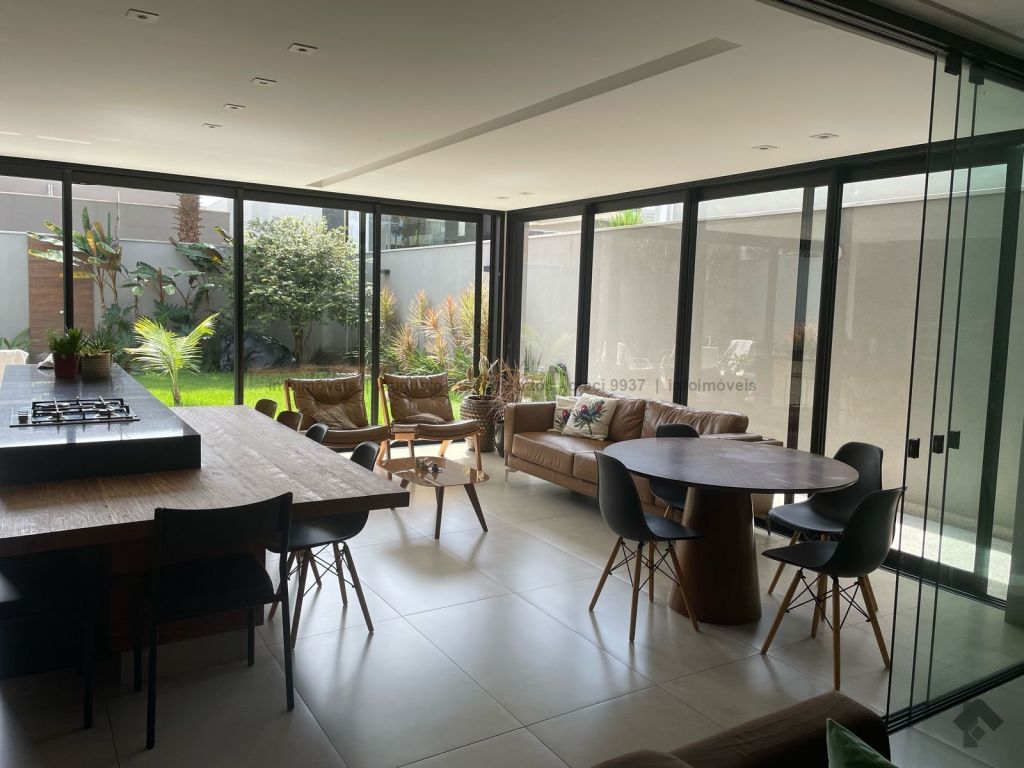 Possui 4 suítes e 5 banheiros amplos, sendo 3 suítes no pavimento superior (suíte casal com 17 m², closet com 12,5 m² mobiliado e terraço com 11,3 m², suíte 2 com 18,7 m² decorada e suíte 3 com 18,4 m²), 1 semi-suíte/escritório no pavimento inferior com 11,4 m², amplo ambiente integrado com cozinha/sala de jantar/sala de TV/área gourmet com área total de 83,5 m² equipado com fartos armários, duas ilhas, churrasqueira, 2 cooktops, coifa e forno elétrico, área de serviço funcional, cômodo de depósito, piscina aquecida e amplo jardim. Não é casa de construtor, telhado em laje impermeabilizada, todas as janelas e varandas com esquadrias em perfil de alumínio (zero infiltração).