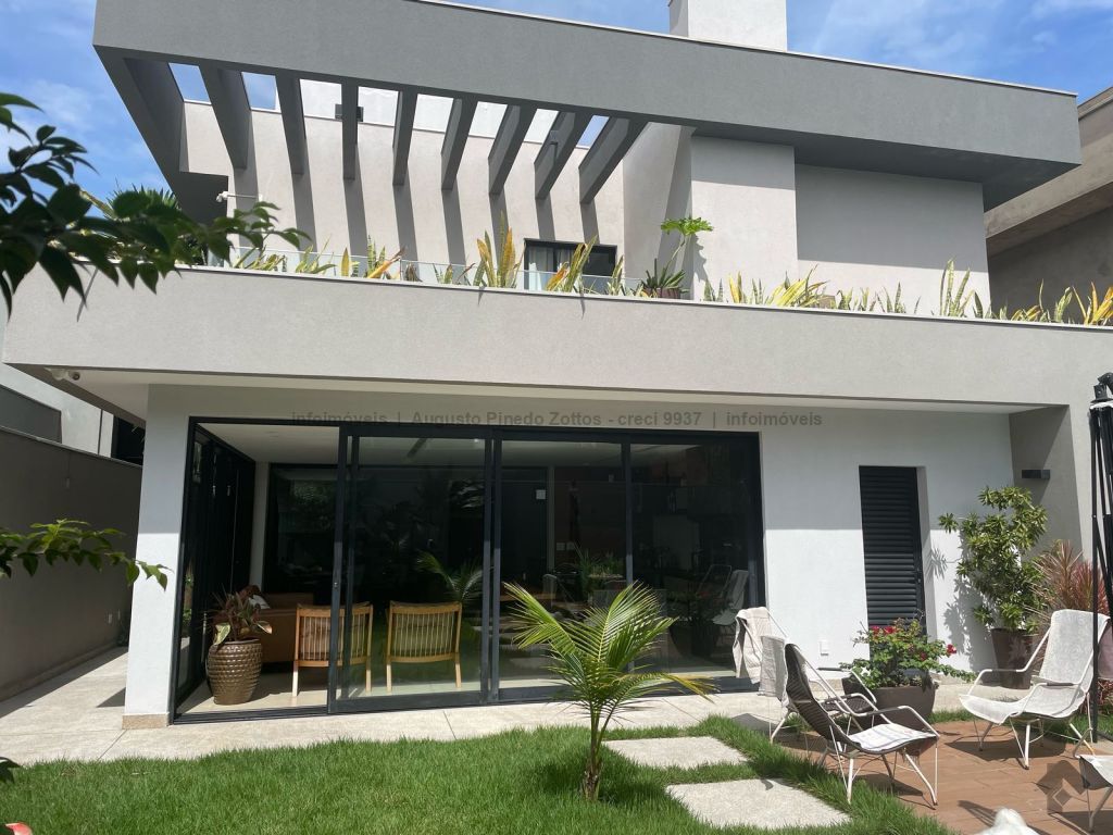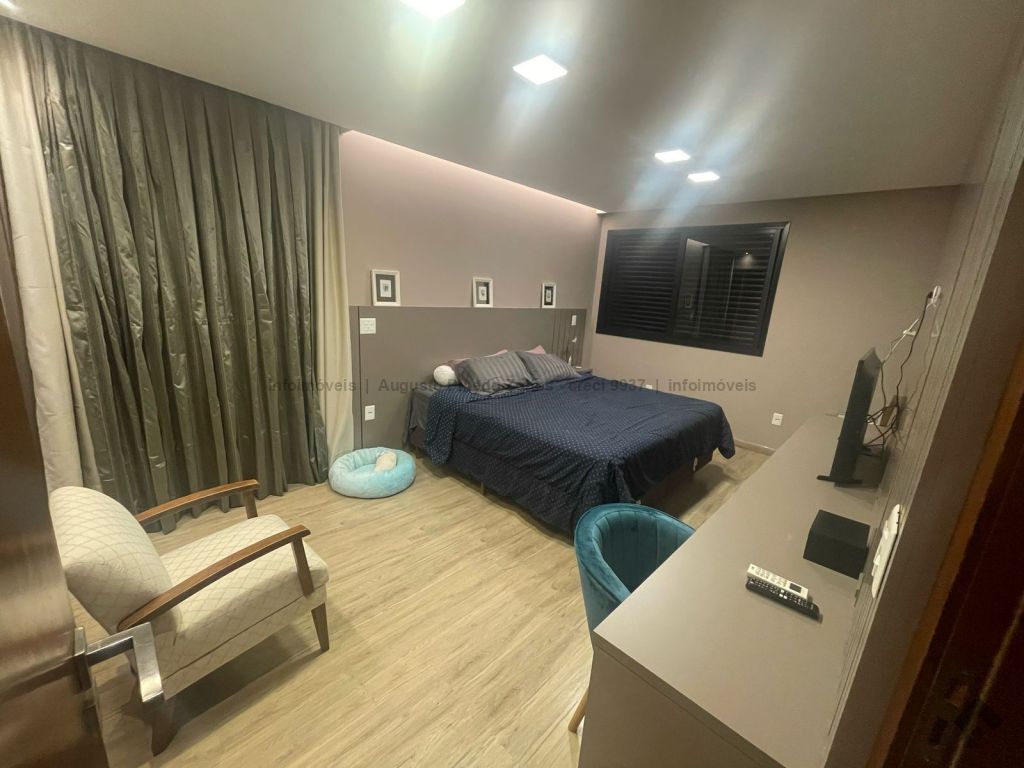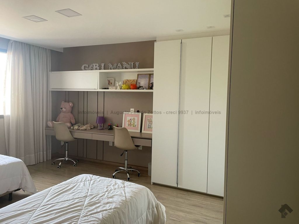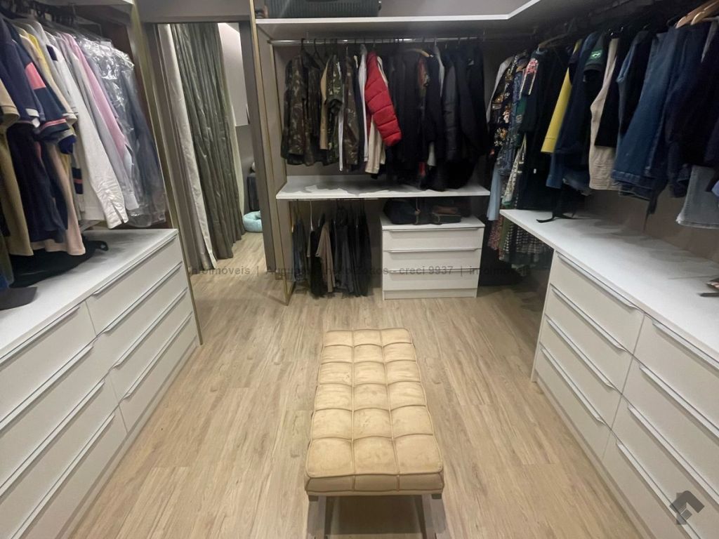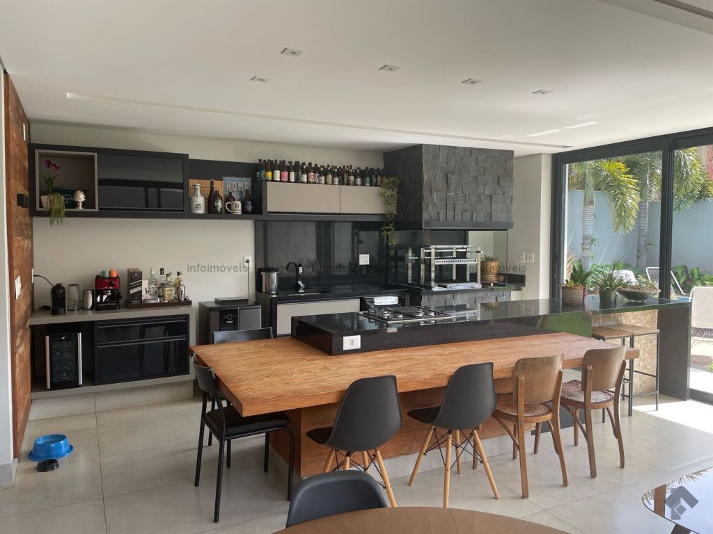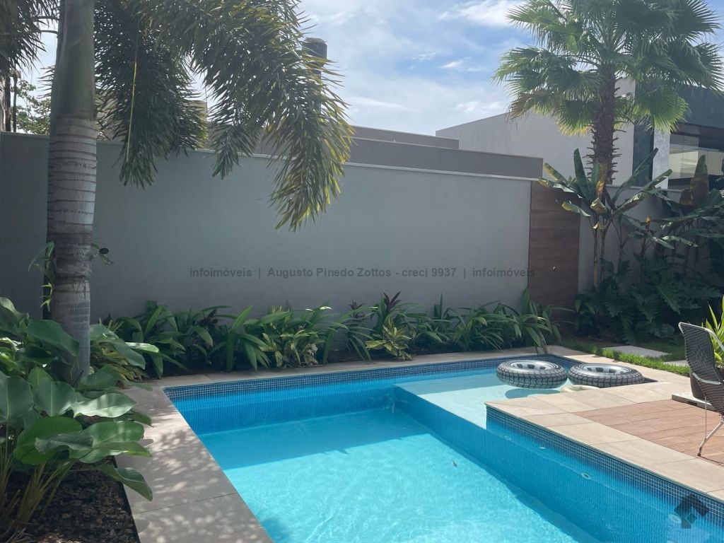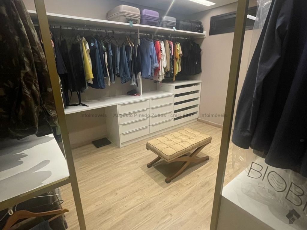 Possui 4 suítes e 5 banheiros amplos, sendo 3 suítes no pavimento superior (suíte casal com 17 m², closet com 12,5 m² mobiliado e terraço com 11,3 m², suíte 2 com 18,7 m² decorada e suíte 3 com 18,4 m²), 1 semi-suíte/escritório no pavimento inferior com 11,4 m², amplo ambiente integrado com cozinha/sala de jantar/sala de TV/área gourmet com área total de 83,5 m² equipado com fartos armários, duas ilhas, churrasqueira, 2 cooktops, coifa e forno elétrico, área de serviço funcional, cômodo de depósito, piscina aquecida e amplo jardim. Não é casa de construtor, telhado em laje impermeabilizada, todas as janelas e varandas com esquadrias em perfil de alumínio (zero infiltração).