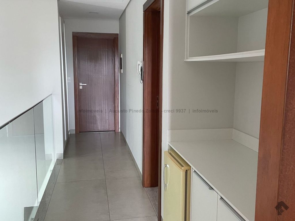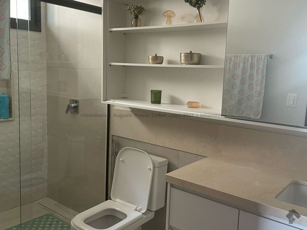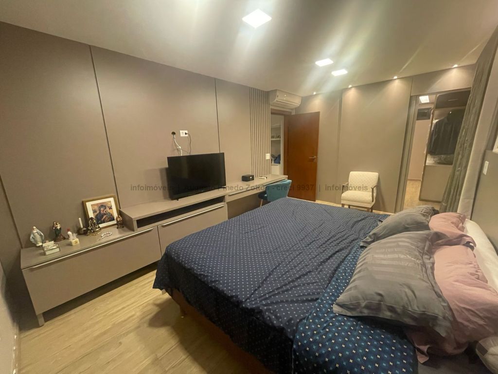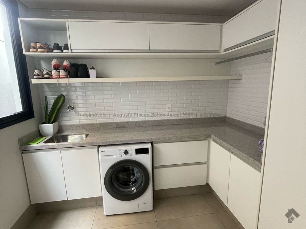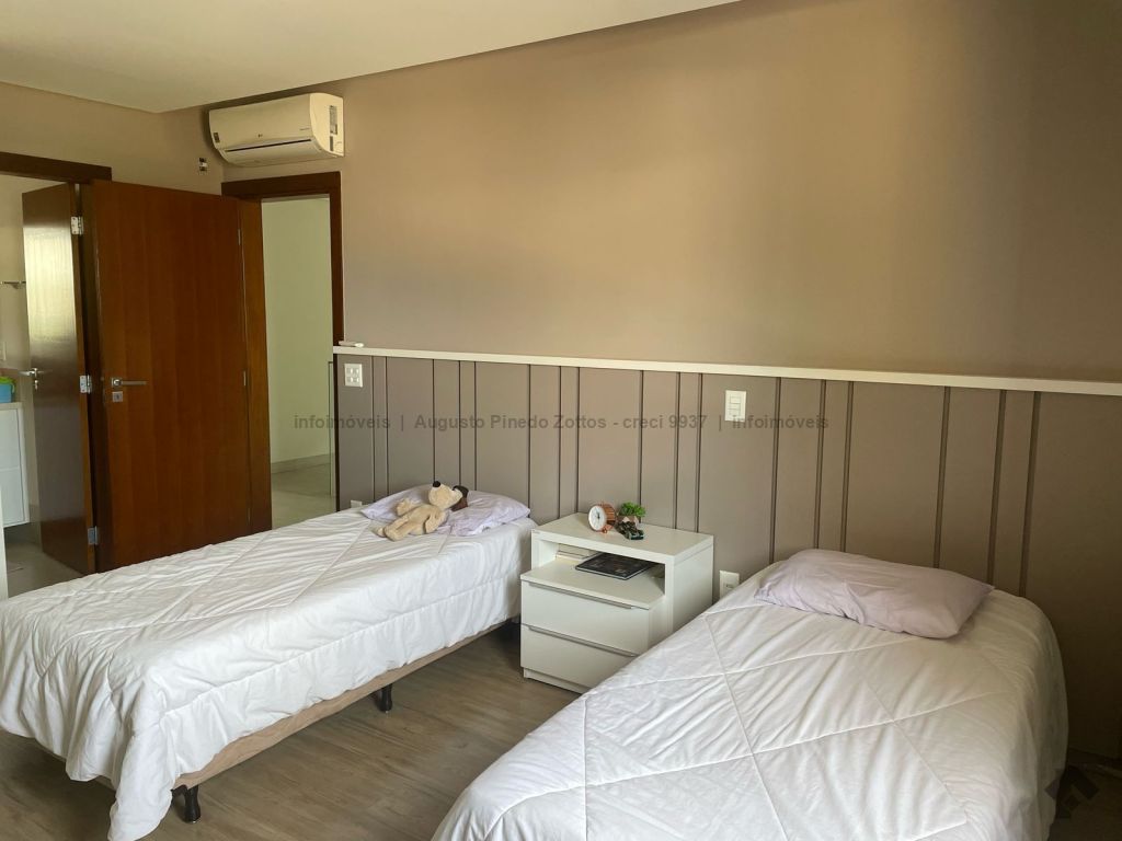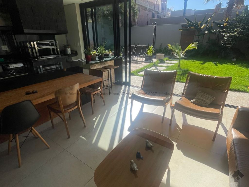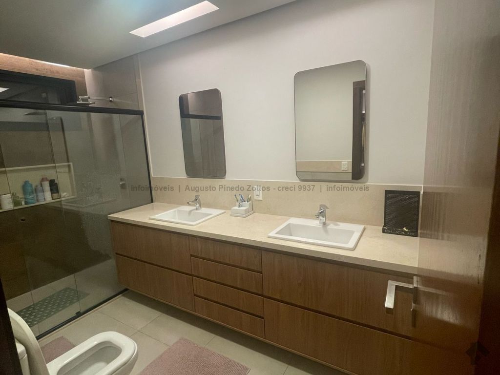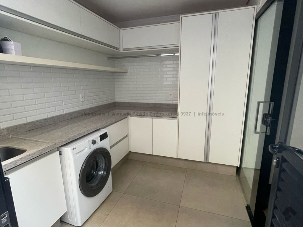 Possui 4 suítes e 5 banheiros amplos, sendo 3 suítes no pavimento superior (suíte casal com 17 m², closet com 12,5 m² mobiliado e terraço com 11,3 m², suíte 2 com 18,7 m² decorada e suíte 3 com 18,4 m²), 1 semi-suíte/escritório no pavimento inferior com 11,4 m², amplo ambiente integrado com cozinha/sala de jantar/sala de TV/área gourmet com área total de 83,5 m² equipado com fartos armários, duas ilhas, churrasqueira, 2 cooktops, coifa e forno elétrico, área de serviço funcional, cômodo de depósito, piscina aquecida e amplo jardim. Não é casa de construtor, telhado em laje impermeabilizada, todas as janelas e varandas com esquadrias em perfil de alumínio (zero infiltração).