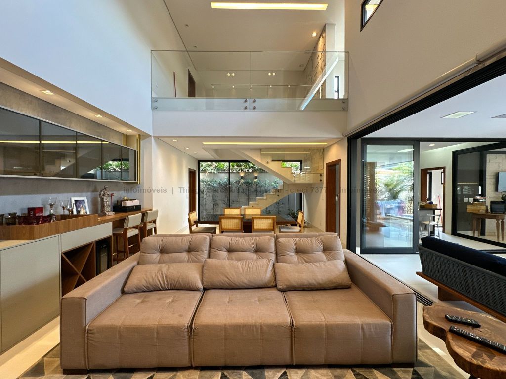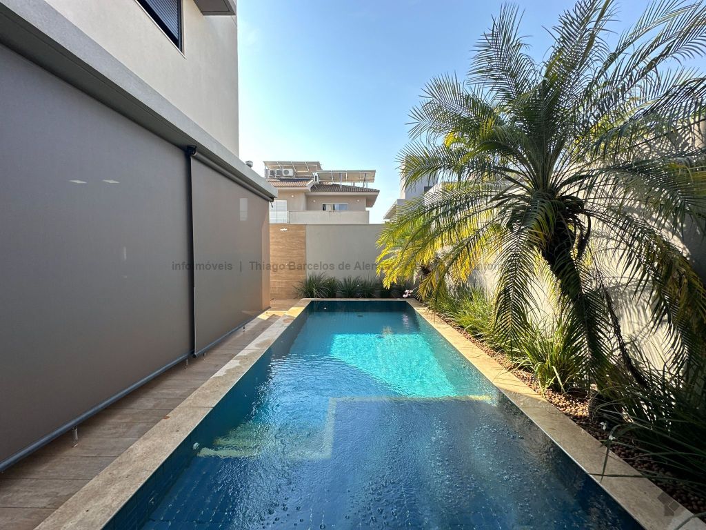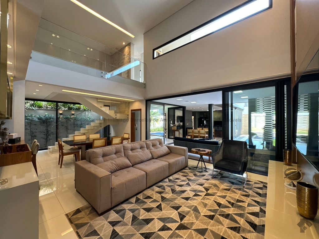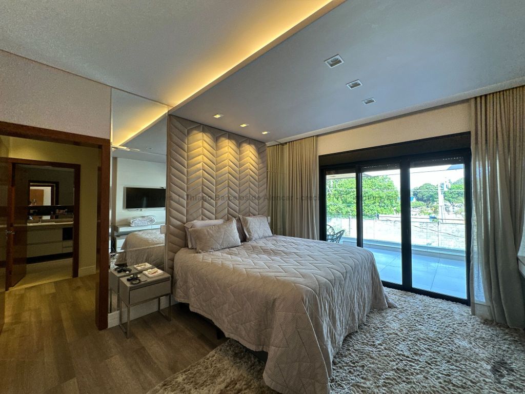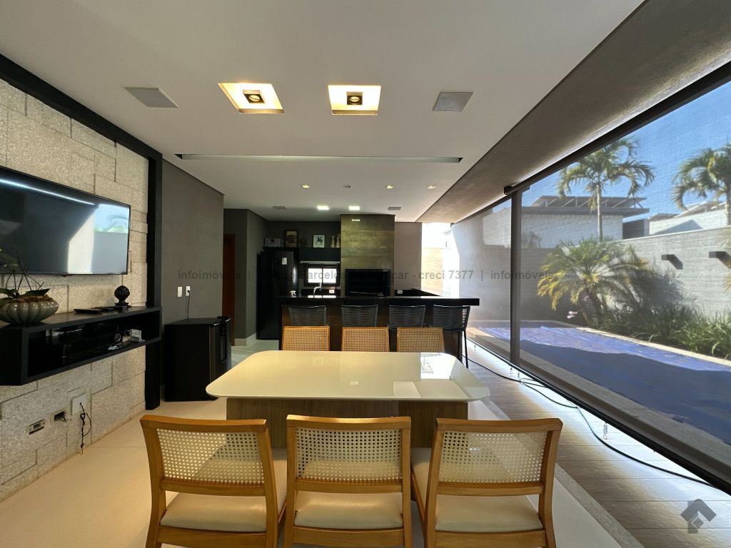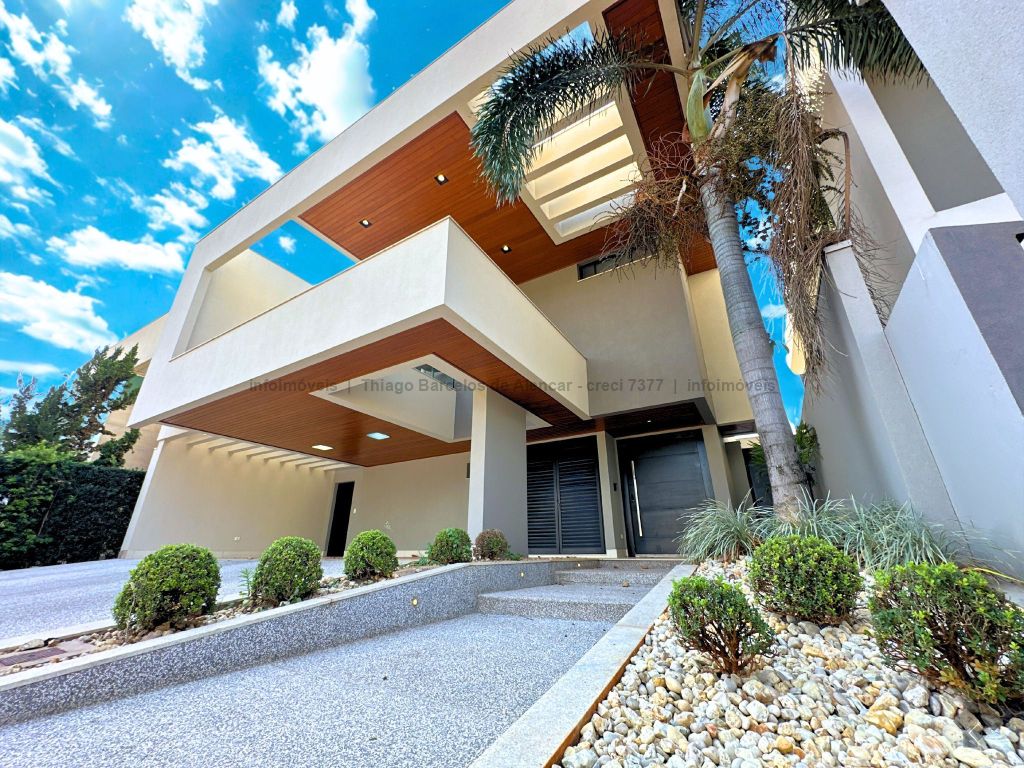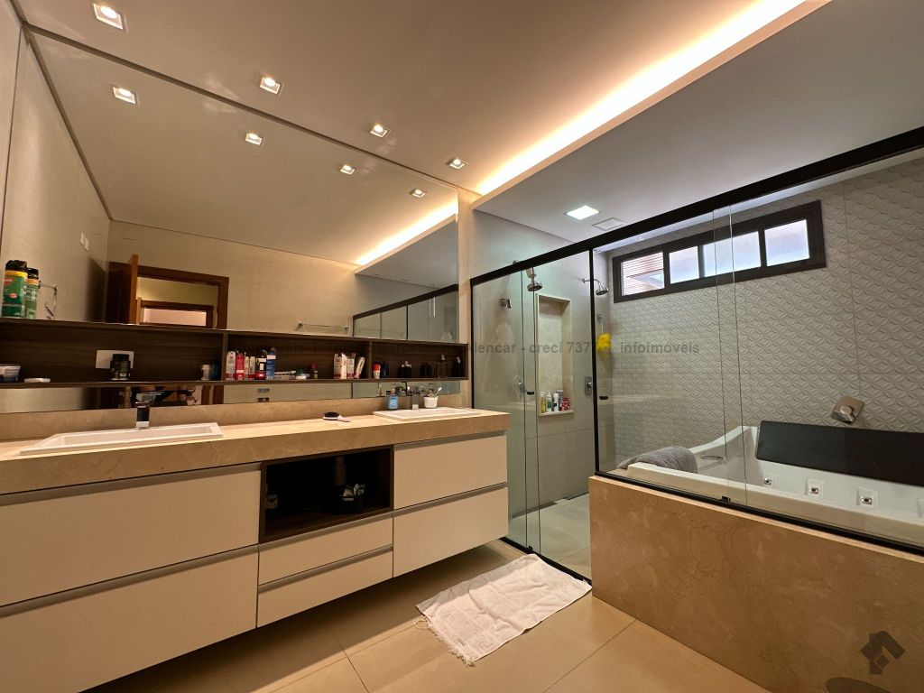 Sobrado com 4 suítes, sendo 1 máster com closet e sacada. Sala de estar, jantar e TV, além de home theater. Living com pé-direito duplo, lavabo e cozinha planejada. Conta com área de serviço, lavanderia, depósito e WC social. Área gourmet com churrasqueira e integração ao lazer. Piscina aquecida, hidromassagem e paisagismo. Diferenciais: aquecimento solar, armários embutidos, 4 vagas de garagem e ambientes bem distribuídos para garantir funcionalidade e conforto.