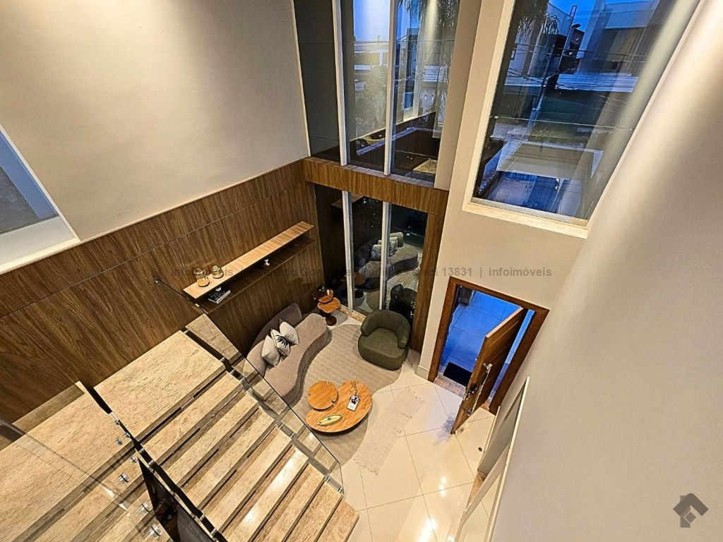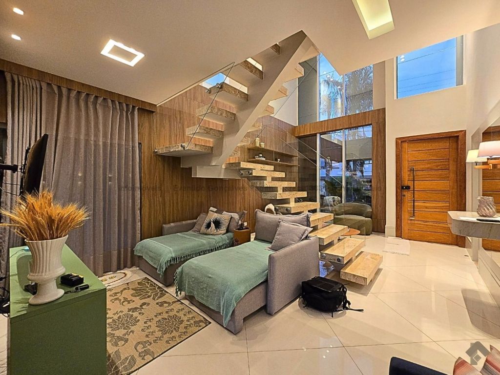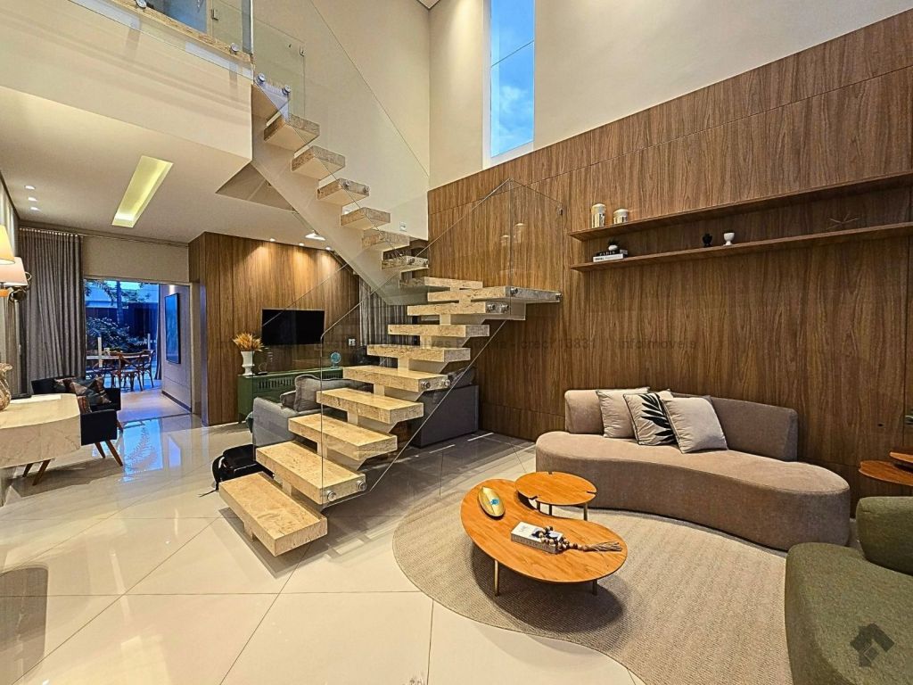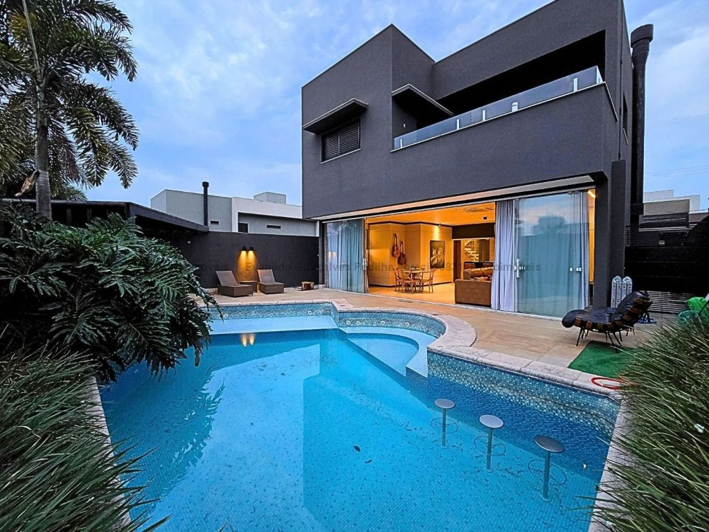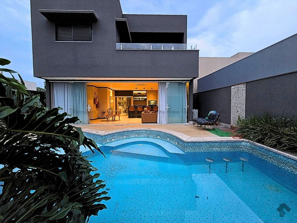 No piso inferior, o imóvel conta com ampla sala para 2 ambientes, lavabo, cozinha com ilha e armários planejados, área de serviço funcional e escritório privativo. O espaço gourmet climatizado integra-se à área externa, proporcionando um ambiente ideal para receber amigos e familiares, com espaço de TV e banheiro de apoio. A piscina aquecida de 33 m², com hidromassagem, garante momentos de lazer e relaxamento. Garagem para até 4 veículos. No piso superior, são 3 suítes confortáveis, sendo a suíte master com closet e varanda privativa, proporcionando mais conforto e privacidade.