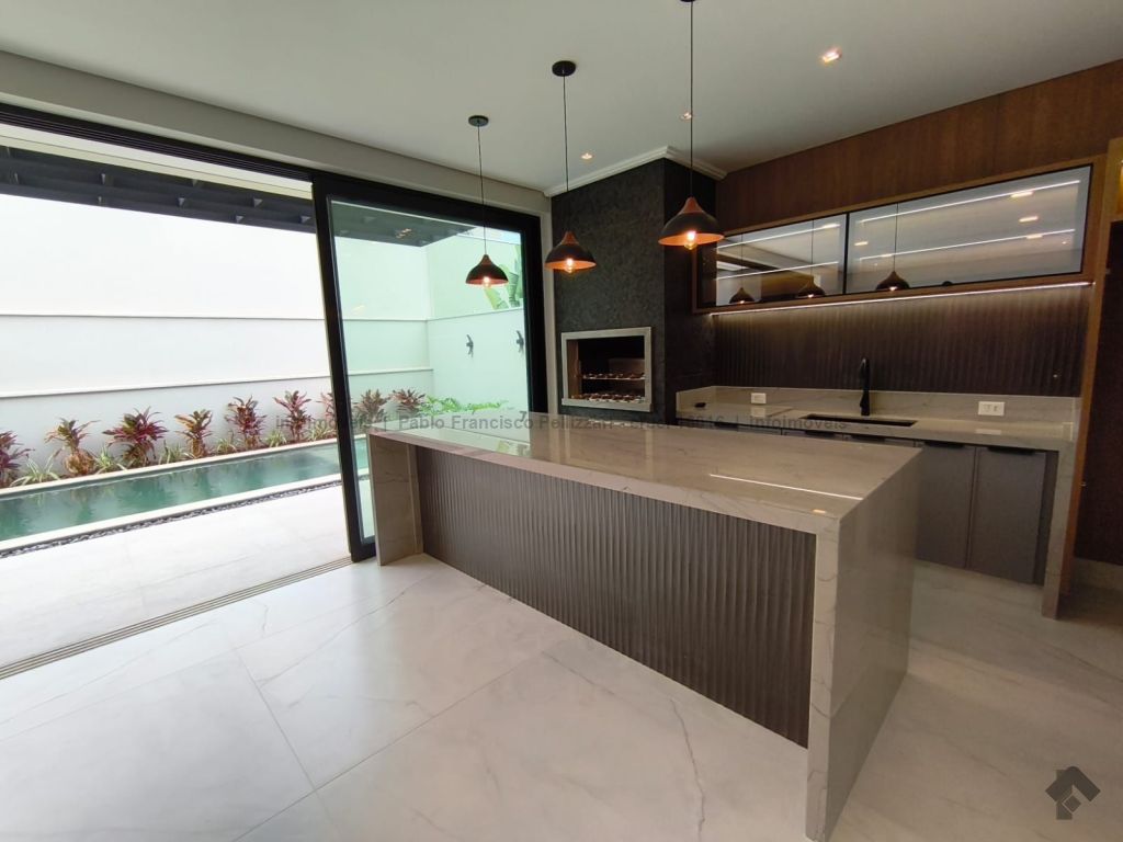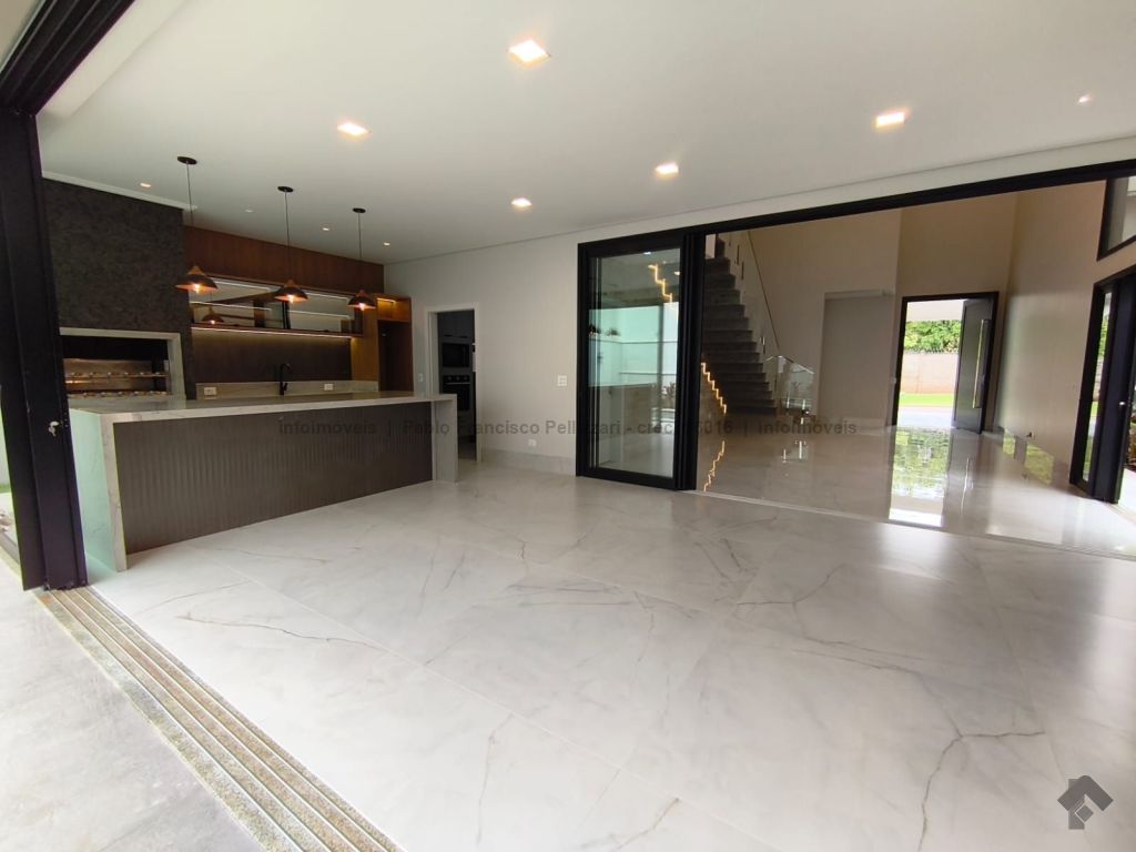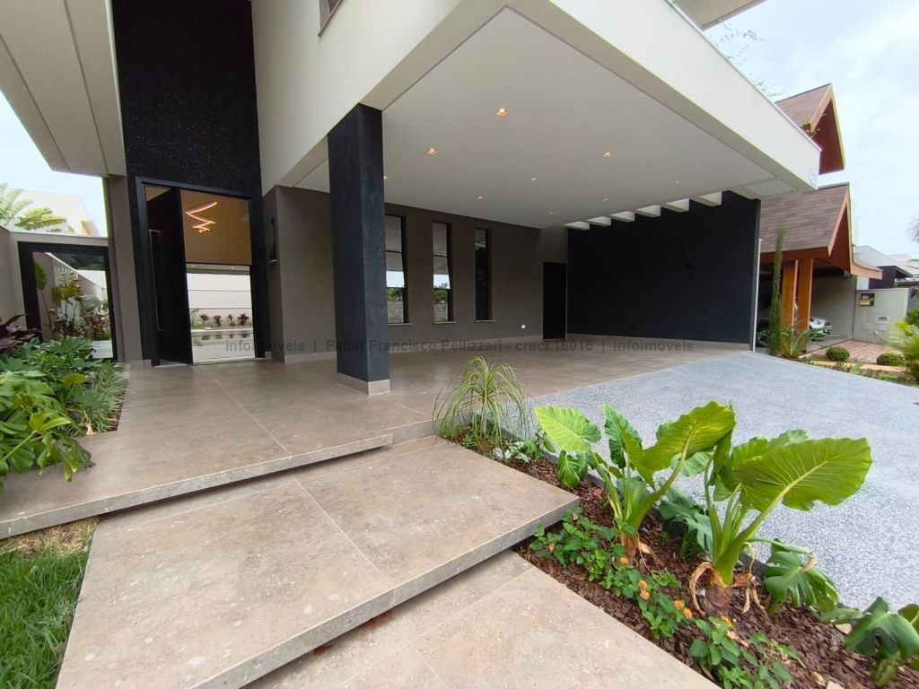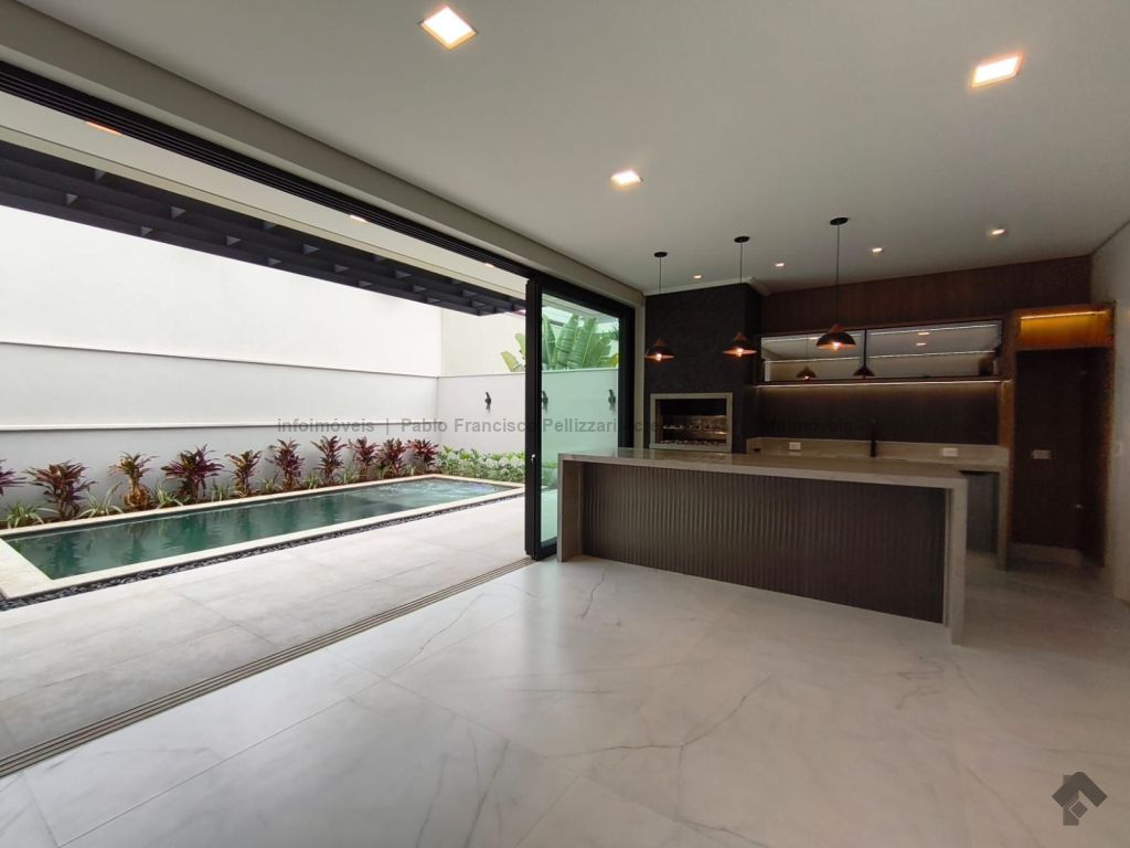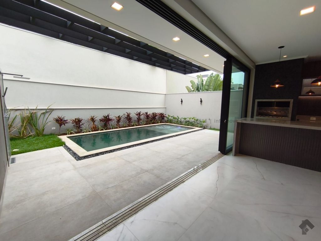 Amplo sobrado com 328 m² de área construída (18 m² de piscina). Piso inferior: lavabo, 1 suíte/escritório, ampla sala 3 ambientes, cozinha e área gourmet com planejados e equipados com churrasqueira com espetos automatizados, micro-ondas, forno, cooktop e coifa, WC social para atender piscina e gourmet integrado, piscina aquecida e ducha externa, área de serviço, garagem para 3 veículos cobertos. Piso superior: 3 suítes amplas, sendo uma master com closet generoso, hidromassagem com cromoterapia e ozônio e ampla sacada com vista para a reserva de mata, 1 sala íntima bem ampla, com espaço inclusive para copa. Condomínio com segurança e lazer completo.