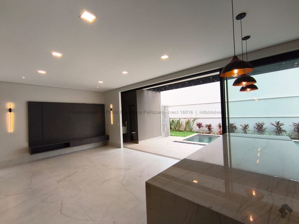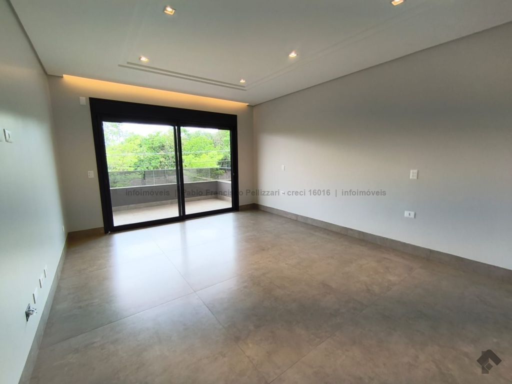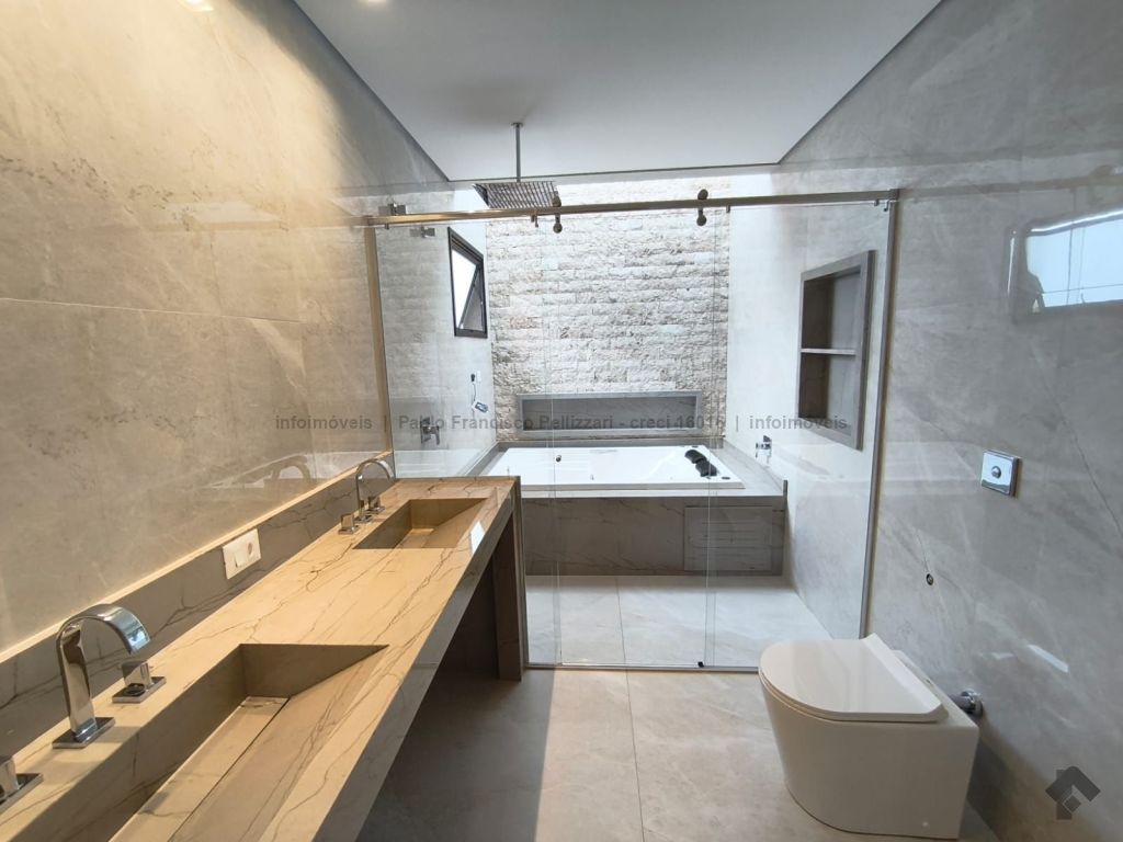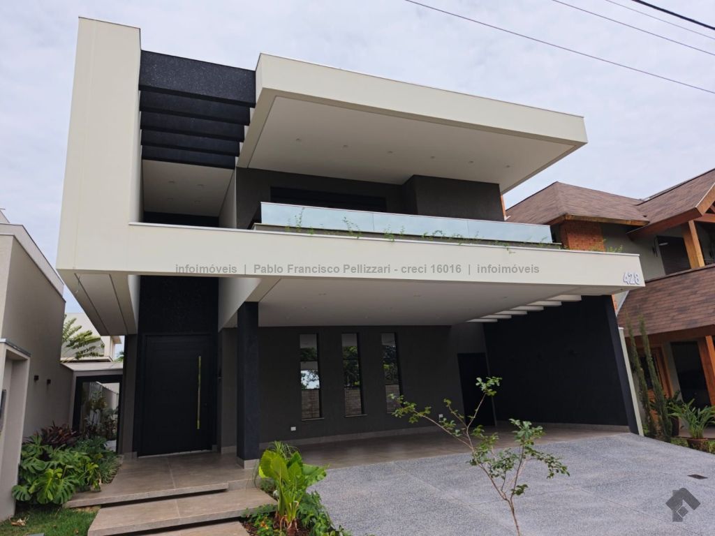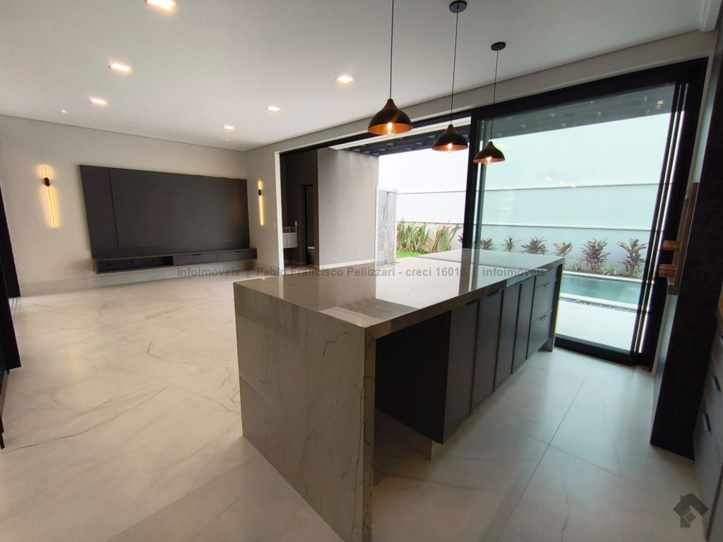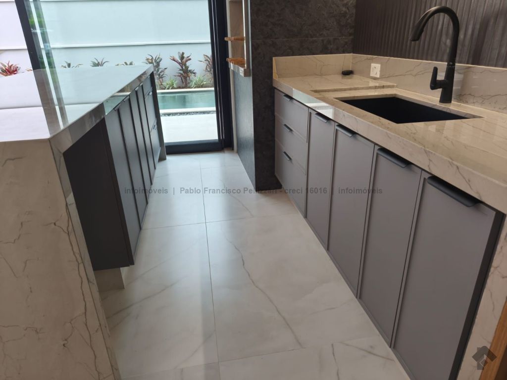 Amplo sobrado com 328 m² de área construída (18 m² de piscina). Piso inferior: lavabo, 1 suíte/escritório, ampla sala 3 ambientes, cozinha e área gourmet com planejados e equipados com churrasqueira com espetos automatizados, micro-ondas, forno, cooktop e coifa, WC social para atender piscina e gourmet integrado, piscina aquecida e ducha externa, área de serviço, garagem para 3 veículos cobertos. Piso superior: 3 suítes amplas, sendo uma master com closet generoso, hidromassagem com cromoterapia e ozônio e ampla sacada com vista para a reserva de mata, 1 sala íntima bem ampla, com espaço inclusive para copa. Condomínio com segurança e lazer completo.