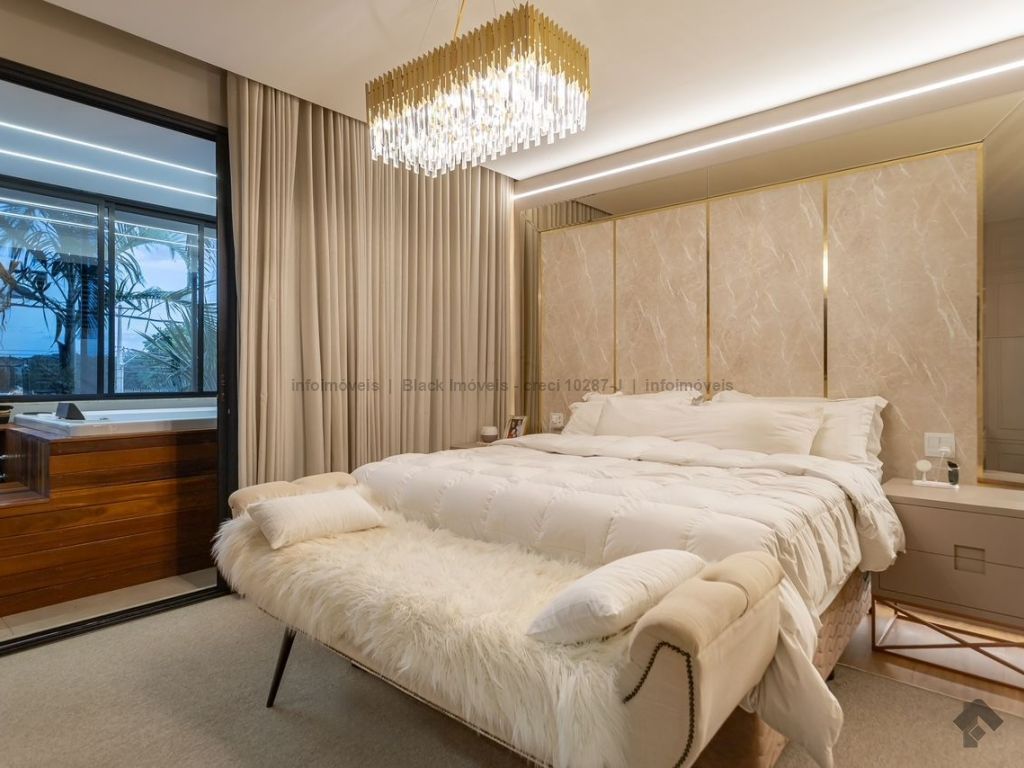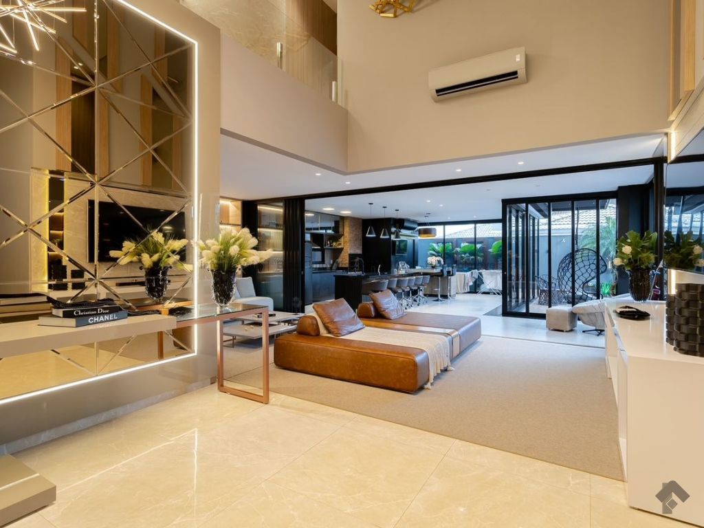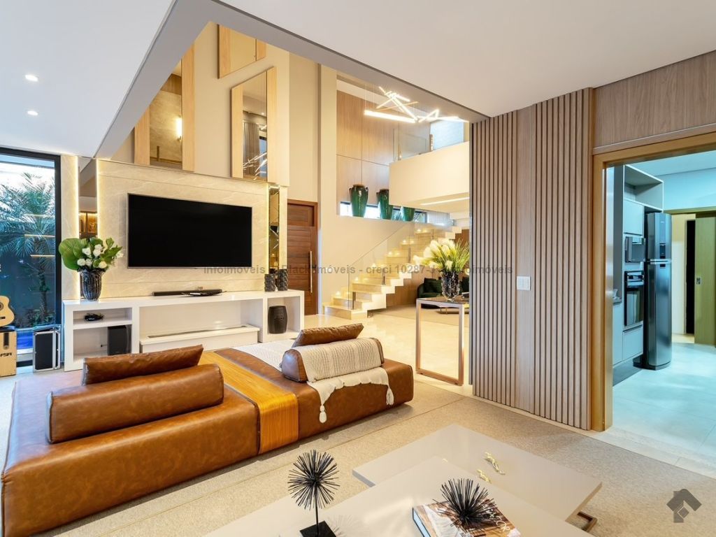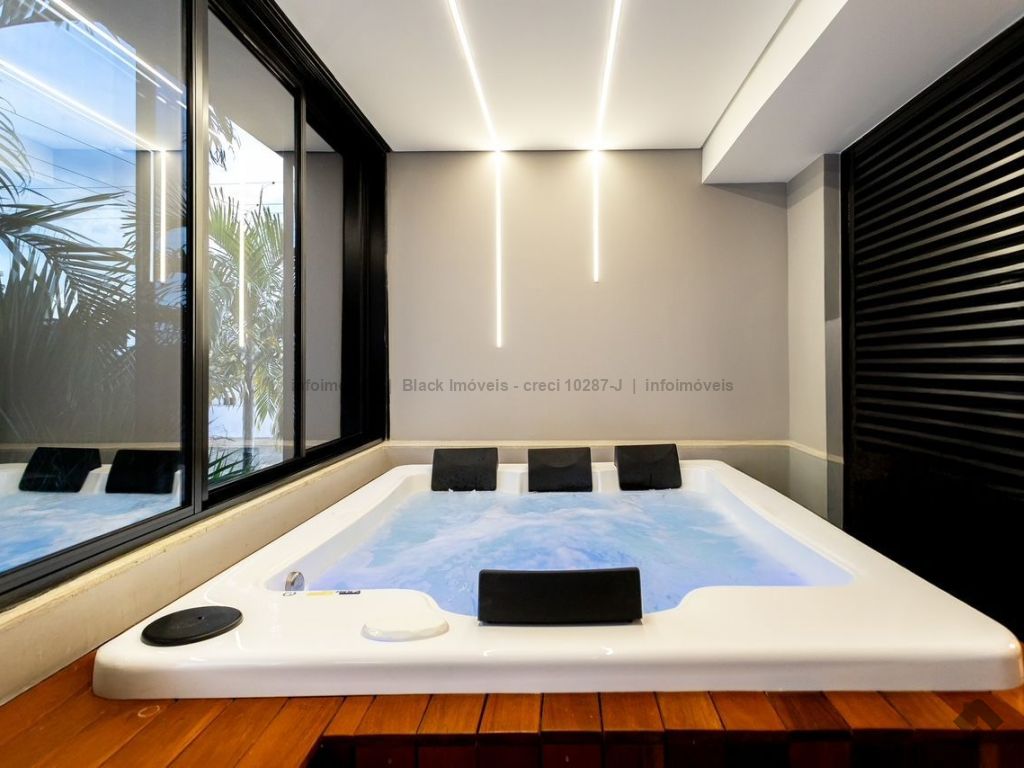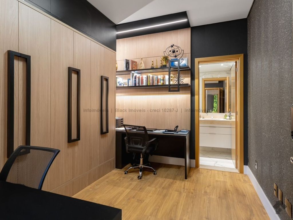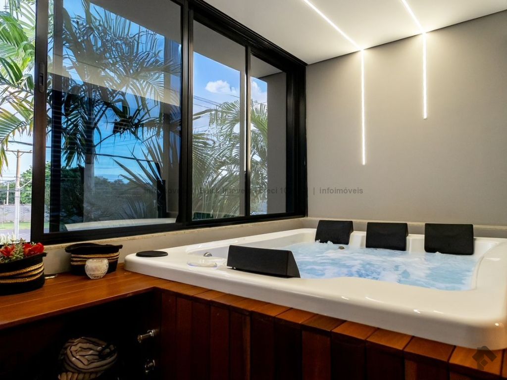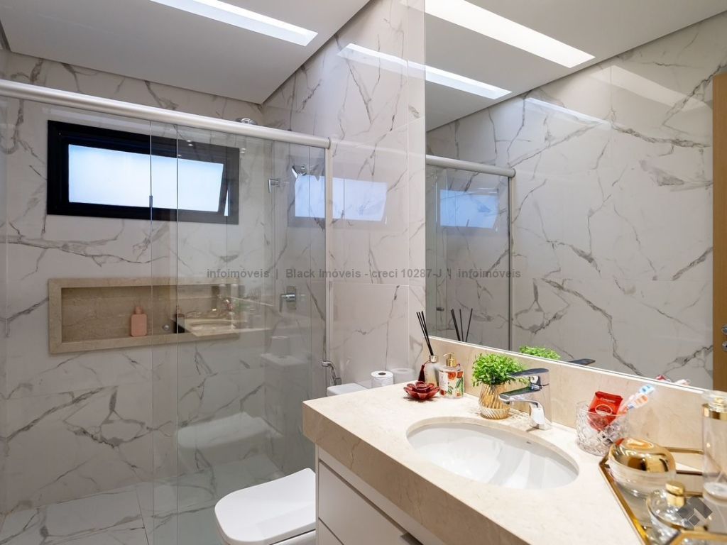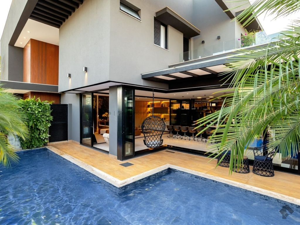Sobrado porteira fechada. Térreo: hall de entrada, sala de estar, lavabo, área gourmet integrada com a sala de estar e TV, WC gourmet. Área externa com piscina em L com cascata, chuveirão e paisagismo. Cozinha com ilha, despensa, área de serviço com WC de serviço e quarto com armários. Piso superior: sala, 4 suítes (1 suíte master com hidromassagem, 1 suíte escritório, 1 suíte com sacada, 1 suíte). Garagem para 4 carros, sendo 2 cobertos, depósito na garagem. Energia fotovoltaica, aquecimento para água nas torneiras e chuveiros, piscina aquecida, irrigação automática.