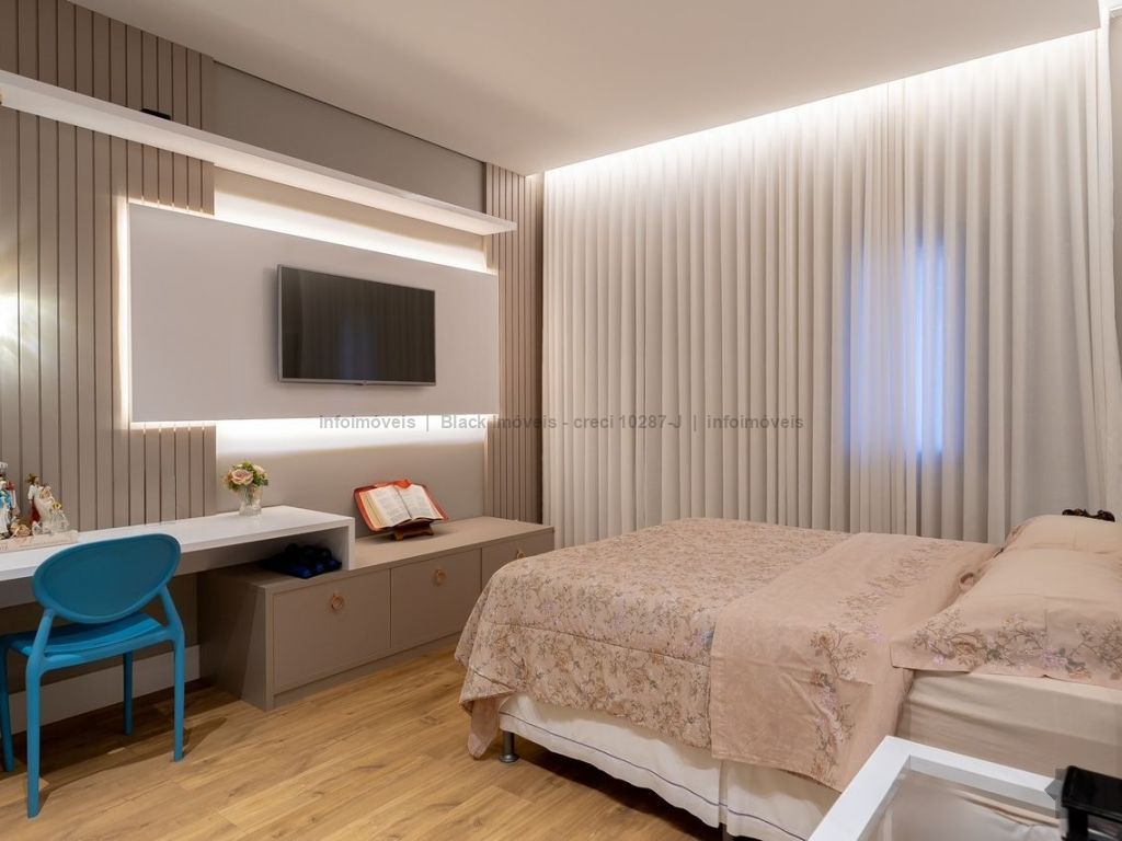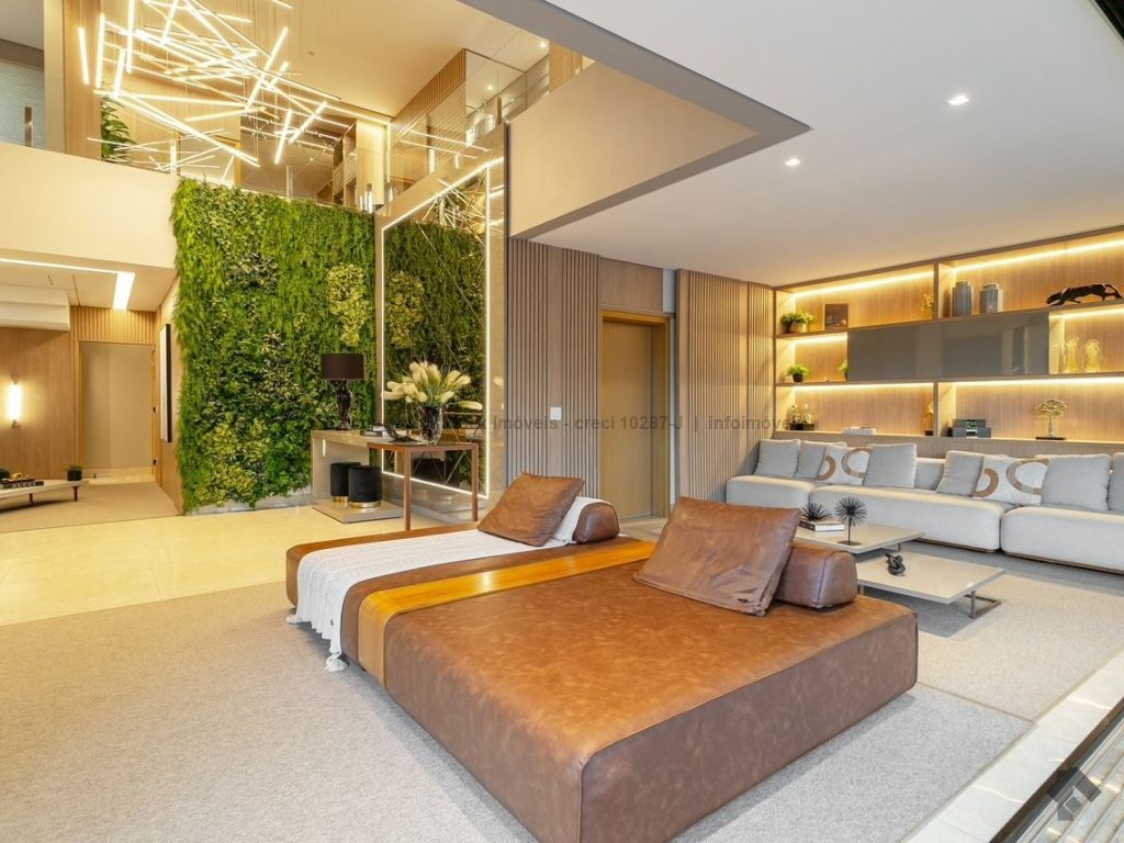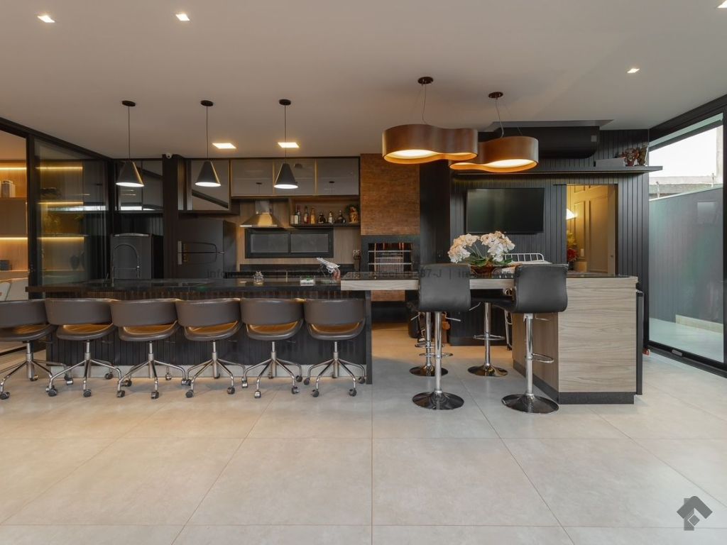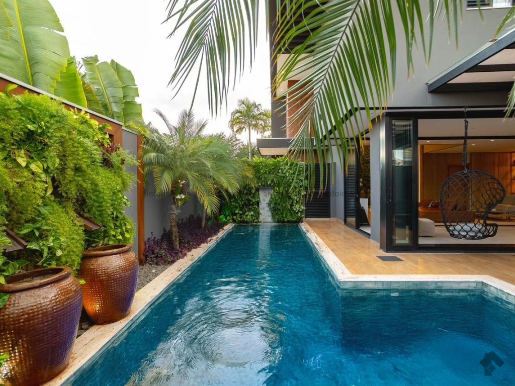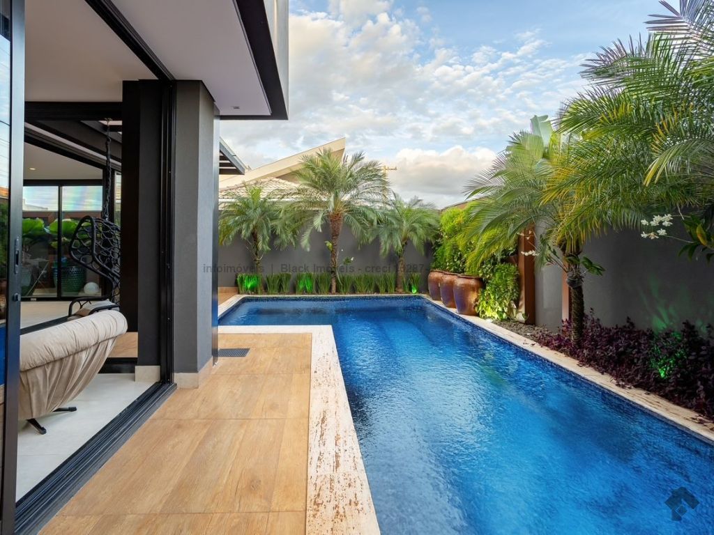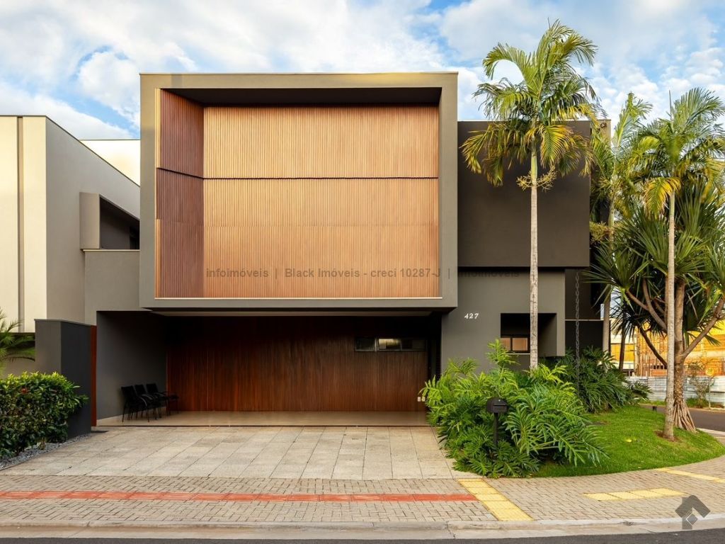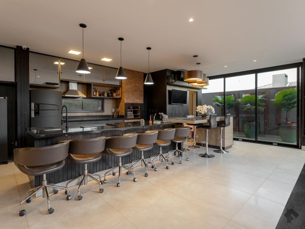 Sobrado porteira fechada. Térreo: hall de entrada, sala de estar, lavabo, área gourmet integrada com a sala de estar e TV, WC gourmet. Área externa com piscina em L com cascata, chuveirão e paisagismo. Cozinha com ilha, despensa, área de serviço com WC de serviço e quarto com armários. Piso superior: sala, 4 suítes (1 suíte master com hidromassagem, 1 suíte escritório, 1 suíte com sacada, 1 suíte). Garagem para 4 carros, sendo 2 cobertos, depósito na garagem. Energia fotovoltaica, aquecimento para água nas torneiras e chuveiros, piscina aquecida, irrigação automática.