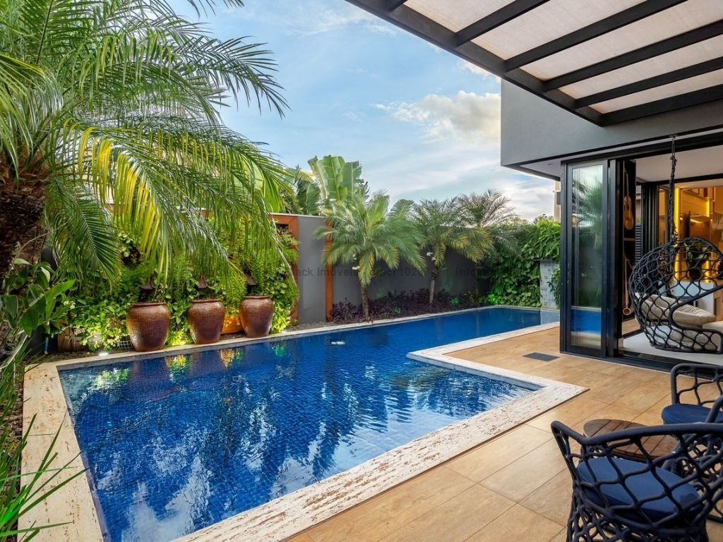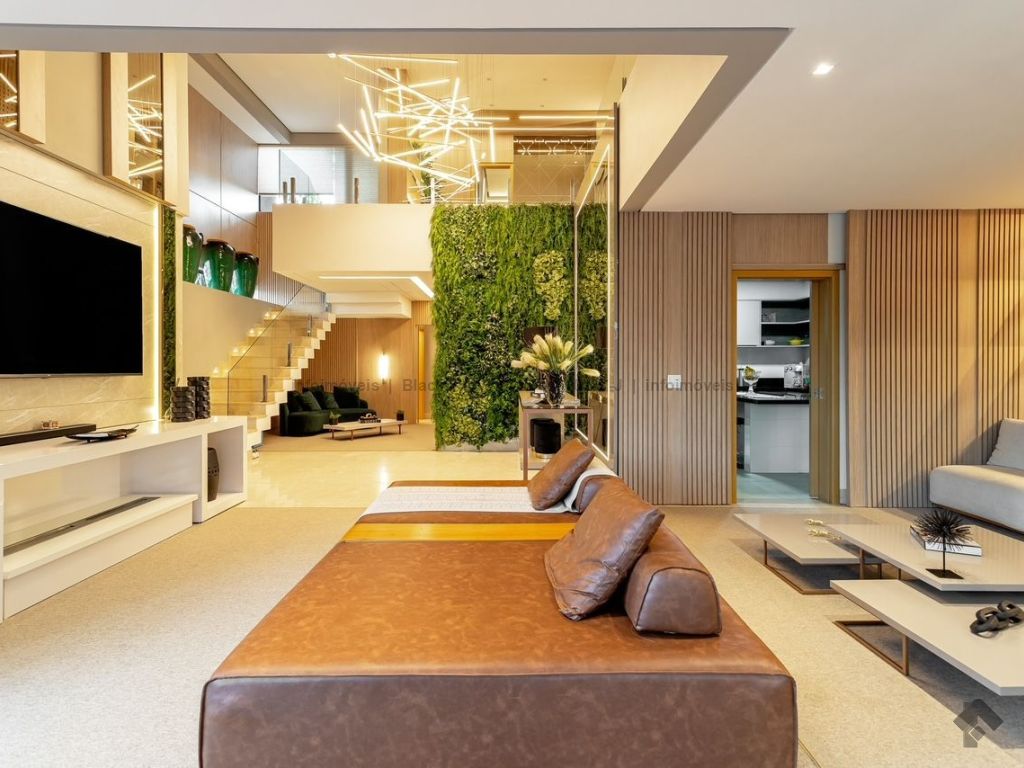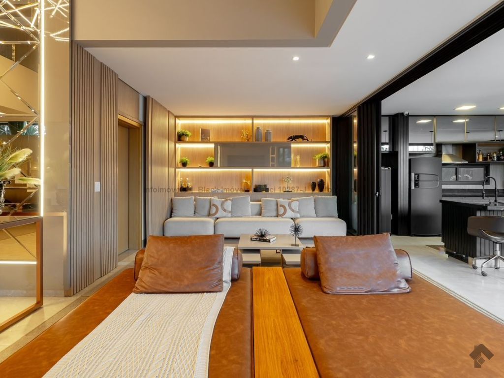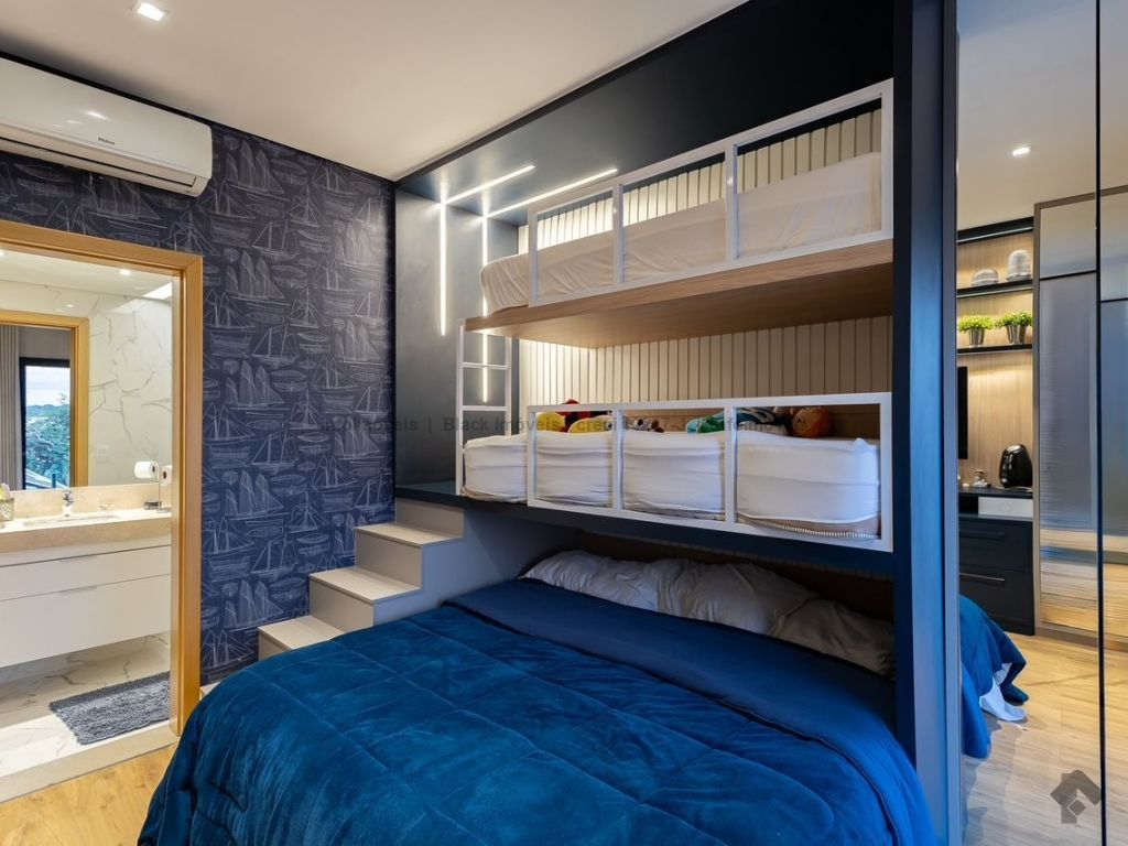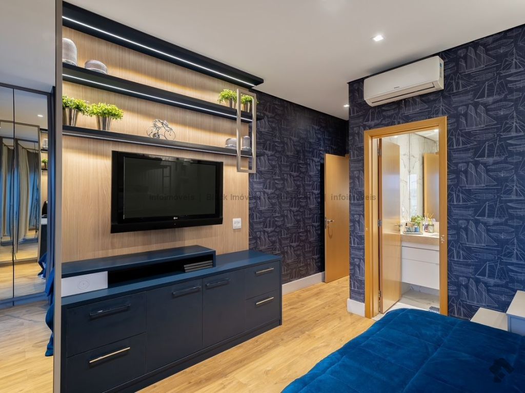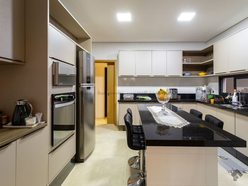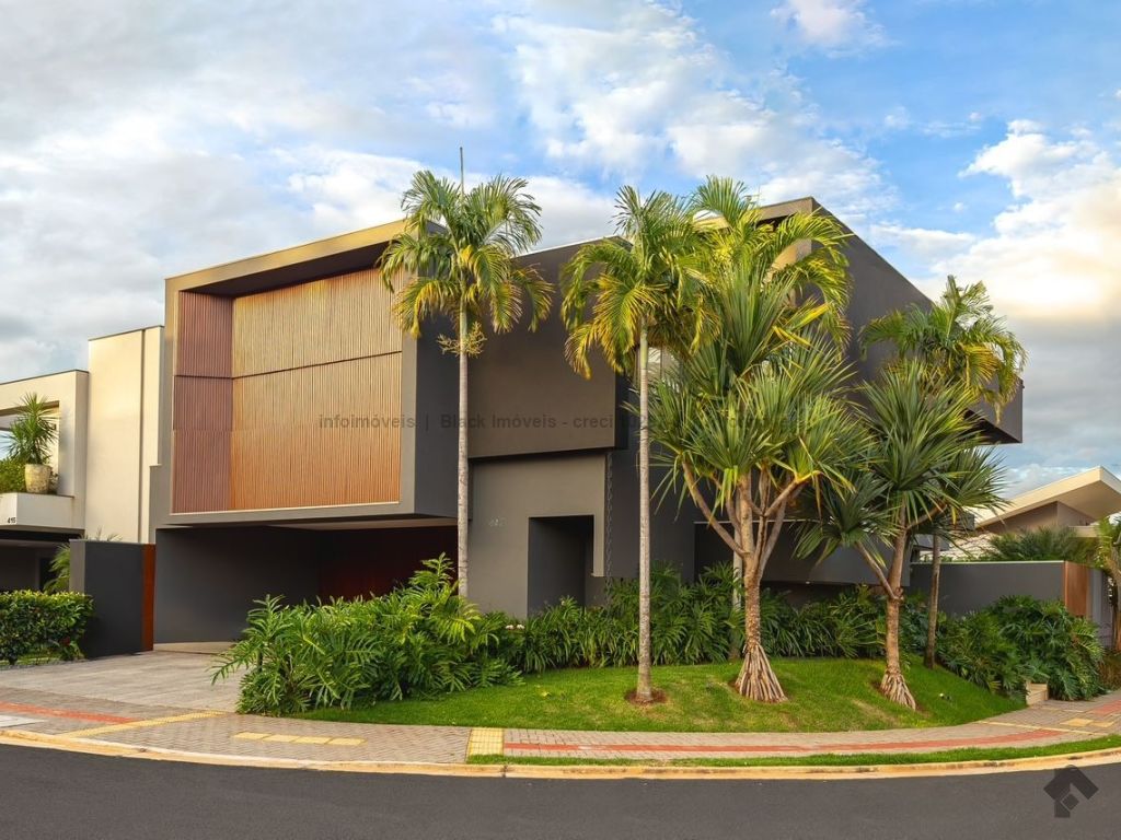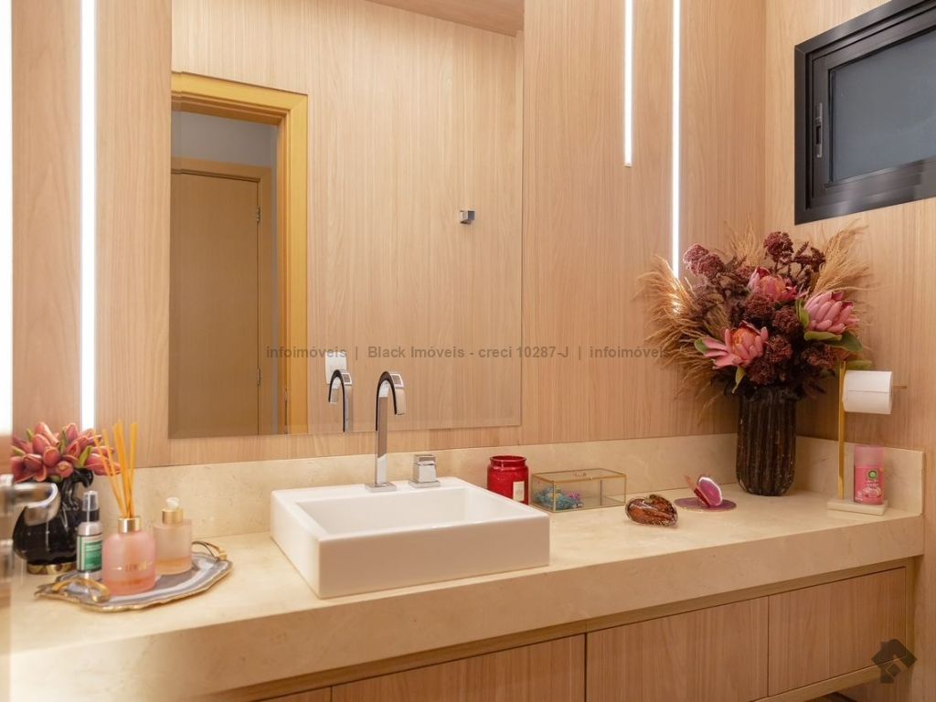 Sobrado porteira fechada. Térreo: hall de entrada, sala de estar, lavabo, área gourmet integrada com a sala de estar e TV, WC gourmet. Área externa com piscina em L com cascata, chuveirão e paisagismo. Cozinha com ilha, despensa, área de serviço com WC de serviço e quarto com armários. Piso superior: sala, 4 suítes (1 suíte master com hidromassagem, 1 suíte escritório, 1 suíte com sacada, 1 suíte). Garagem para 4 carros, sendo 2 cobertos, depósito na garagem. Energia fotovoltaica, aquecimento para água nas torneiras e chuveiros, piscina aquecida, irrigação automática.
