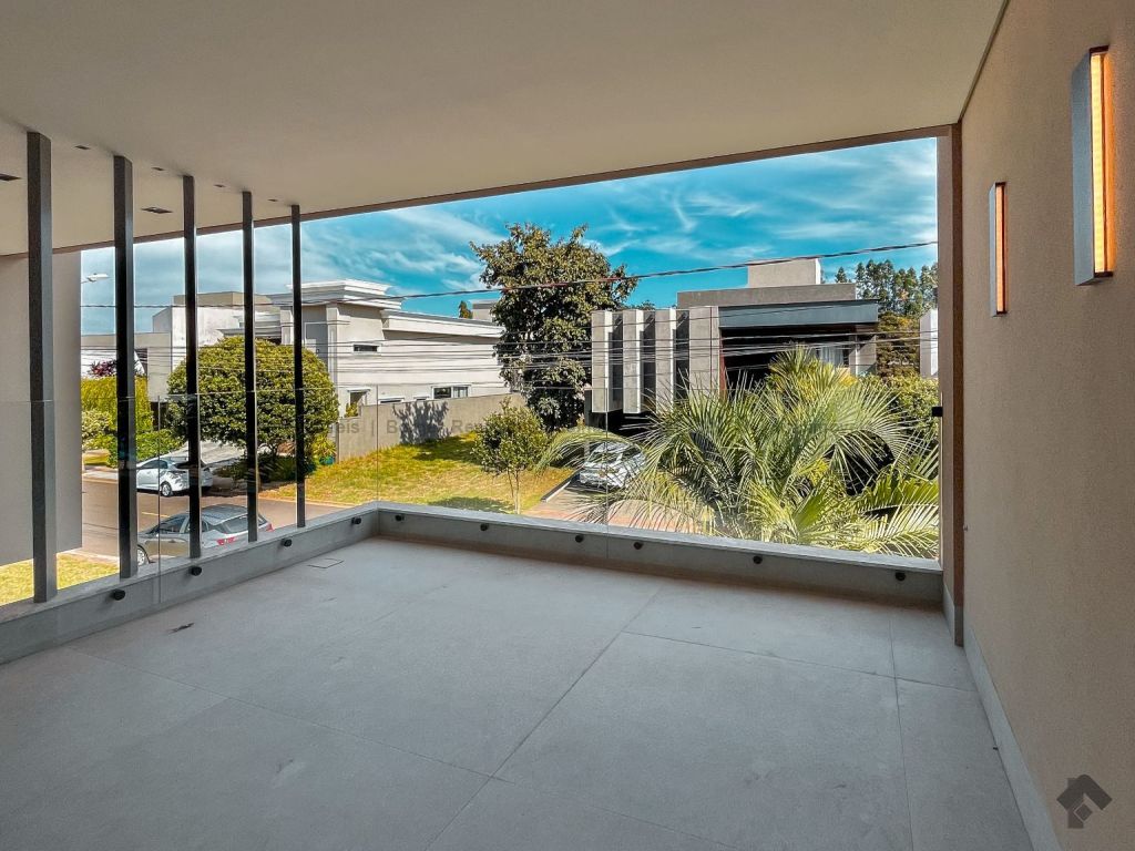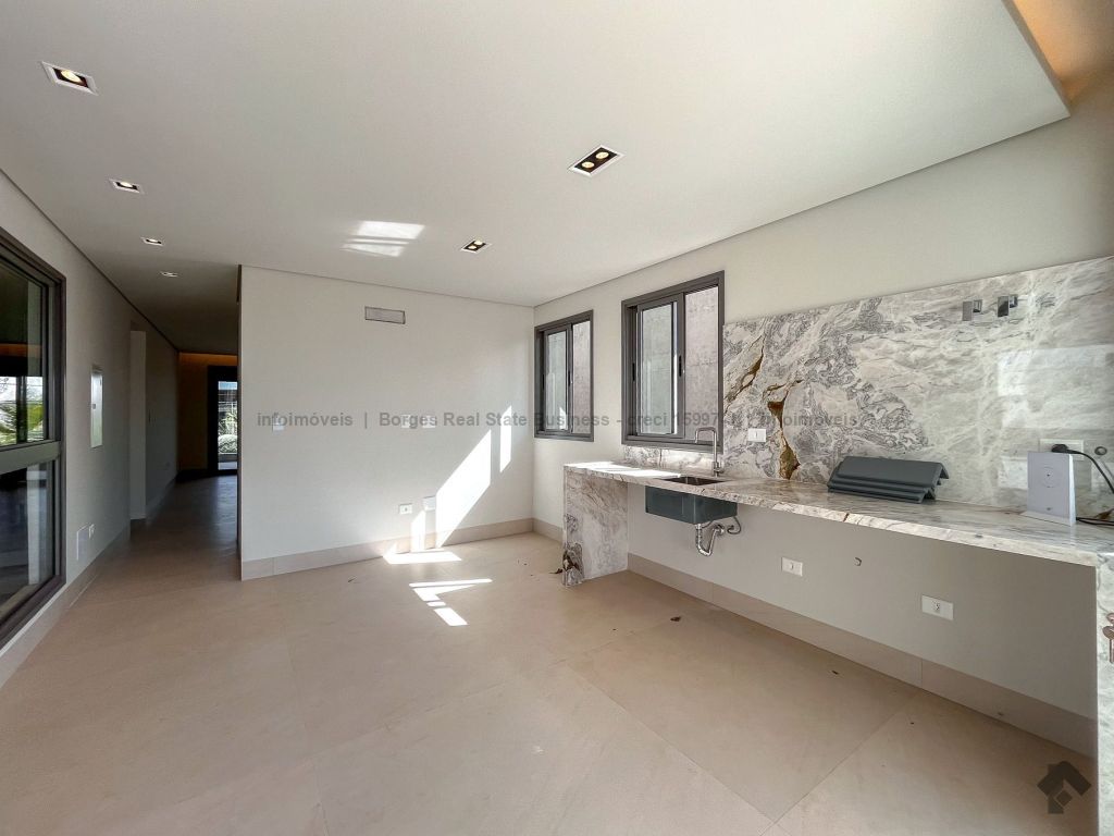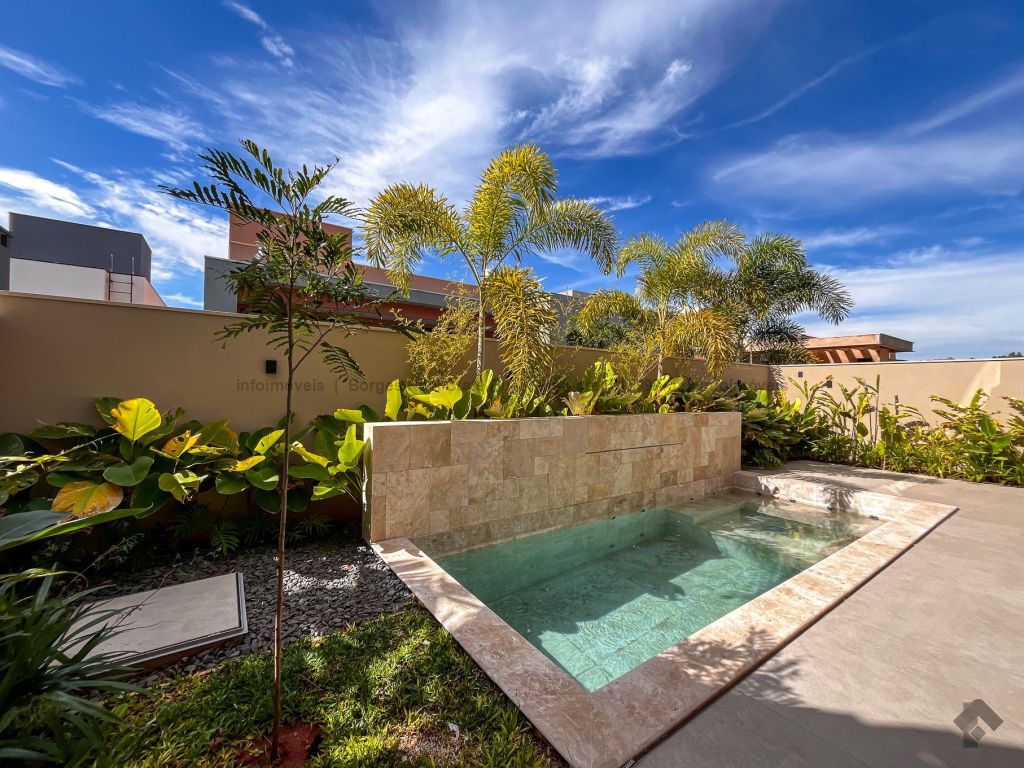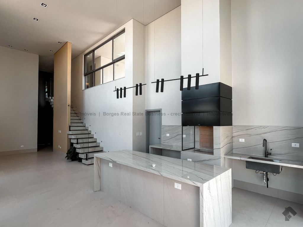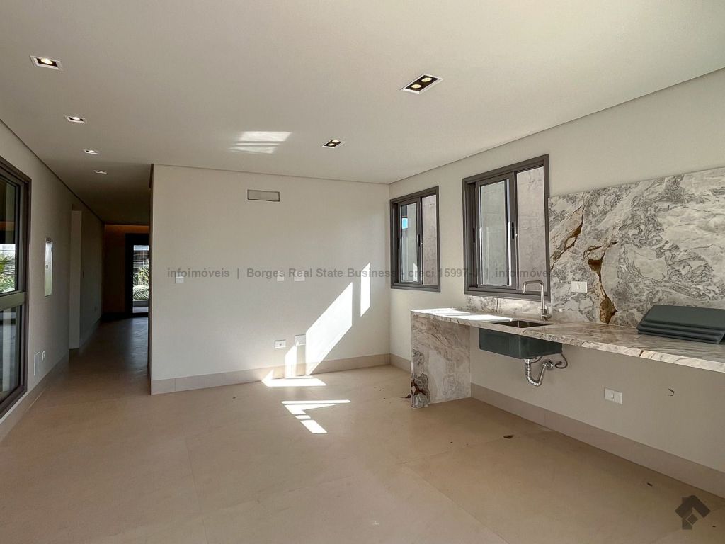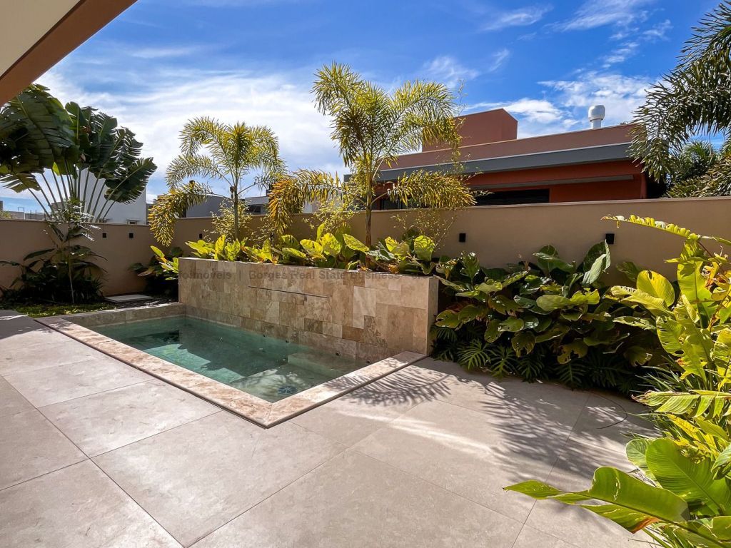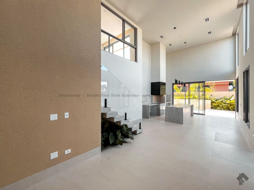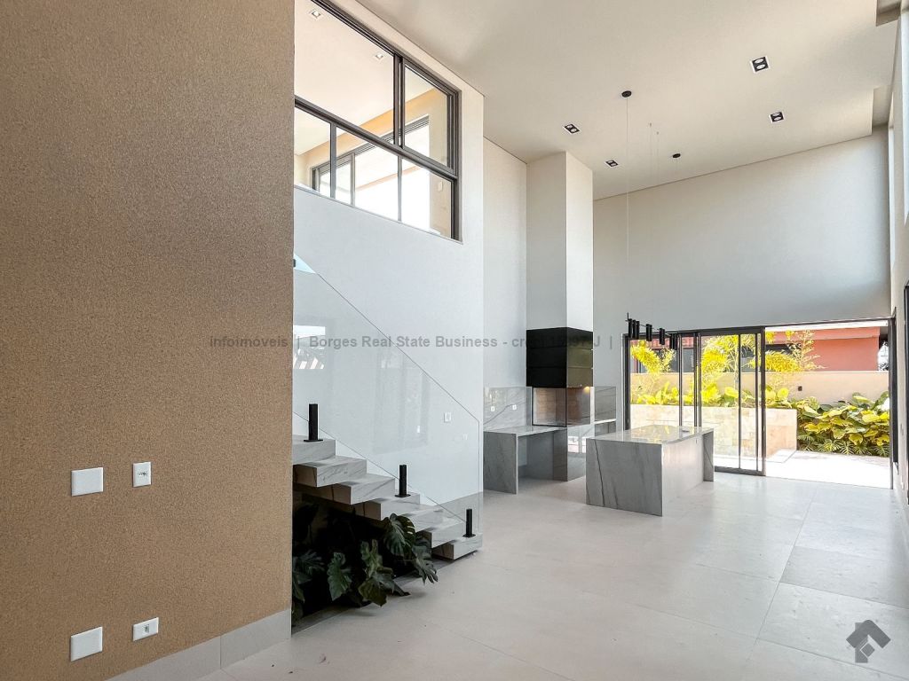 Sobrado de alto padrão com janelas e portas em alumínio premium, sala e gourmet com pé-direito duplo e porta de entrada automatizada de 6,5 m. Escada e churrasqueira em mármore Mont Blanc, churrasqueira equipada com exaustor, paisagismo completo com irrigação automatizada. Spa para 10 pessoas, piscina em travertino com cascata, hidro aquecida e automação. Infraestrutura de ar-condicionado em todos os ambientes, boiler de 600 L com aquecimento solar e interruptores inteligentes Intelbras.