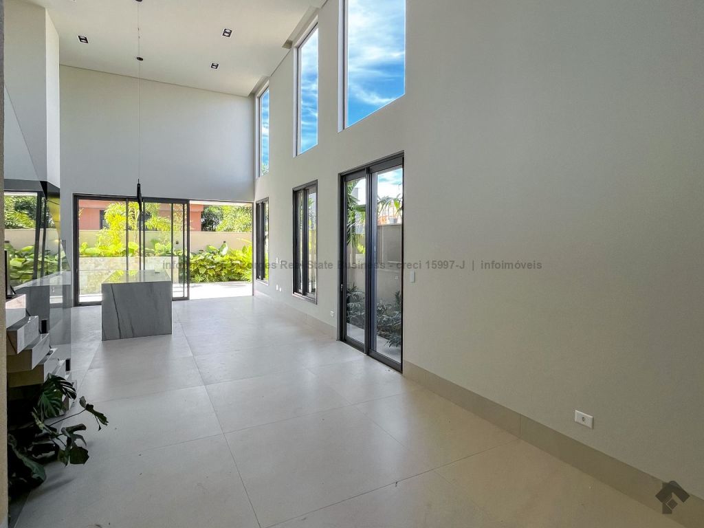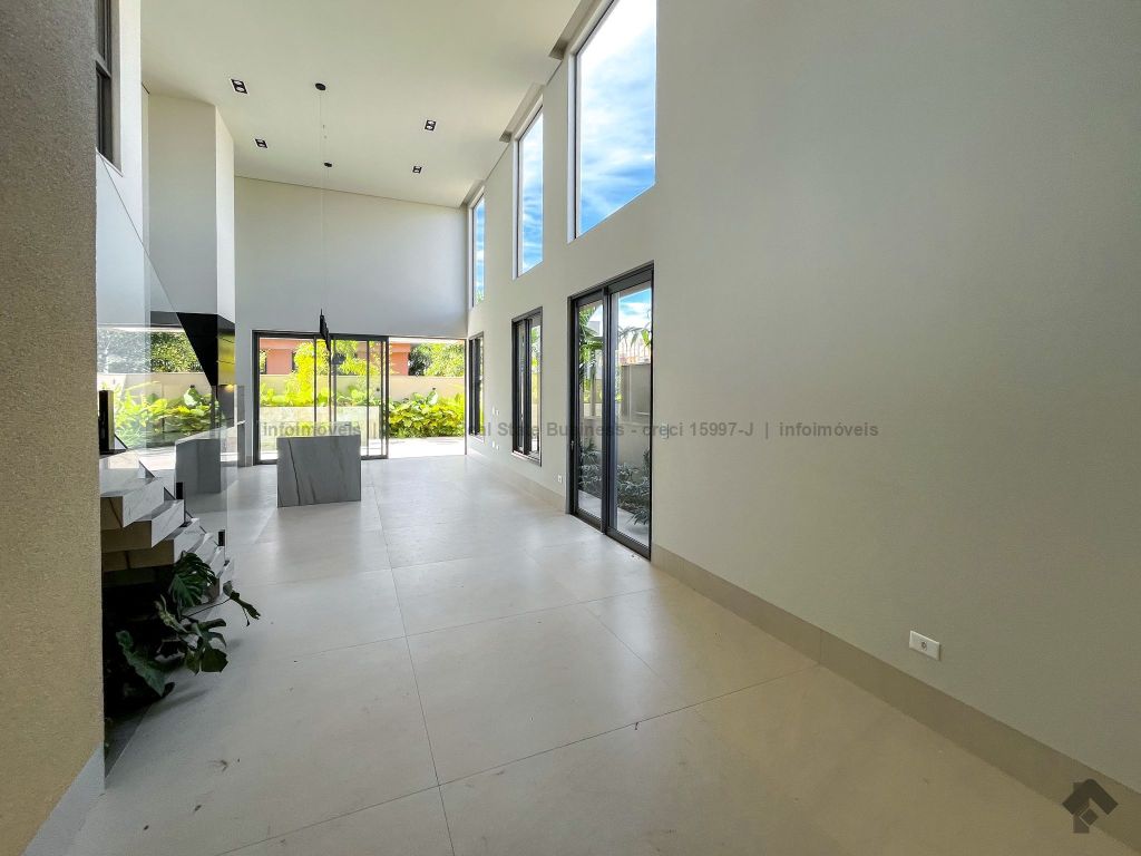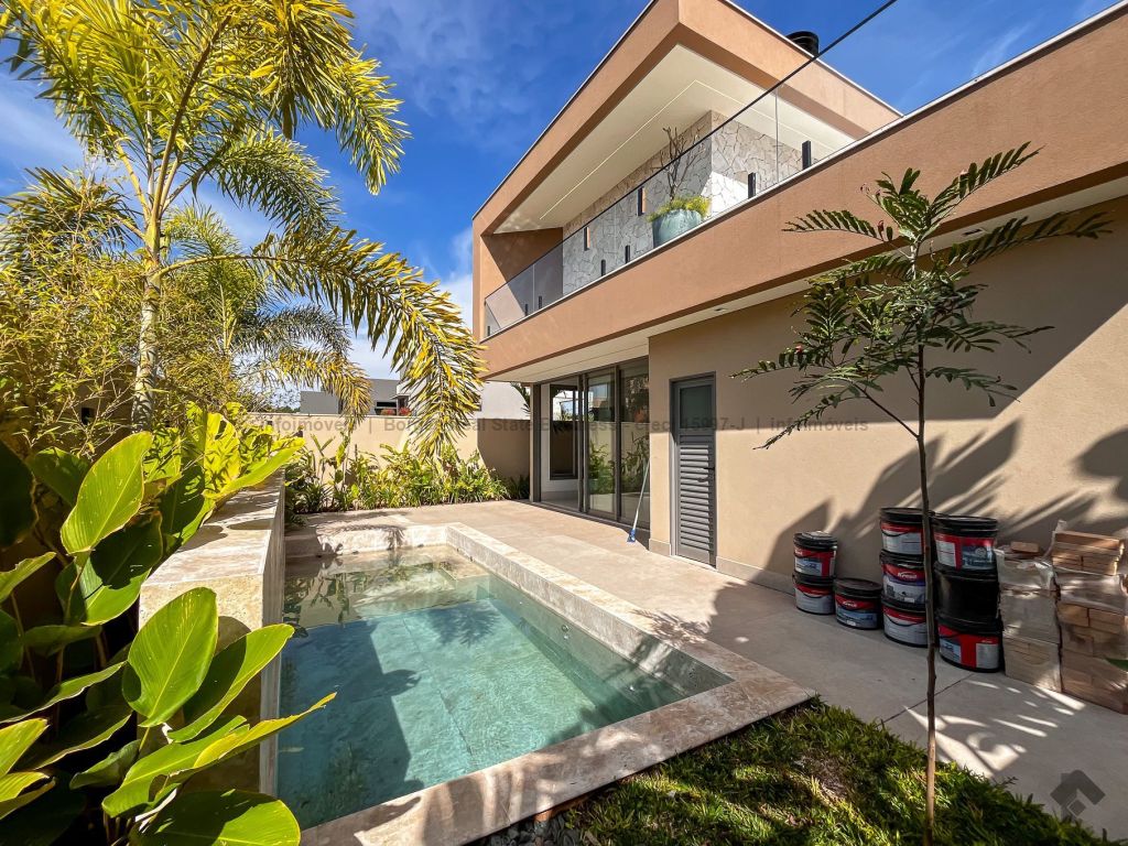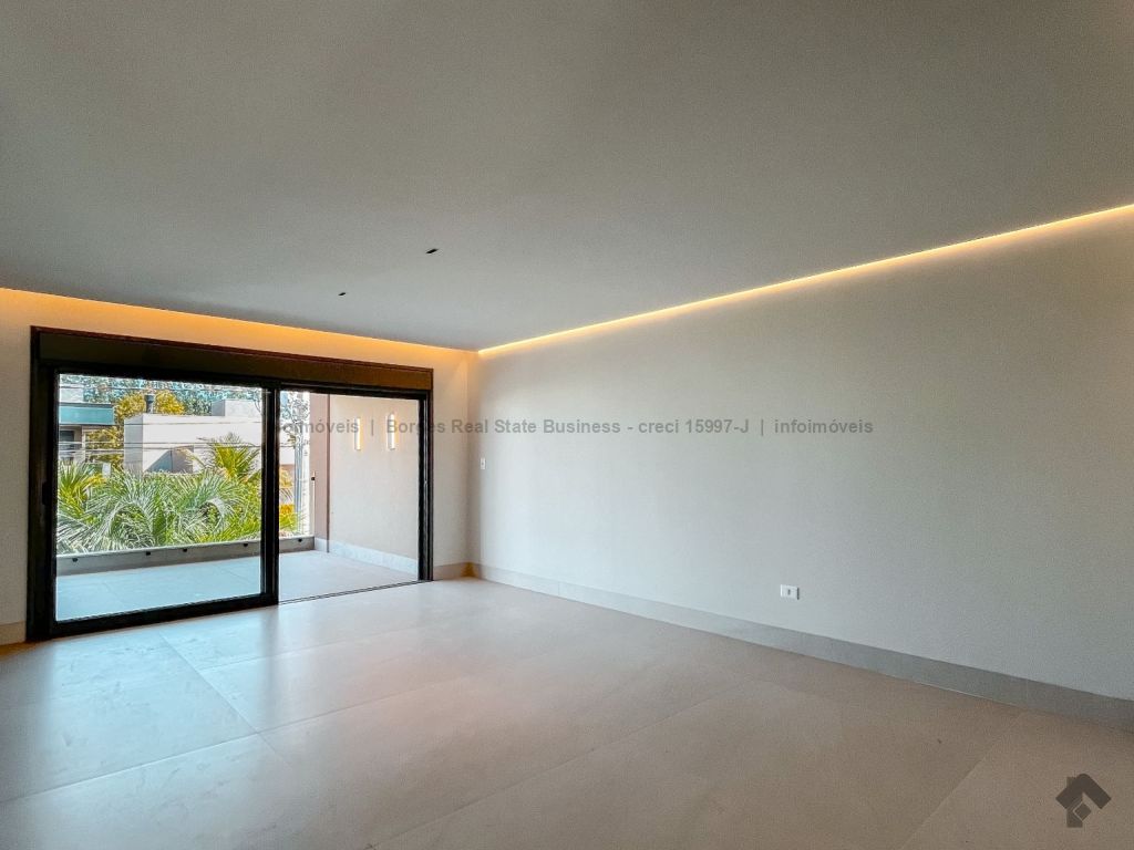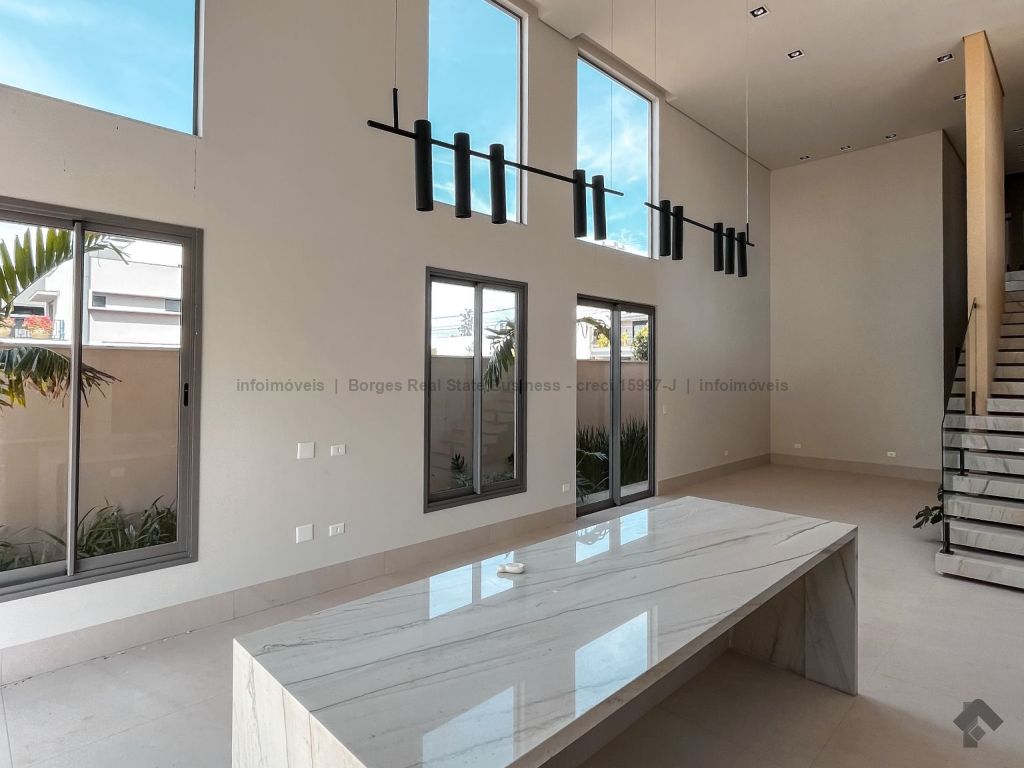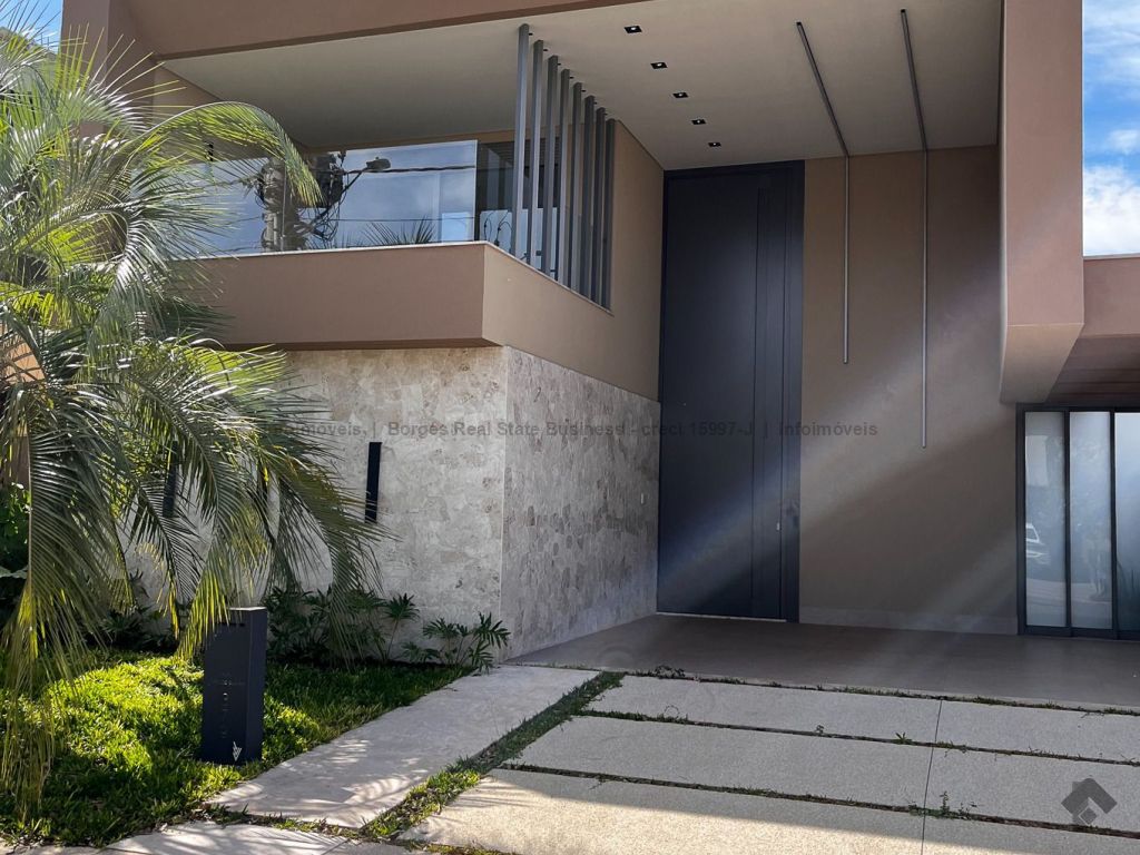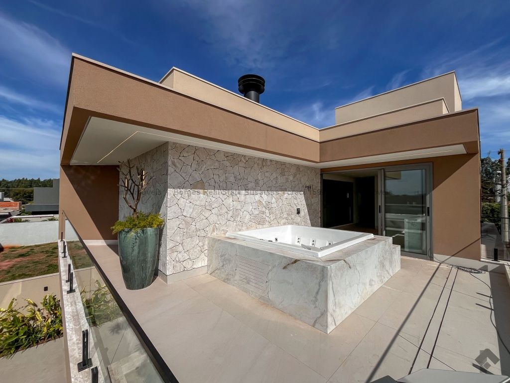 Sobrado de alto padrão com janelas e portas em alumínio premium, sala e gourmet com pé-direito duplo e porta de entrada automatizada de 6,5 m. Escada e churrasqueira em mármore Mont Blanc, churrasqueira equipada com exaustor, paisagismo completo com irrigação automatizada. Spa para 10 pessoas, piscina em travertino com cascata, hidro aquecida e automação. Infraestrutura de ar-condicionado em todos os ambientes, boiler de 600 L com aquecimento solar e interruptores inteligentes Intelbras.