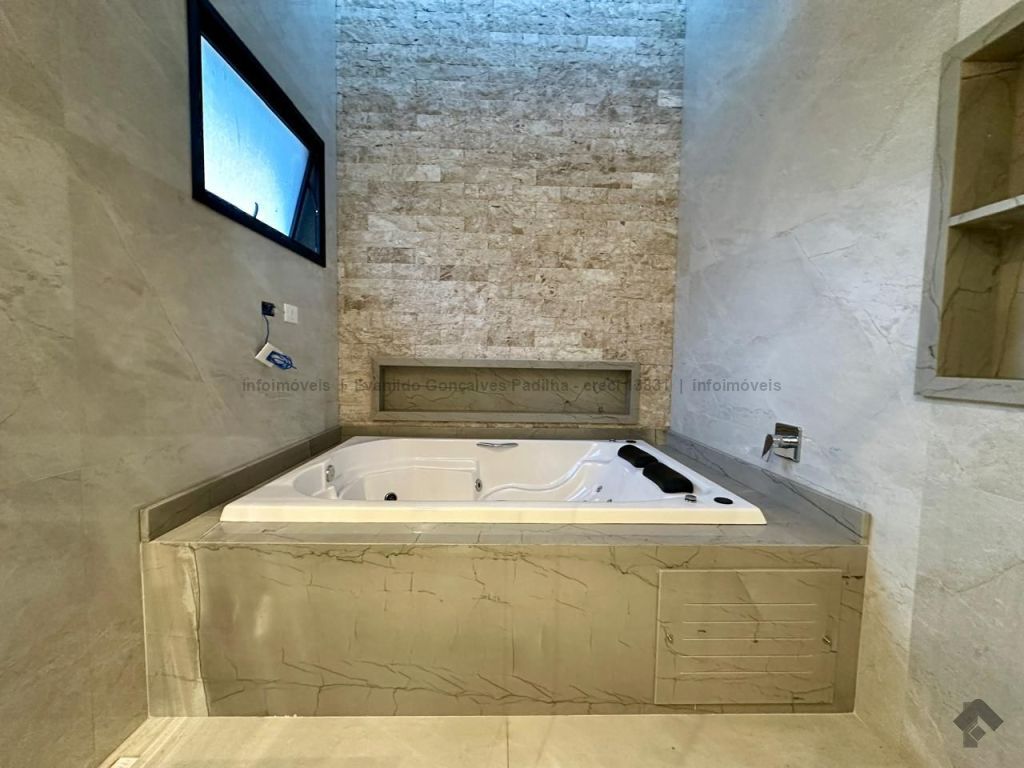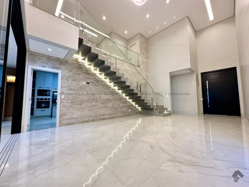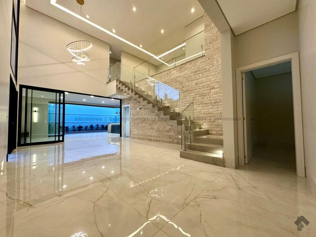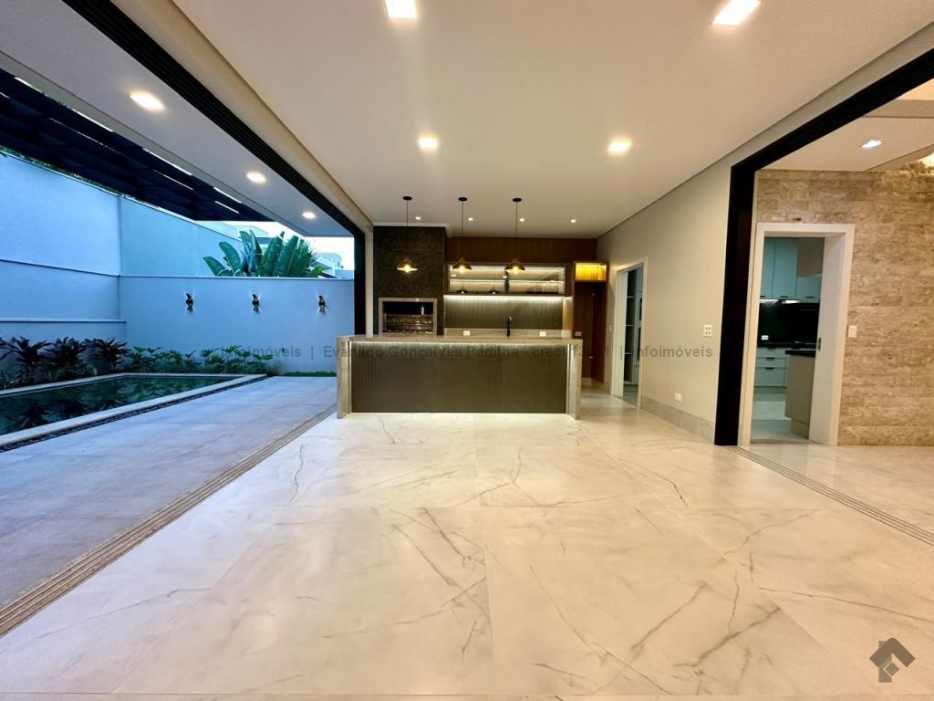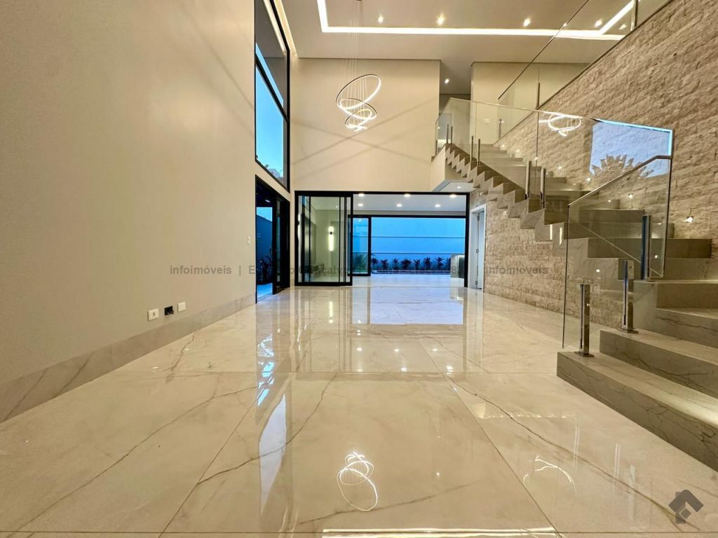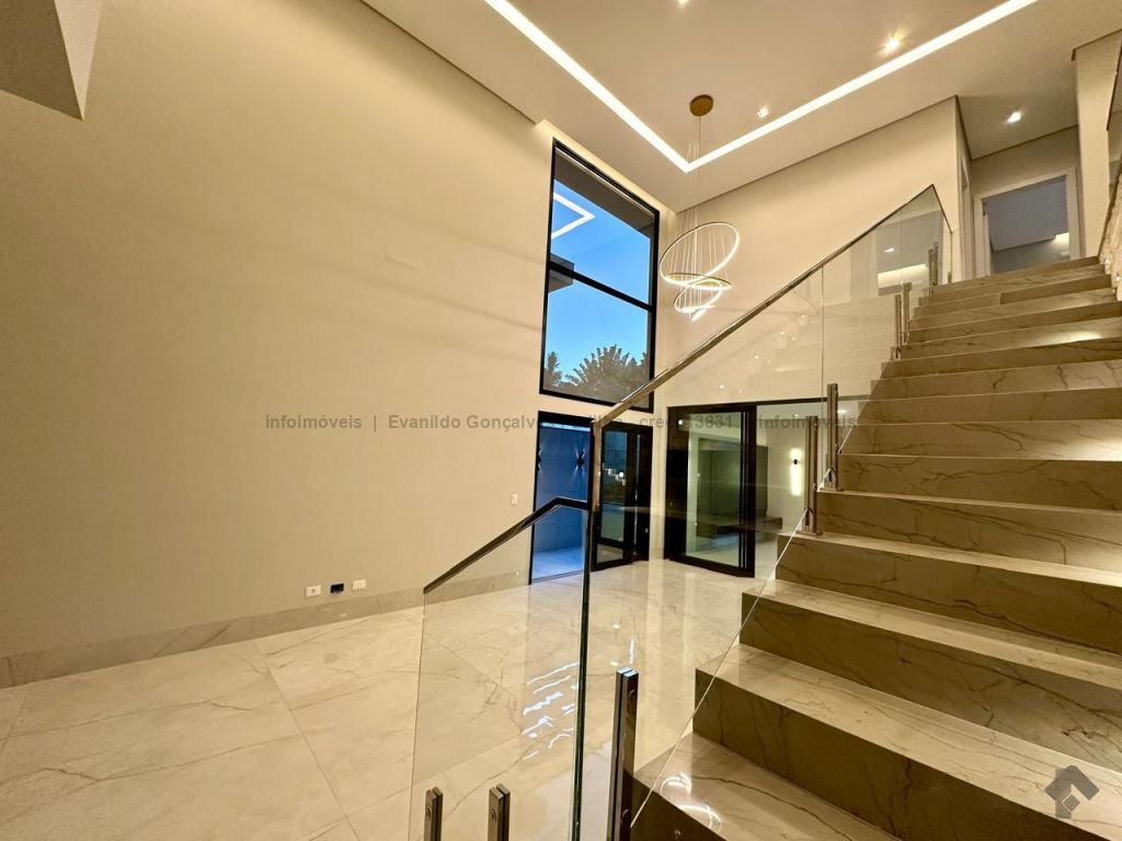 Sala ampla para até 3 ambientes, lavabo, pé direito alto, sanca e lustre. Escadaria toda em mármore e retroiluminada. Cozinha toda montada, repleta de armários planejados, micro-ondas, forno, cooktop e coifa. Espaço gourmet bem amplo e todo planejado, ilha em mármore e retroiluminada, com pêndulos e painel de TV. Piscina com hidro e aquecida, medindo 18 m². Lavabo e ducha na área externa. Energia fotovoltaica. 4 suítes amplas, sendo a principal uma suíte master com closet, banheira de hidromassagem e sacada, e uma das suítes na parte inferior, podendo ser escritório. Sala íntima no piso superior.