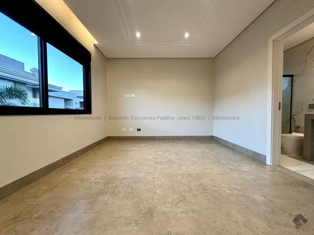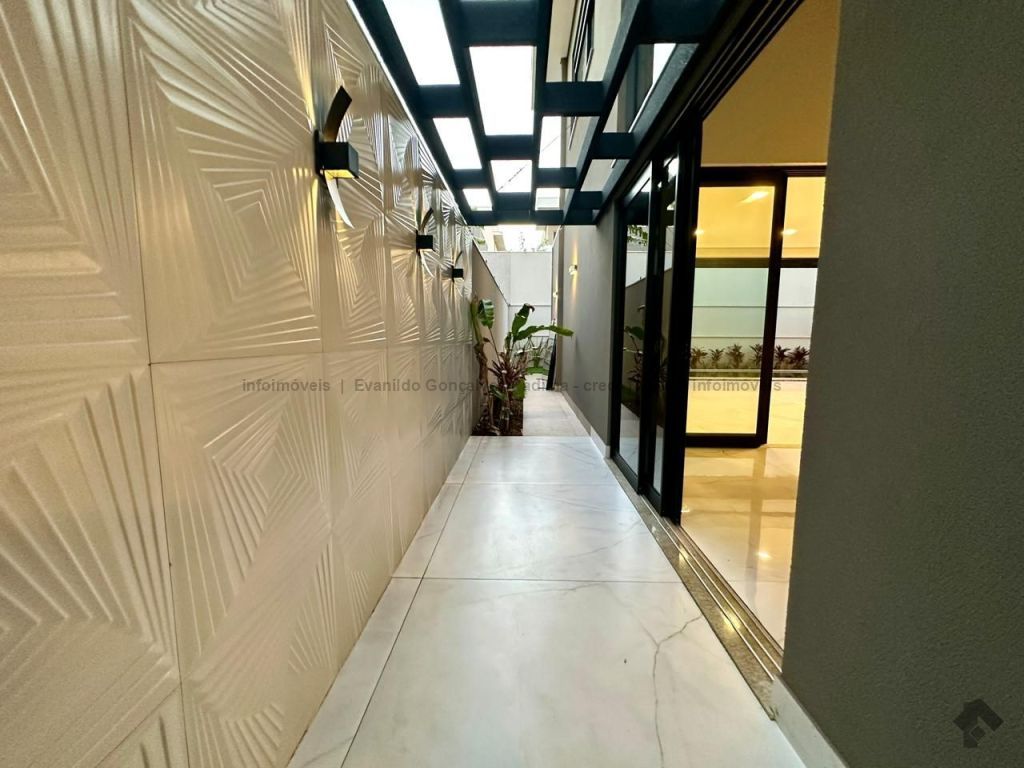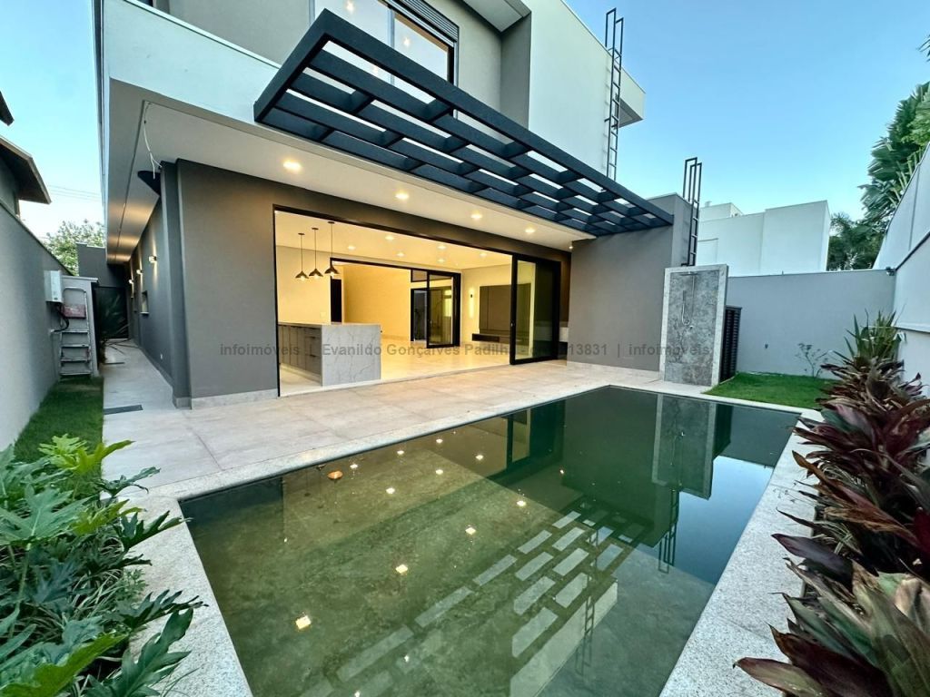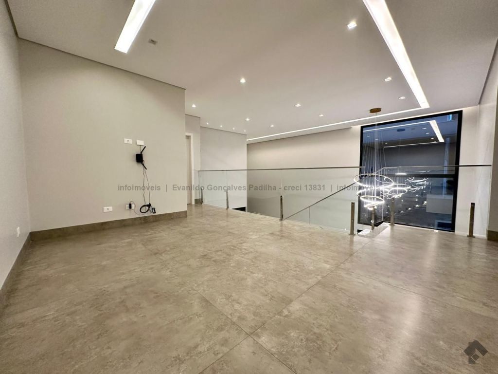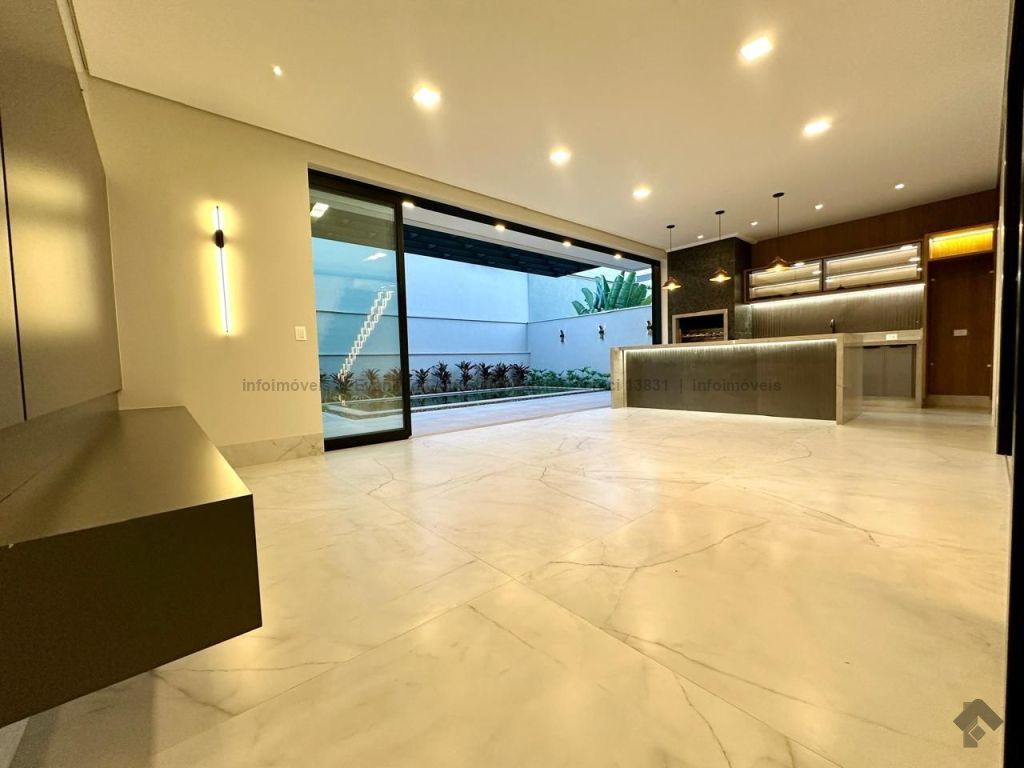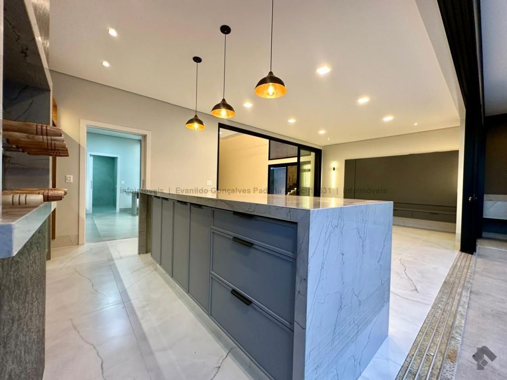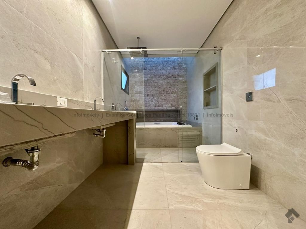 Sala ampla para até 3 ambientes, lavabo, pé direito alto, sanca e lustre. Escadaria toda em mármore e retroiluminada. Cozinha toda montada, repleta de armários planejados, micro-ondas, forno, cooktop e coifa. Espaço gourmet bem amplo e todo planejado, ilha em mármore e retroiluminada, com pêndulos e painel de TV. Piscina com hidro e aquecida, medindo 18 m². Lavabo e ducha na área externa. Energia fotovoltaica. 4 suítes amplas, sendo a principal uma suíte master com closet, banheira de hidromassagem e sacada, e uma das suítes na parte inferior, podendo ser escritório. Sala íntima no piso superior.