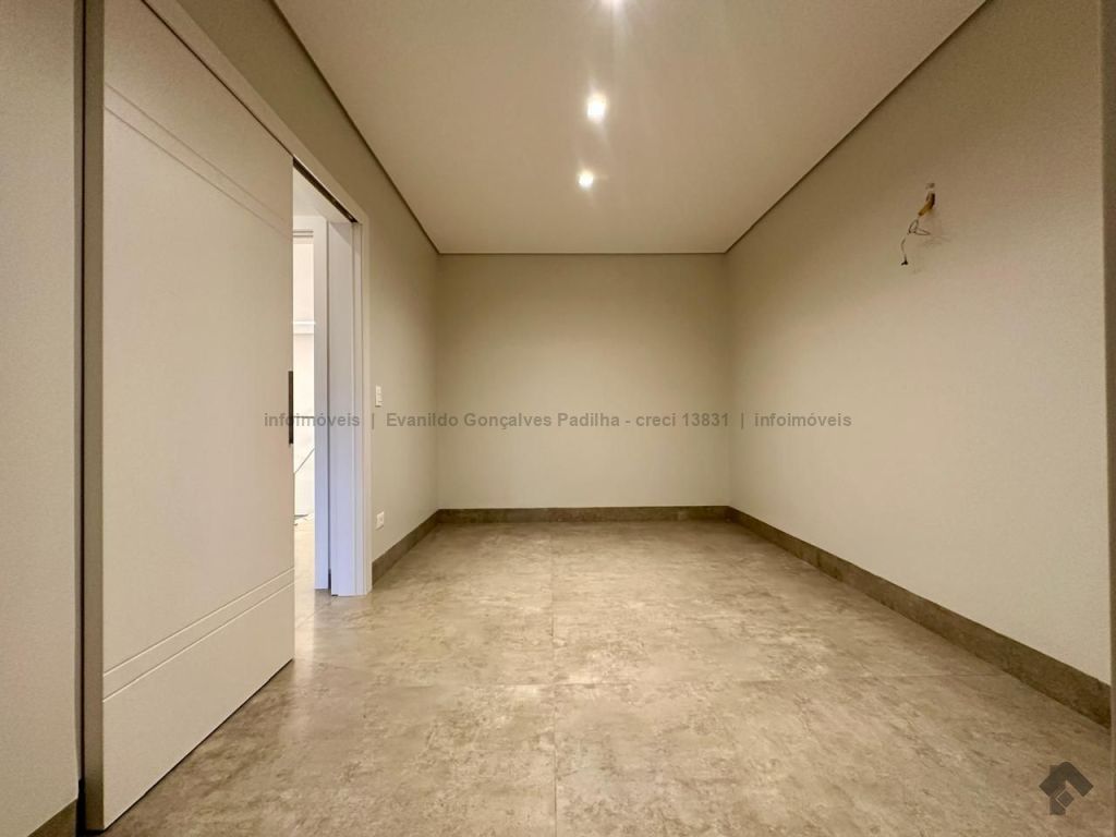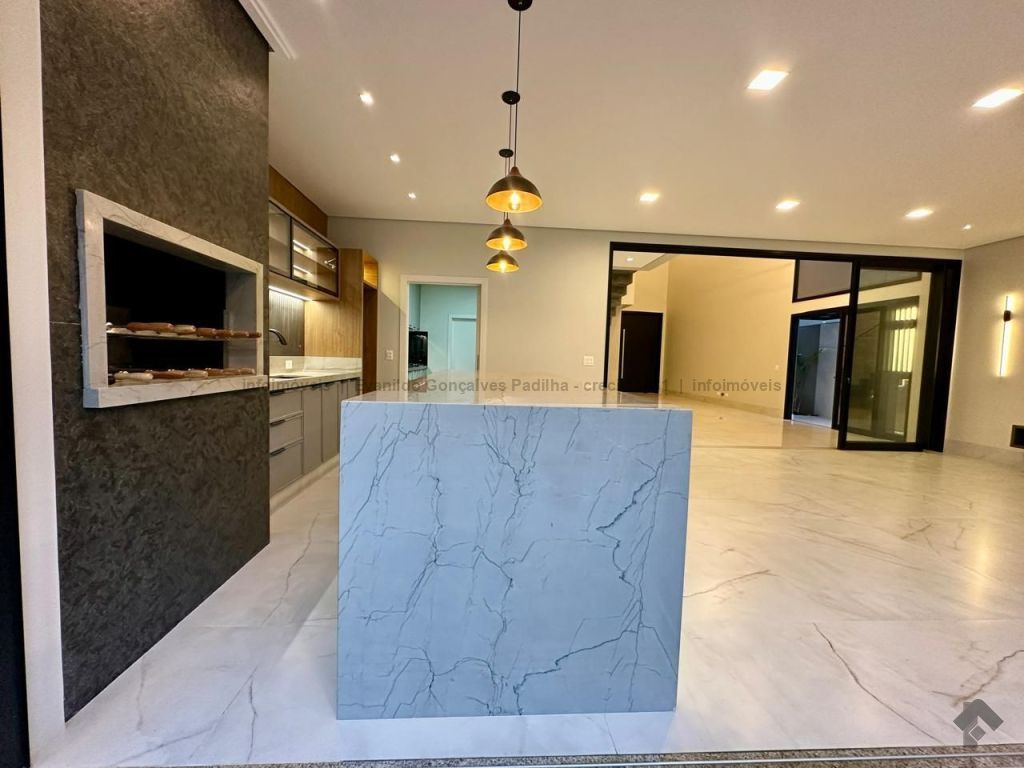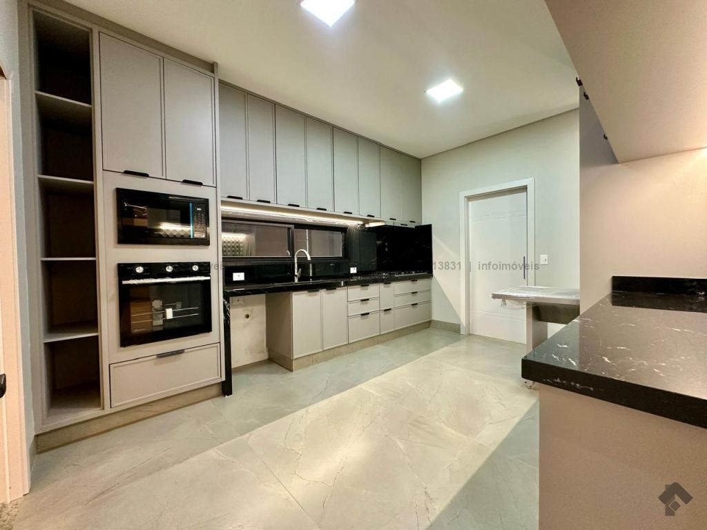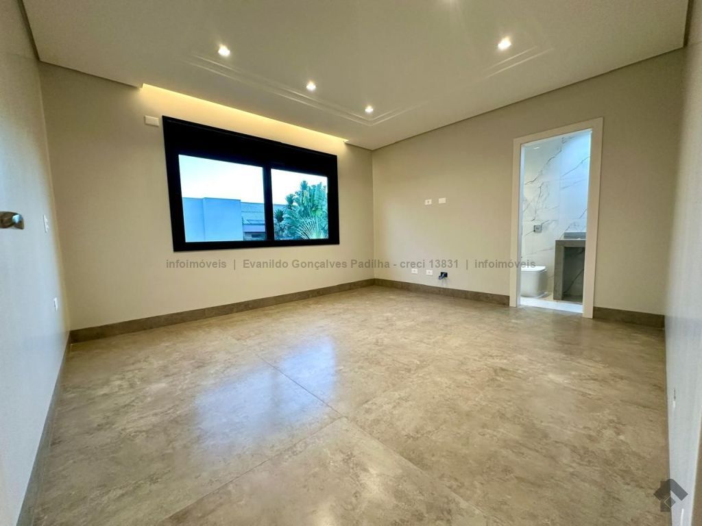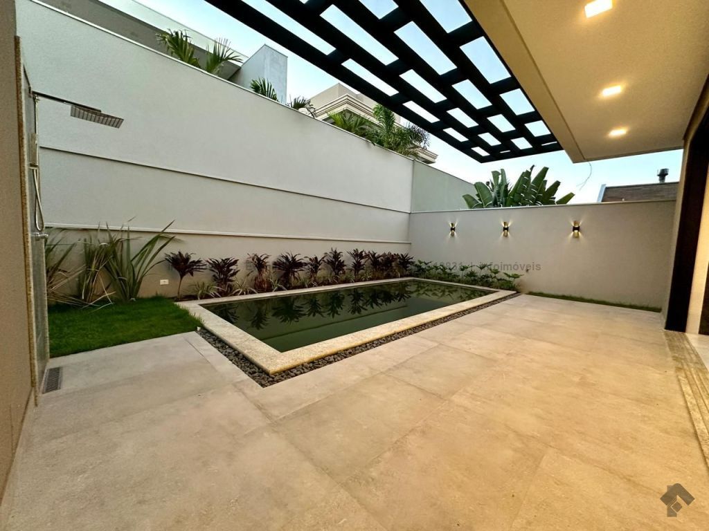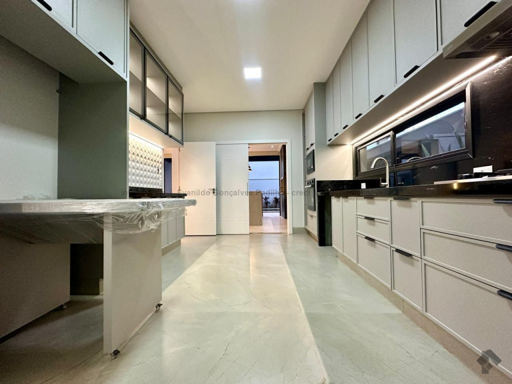 Sala ampla para até 3 ambientes, lavabo, pé direito alto, sanca e lustre. Escadaria toda em mármore e retroiluminada. Cozinha toda montada, repleta de armários planejados, micro-ondas, forno, cooktop e coifa. Espaço gourmet bem amplo e todo planejado, ilha em mármore e retroiluminada, com pêndulos e painel de TV. Piscina com hidro e aquecida, medindo 18 m². Lavabo e ducha na área externa. Energia fotovoltaica. 4 suítes amplas, sendo a principal uma suíte master com closet, banheira de hidromassagem e sacada, e uma das suítes na parte inferior, podendo ser escritório. Sala íntima no piso superior.